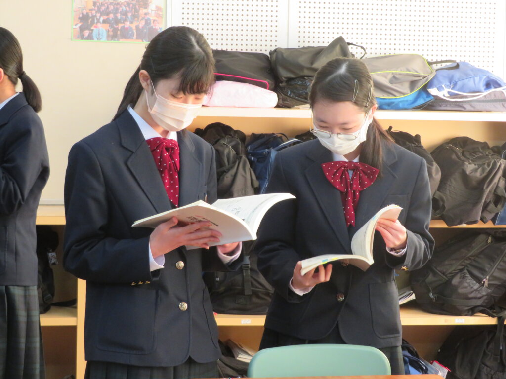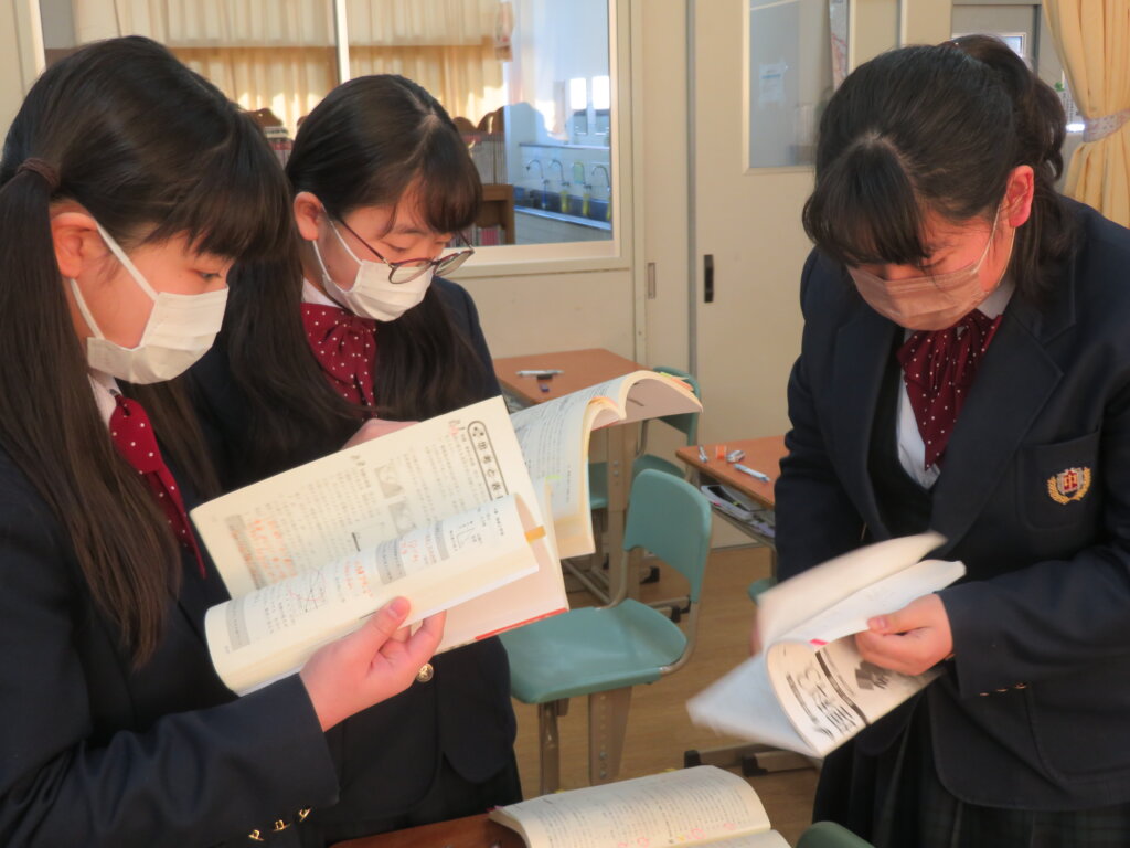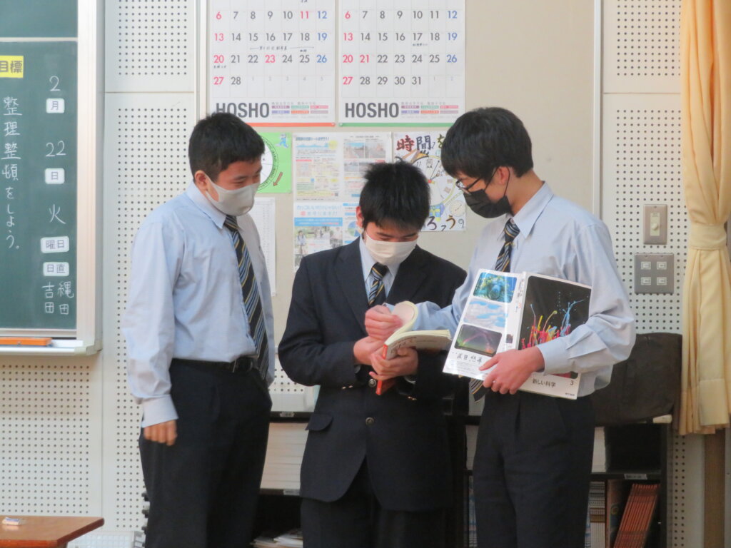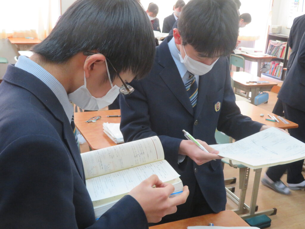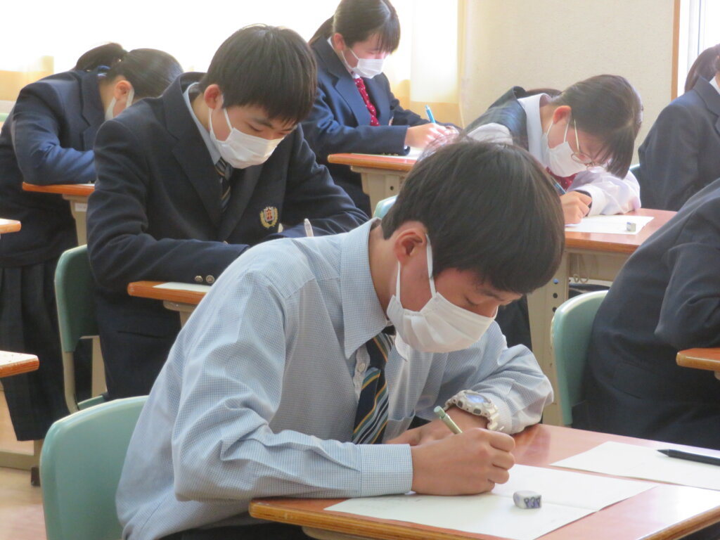 休み時間の様子です。黙々と自分でまとめたノートを確認する姿や、時間ぎりぎりまで友人たち同士で問題を出し合ったりする姿が各クラスで見られました。