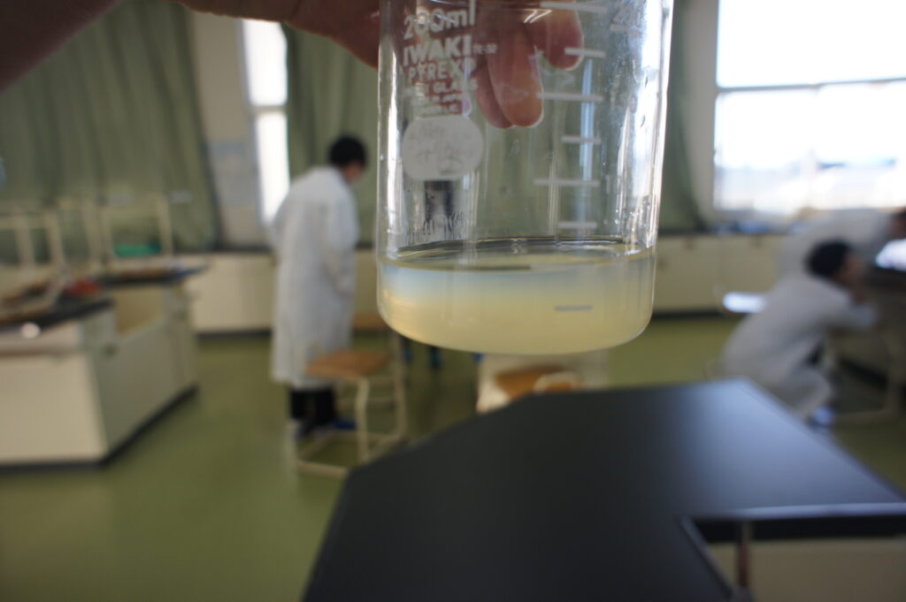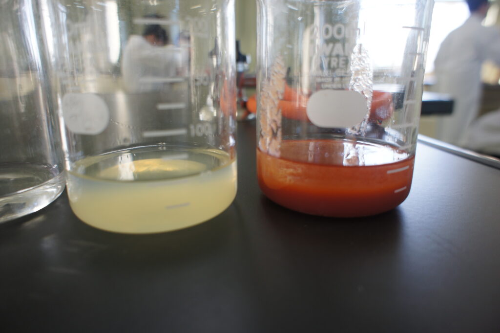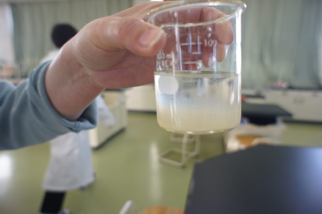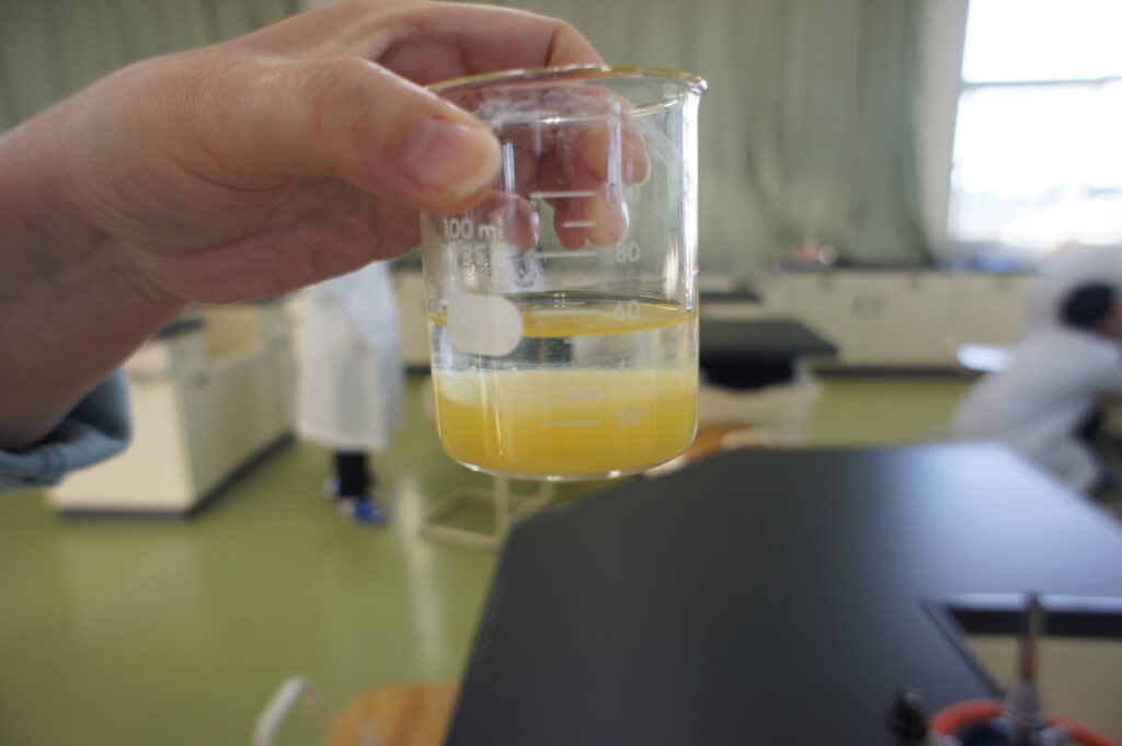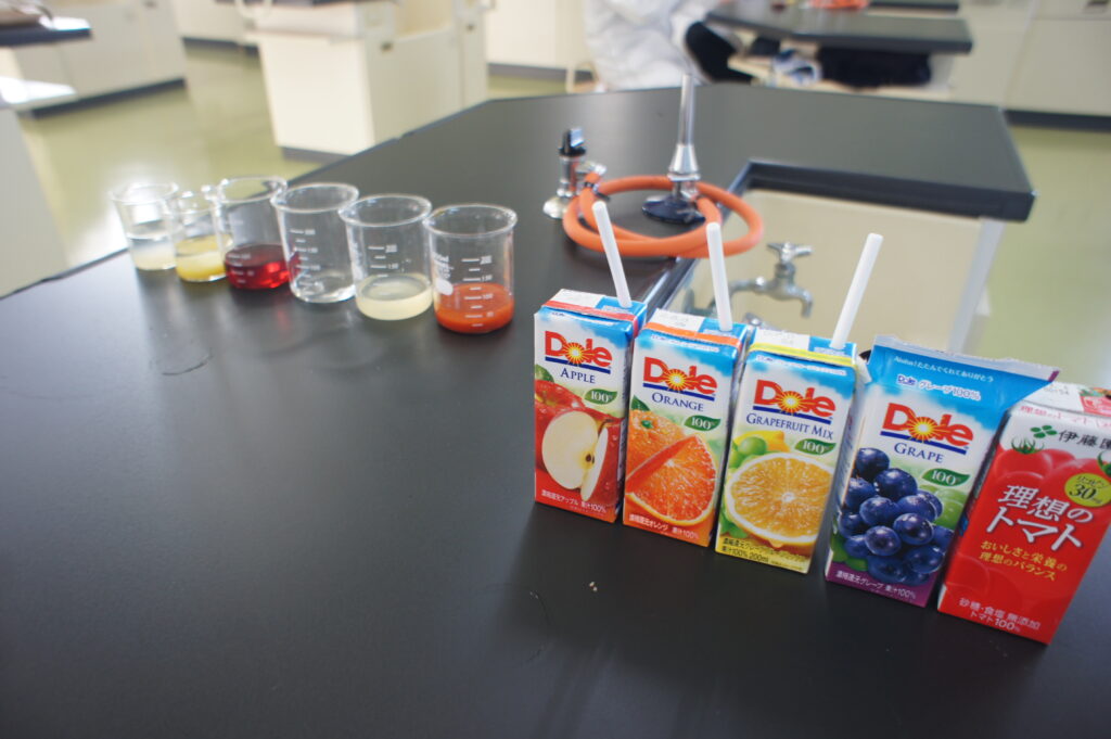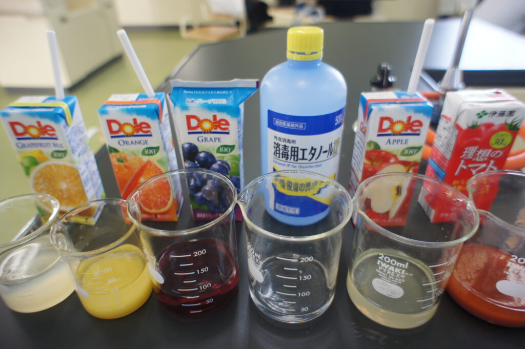 ジュースにエタノールを加えてDNAの本体を取り出して観察する実験をしました。グレープフルーツジュースが特にわかりやすかったそうです!