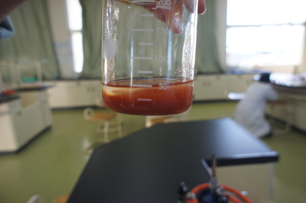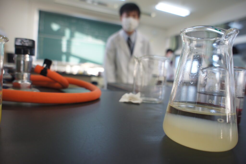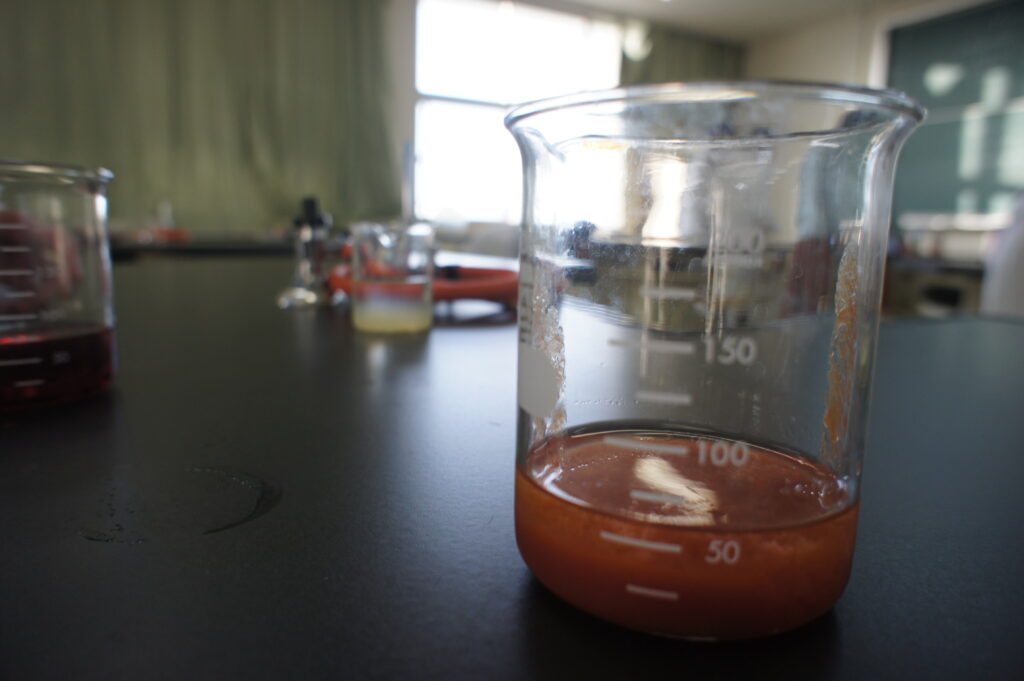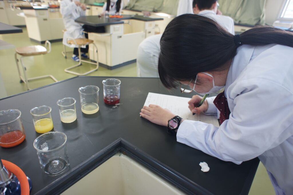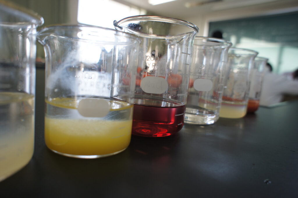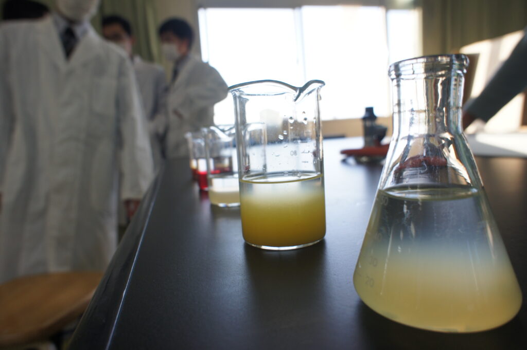 ジュースにエタノールを加えてDNAの本体を取り出して観察する実験をしました。グレープフルーツジュースが特にわかりやすかったそうです!
