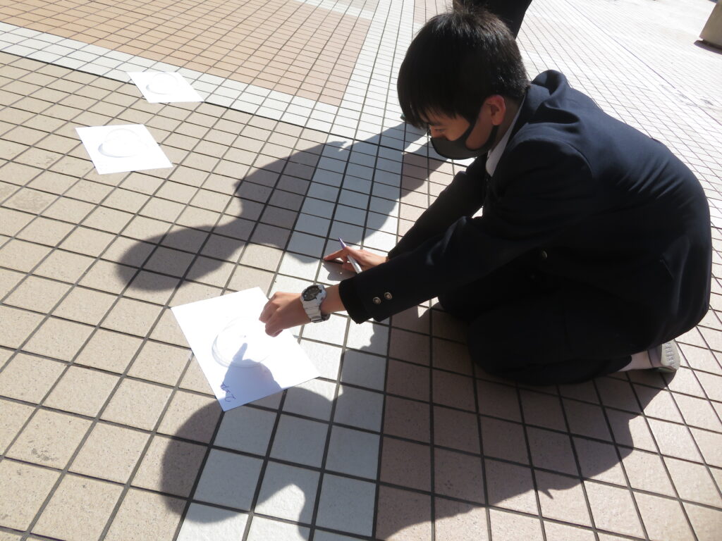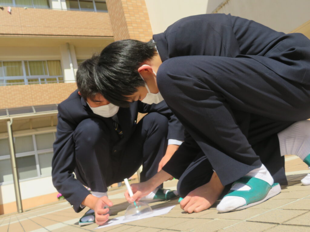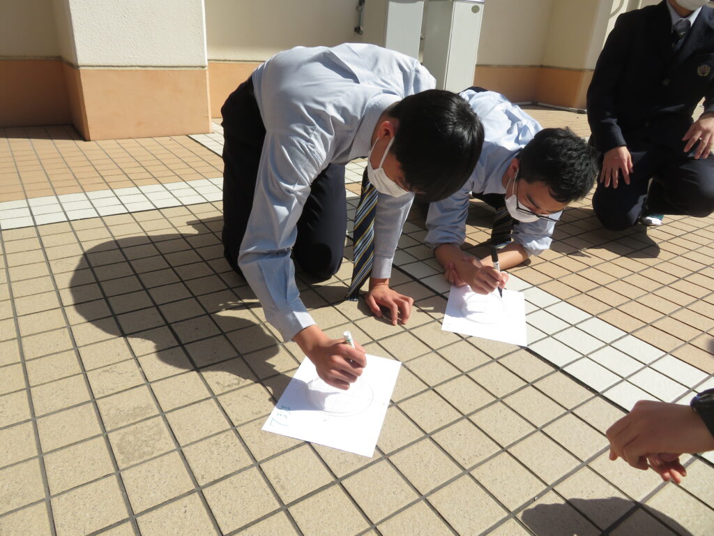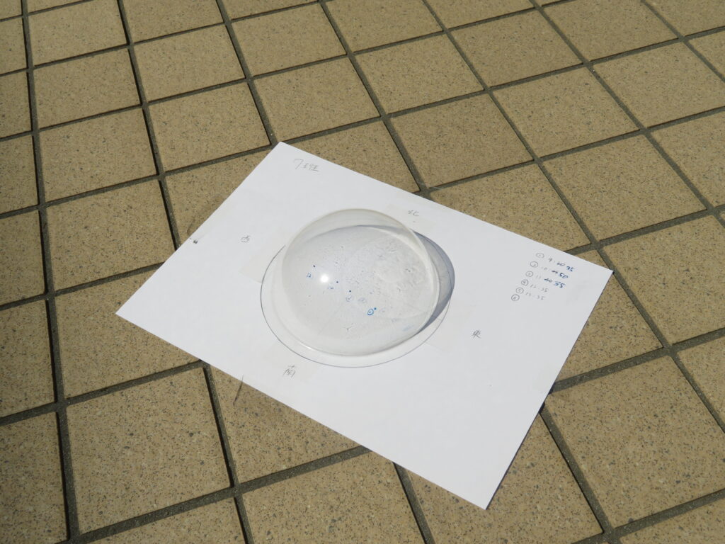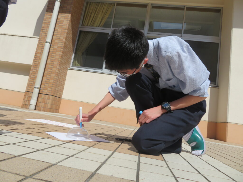 小学校の時に学習した「太陽の通り道」に関する内容を深めた「太陽が一日にどのように動いていくのか(速さの変化や通る道筋)」を、透明半球を使って中庭で実験をしました。