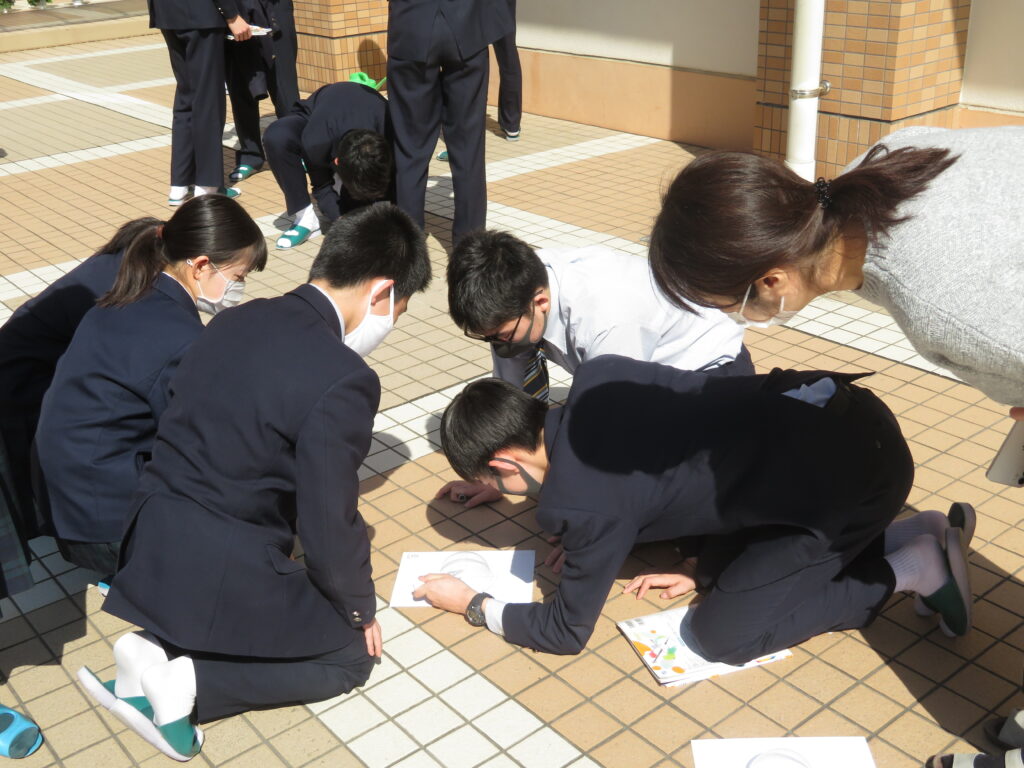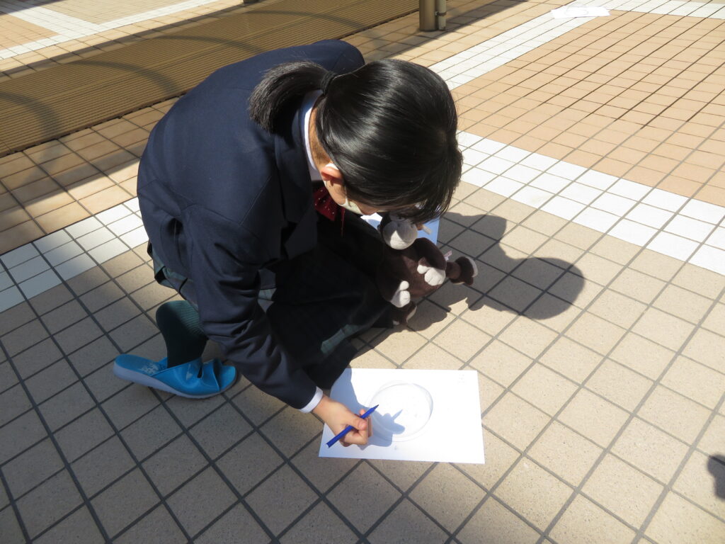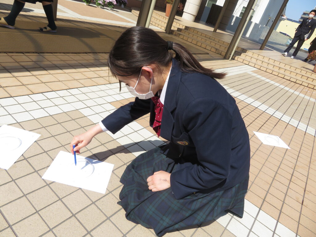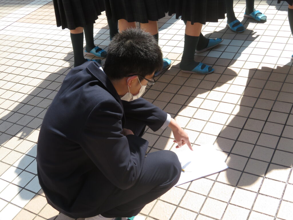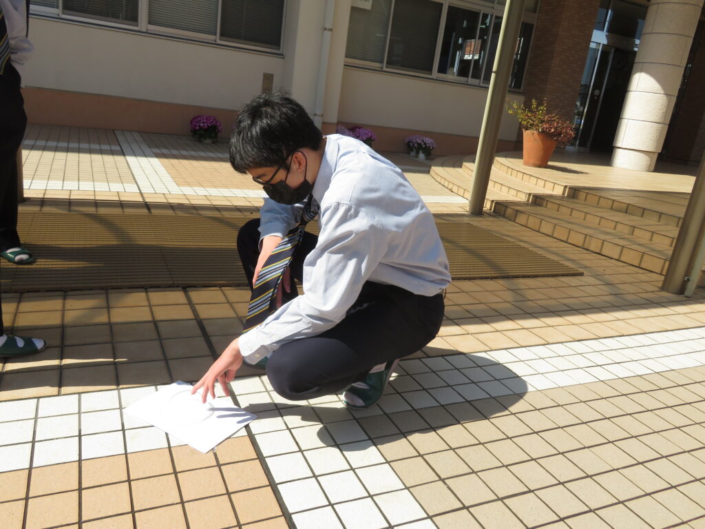 小学校の時に学習した「太陽の通り道」に関する内容を深めた「太陽が一日にどのように動いていくのか(速さの変化や通る道筋)」を、透明半球を使って中庭で実験をしました。