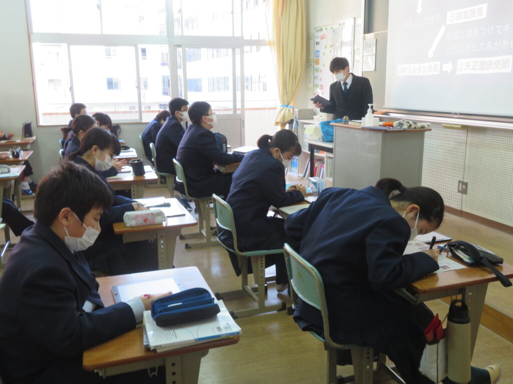 本日7限目、松熊隼先生(歴史)の研究授業がJ1Bにて行われました。ヨーロッパ人との出会いと全国統一の単元を学習しました。 歴史 松熊 隼先生 明日は、前日表彰が行われます。女子生徒は、緑のソックスを準備しましょう。
