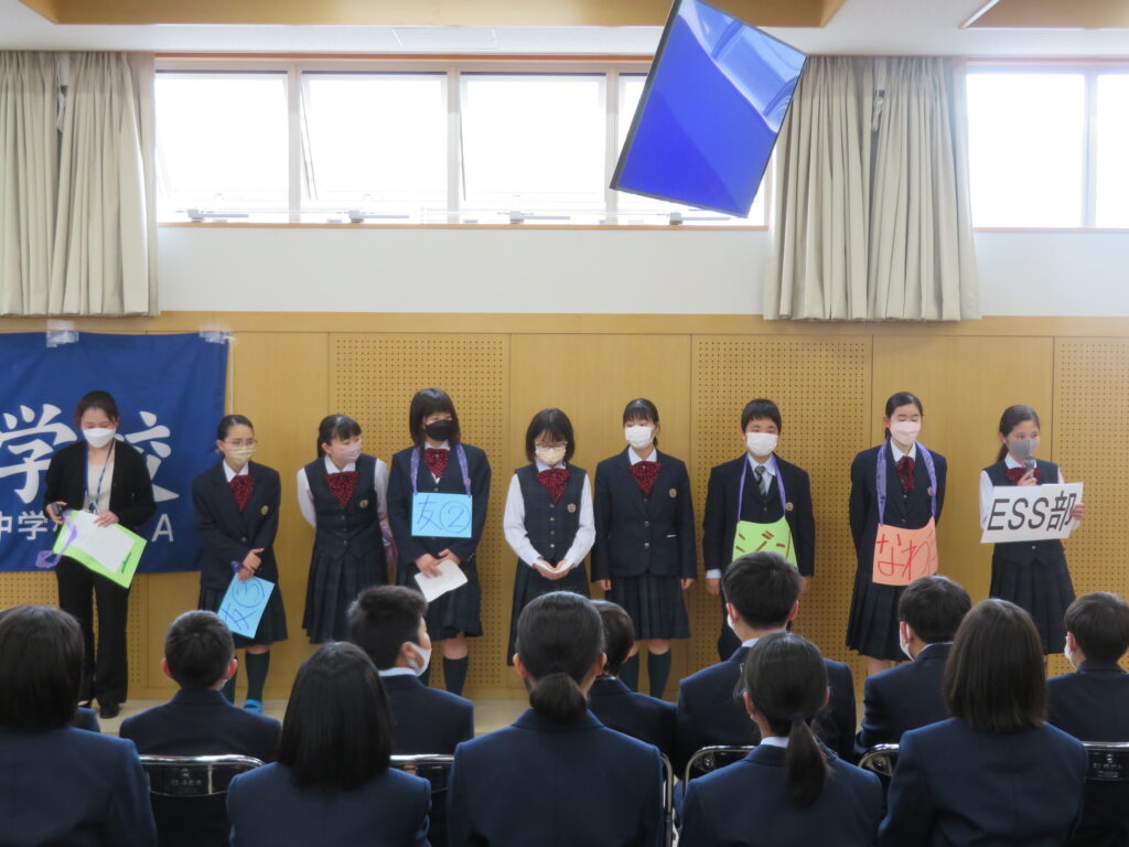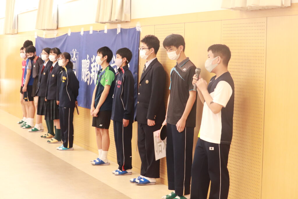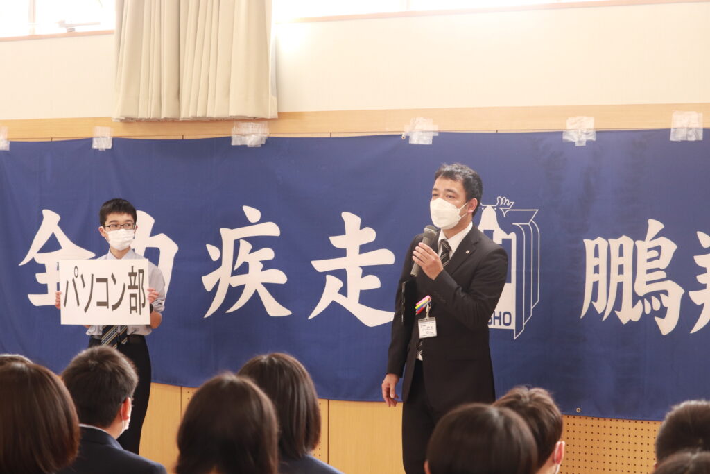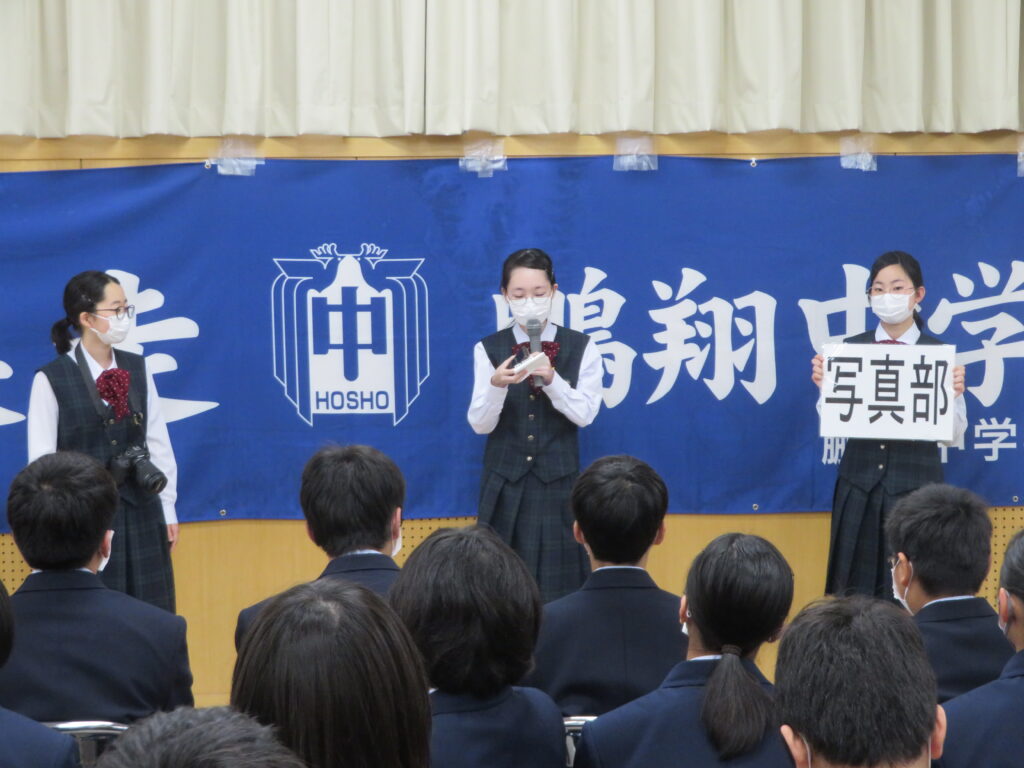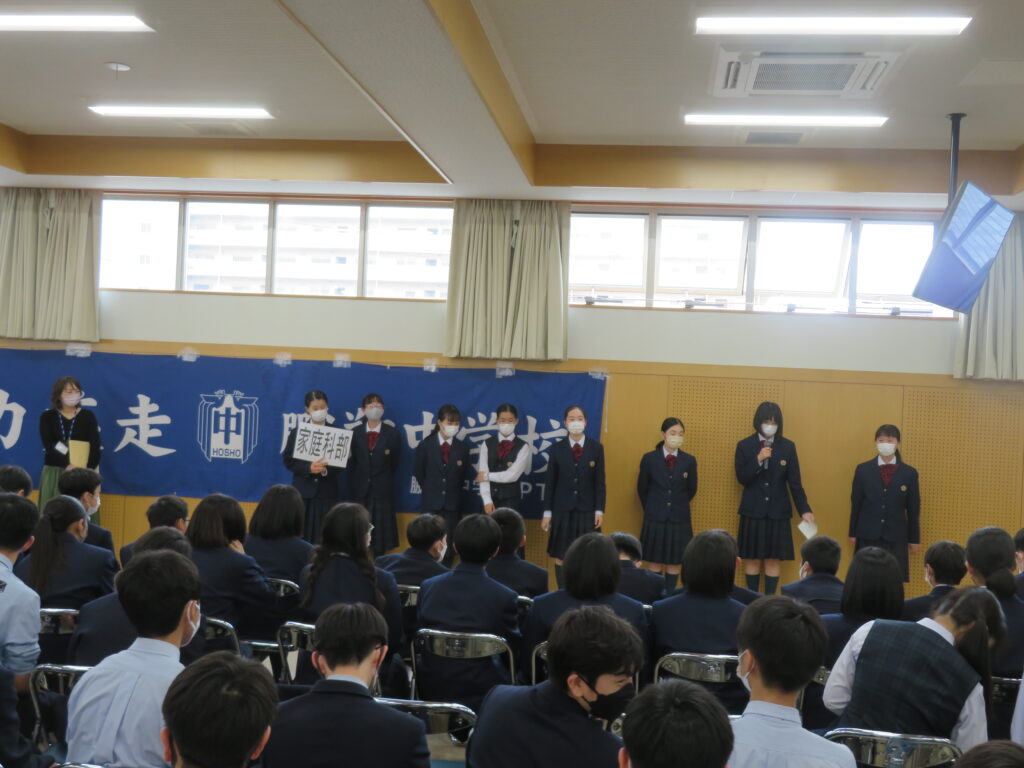 J1生は、今日の部活動紹介を見たうえで、宿泊研修後、2回の体験部活動を経て、正式な入部という流れになります。J2・J3生も中体連や文化発表会に向け、取組む姿勢がより強くなる時期です。鵬翔ファミリー一致団結し、精一杯頑張りましょう。最後になりましたが、生徒会のみなさん、企画運営ありがとうございました。