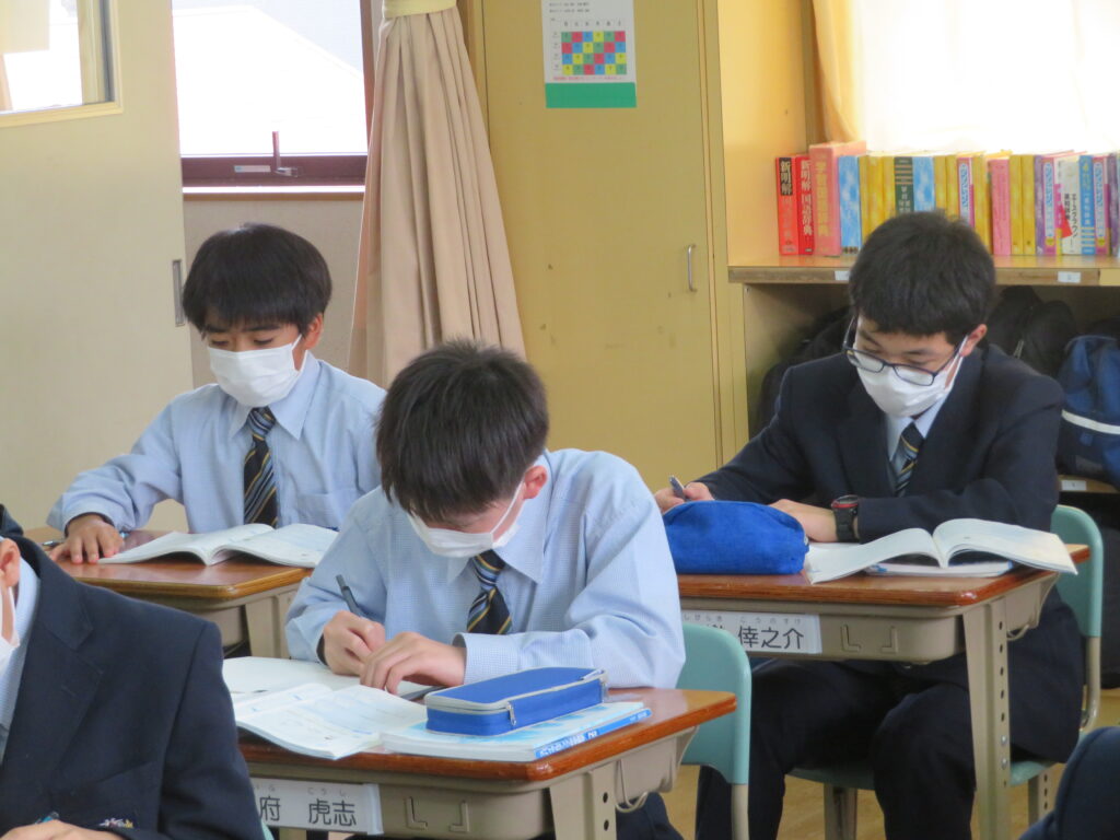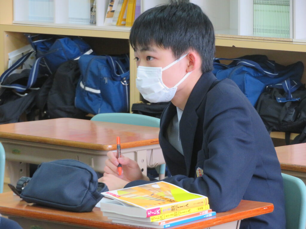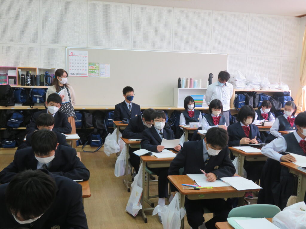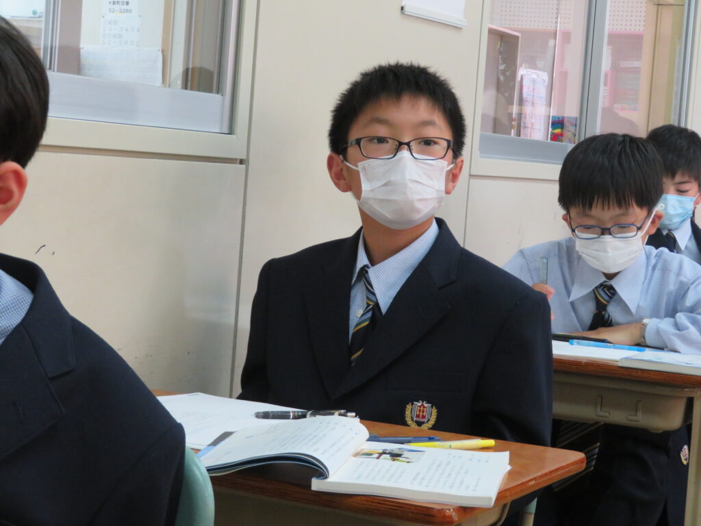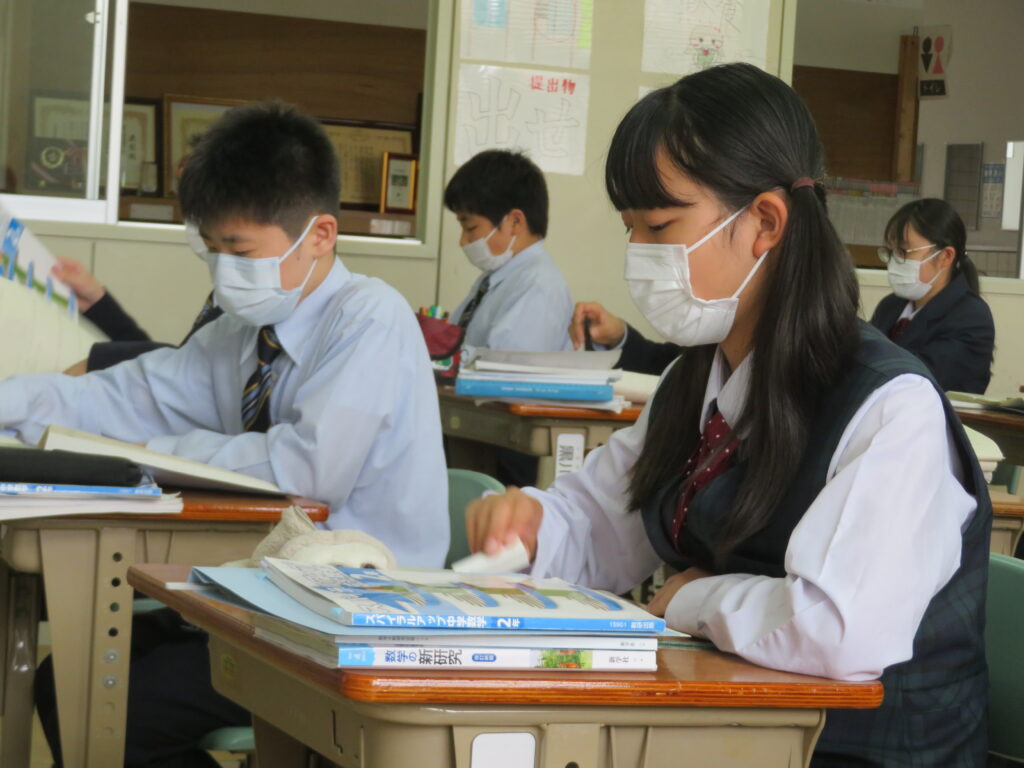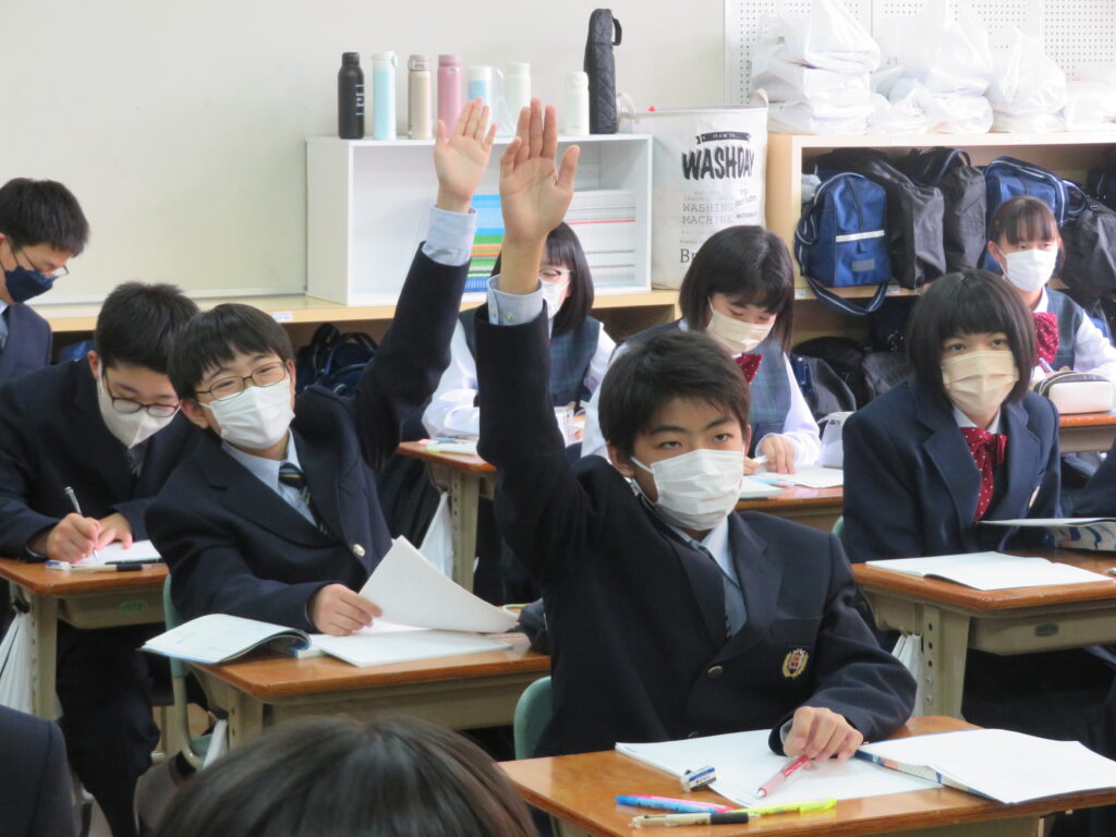 本日は、授業の様子を紹介します。J1生は、各教科ごとに教科書などが配付され、中学校での授業が本格的にスタートしました。緊張しているのかな?と思い教室を覗いてみると、先生の質問に対し積極的に手を挙げ発言をしている姿が見られました!