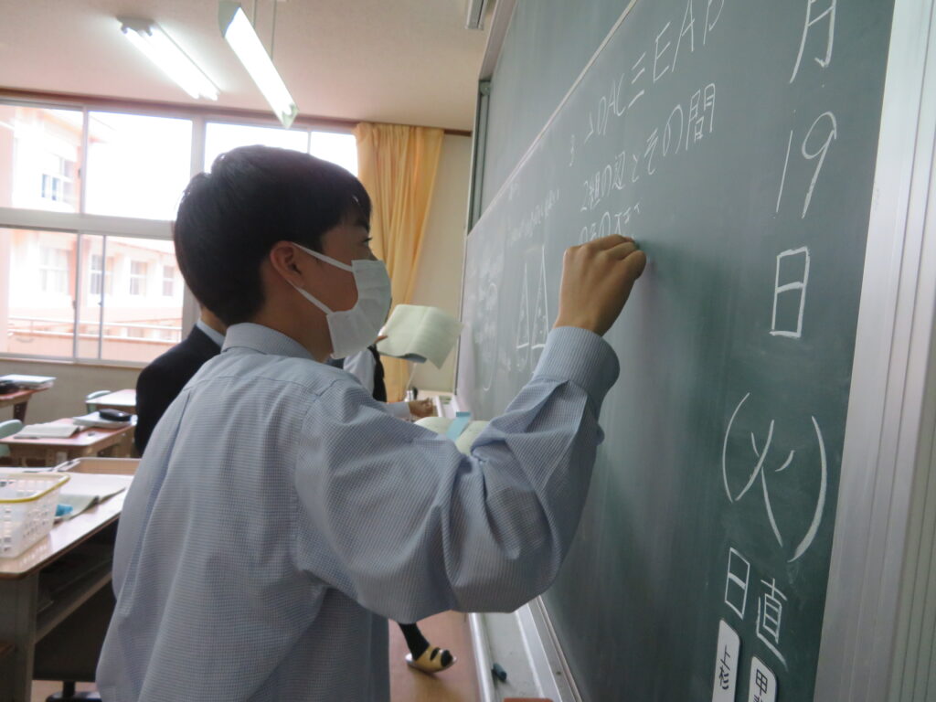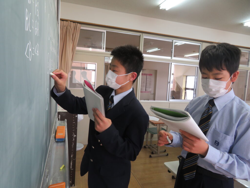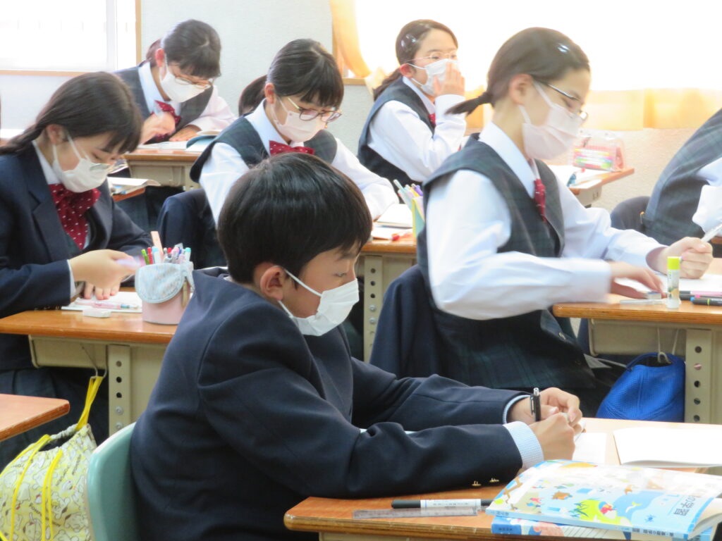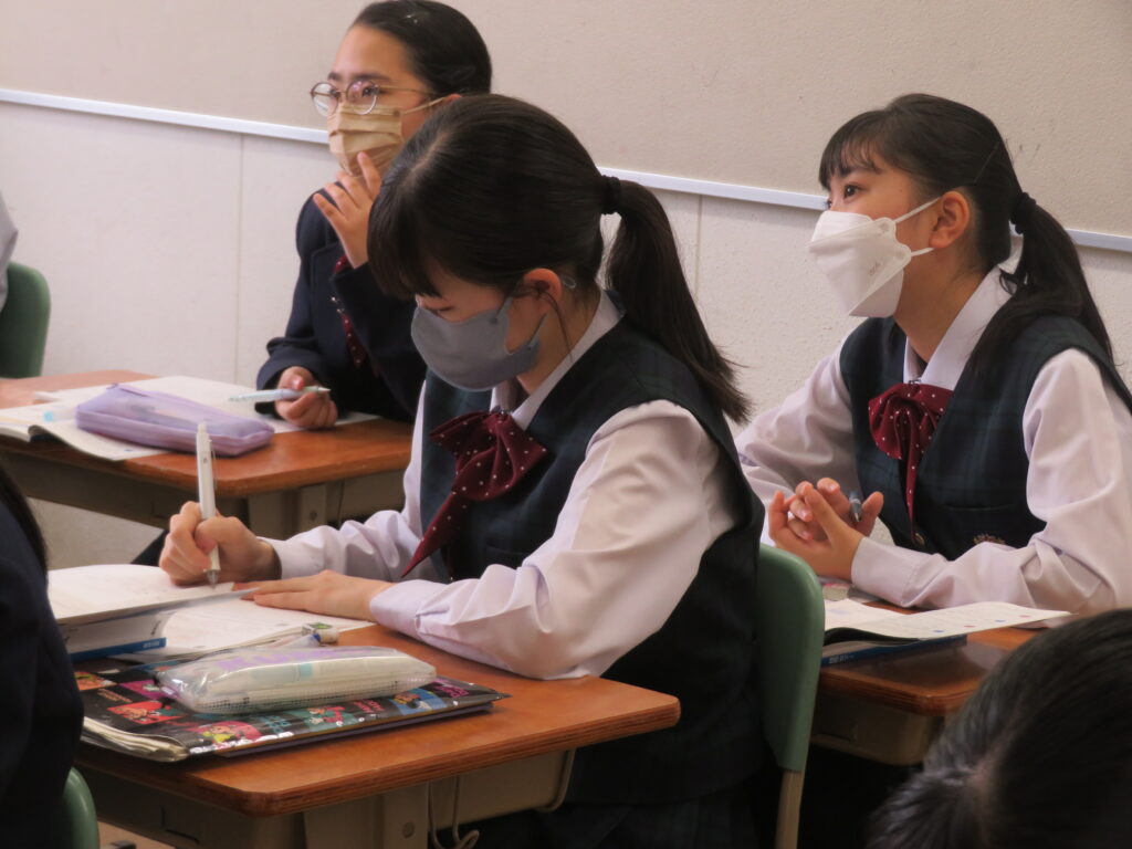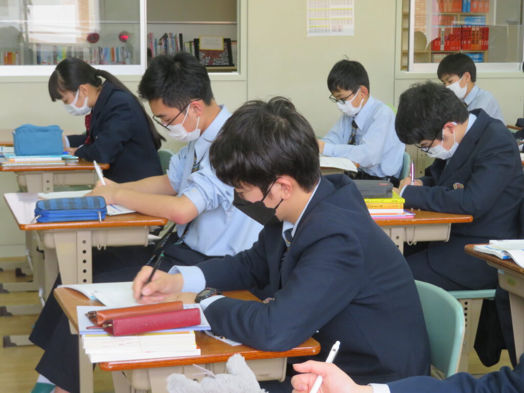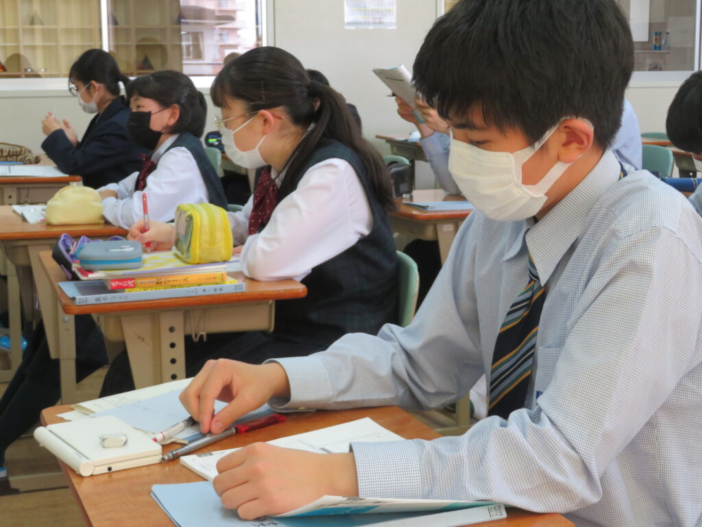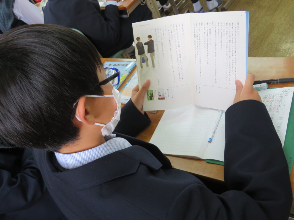 本日は、授業の様子を紹介します。J1生は、各教科ごとに教科書などが配付され、中学校での授業が本格的にスタートしました。緊張しているのかな?と思い教室を覗いてみると、先生の質問に対し積極的に手を挙げ発言をしている姿が見られました!