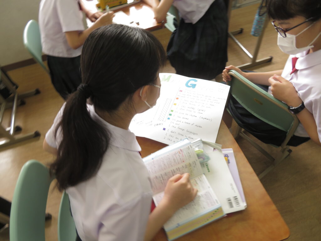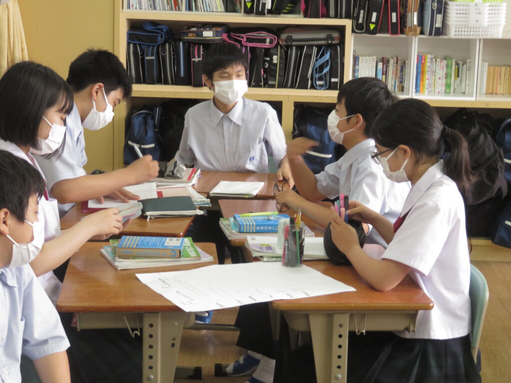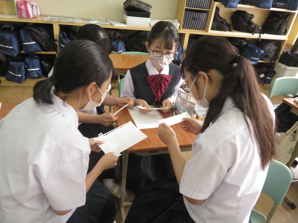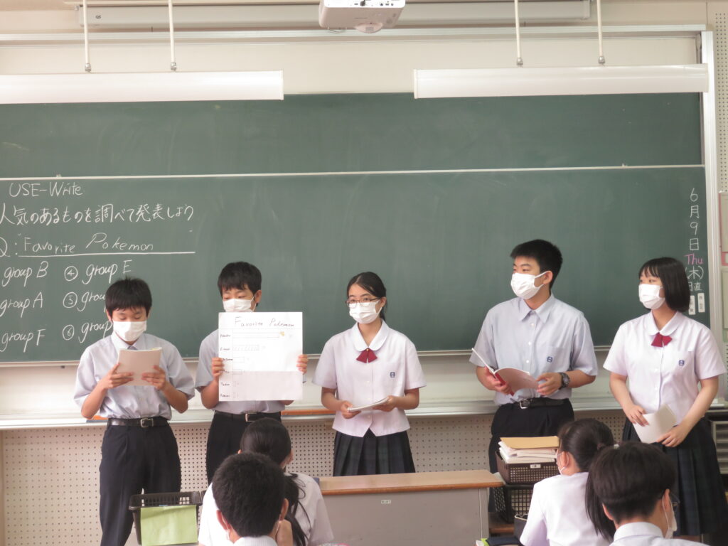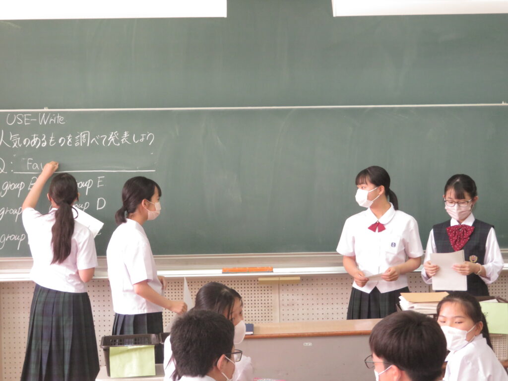 グループに分かれて調査するトピックを決め、2年生に調査を行いました。現在学習している比較の表現を用いて発表原稿を作成します。