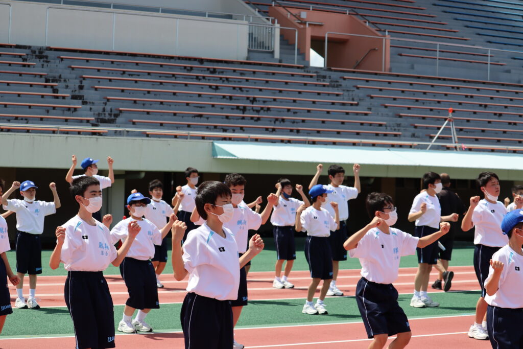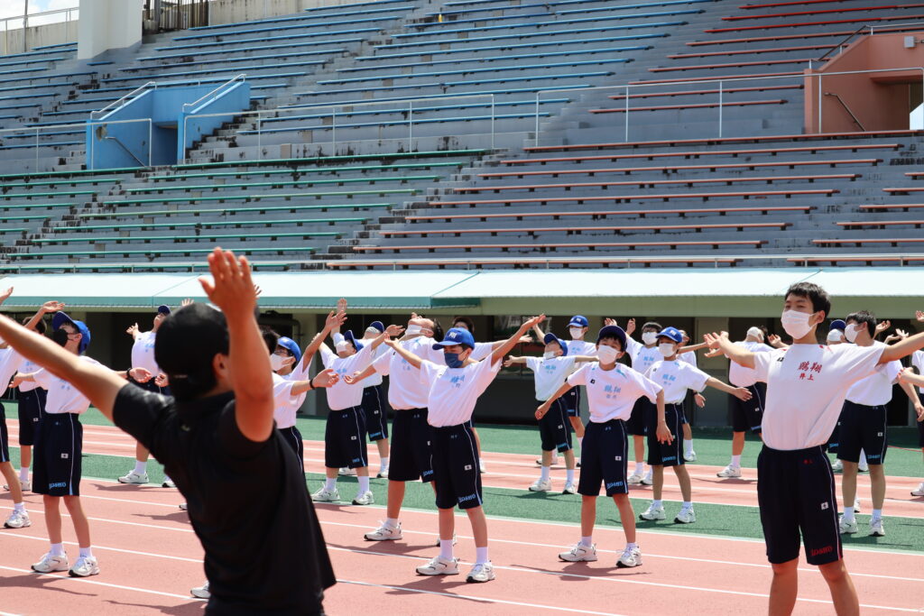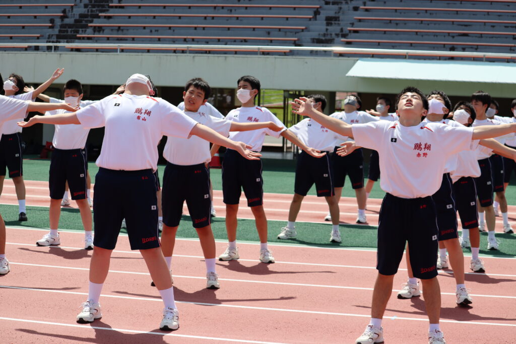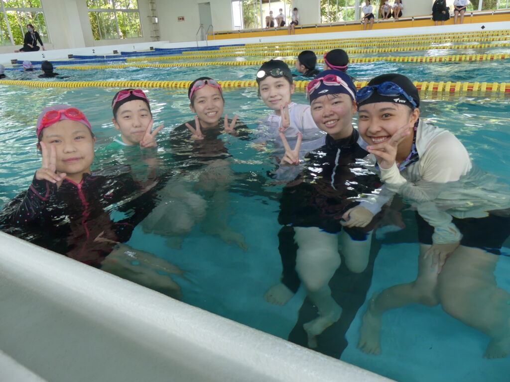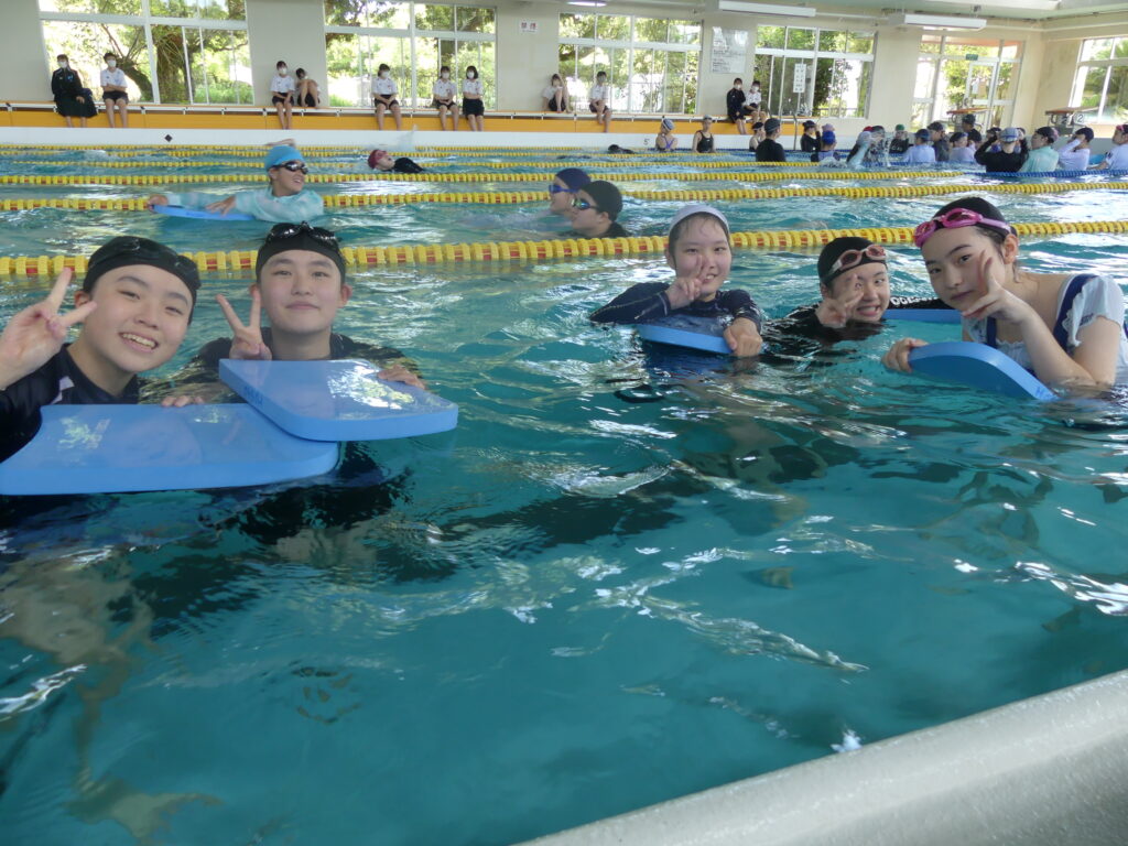 本日、水泳実習を行いました。今日は女子が運動公園内プール場にて水泳実習を行い、男子は陸上競技場で体育大会の練習を行いました。