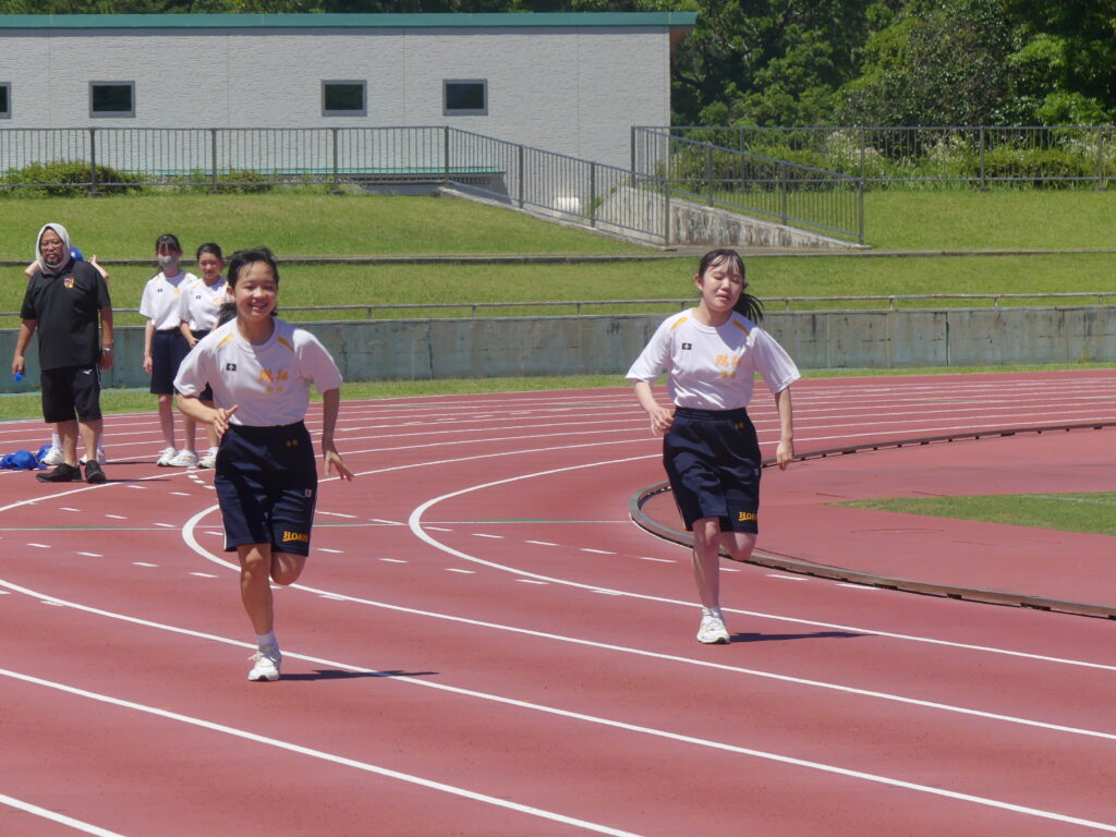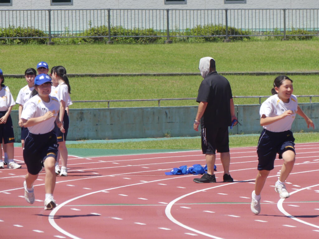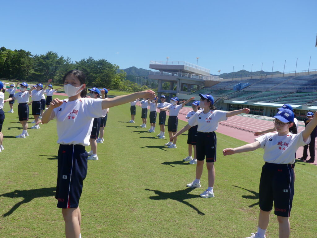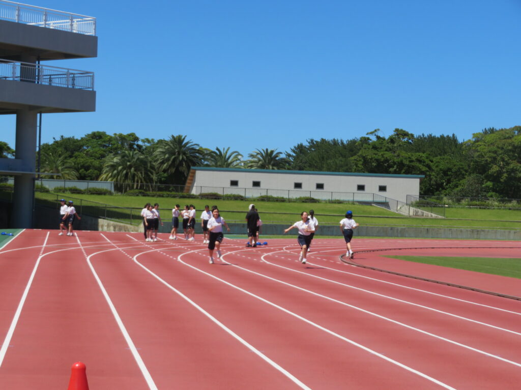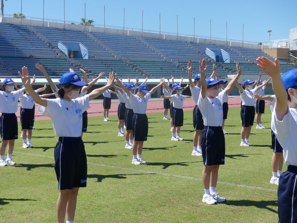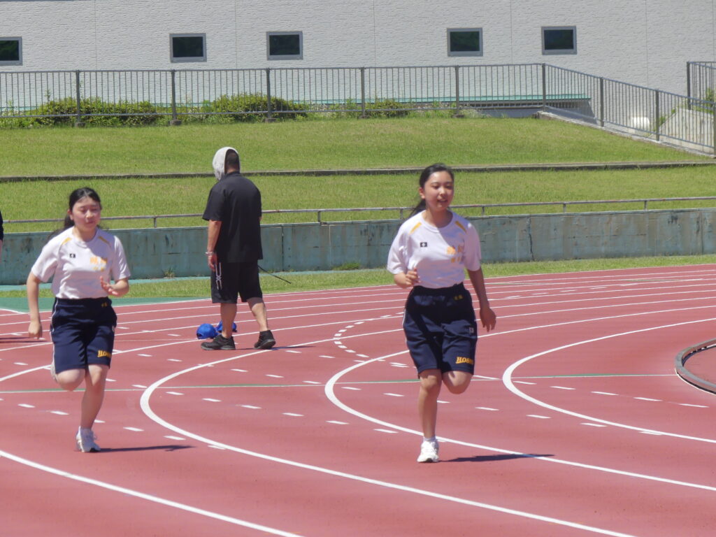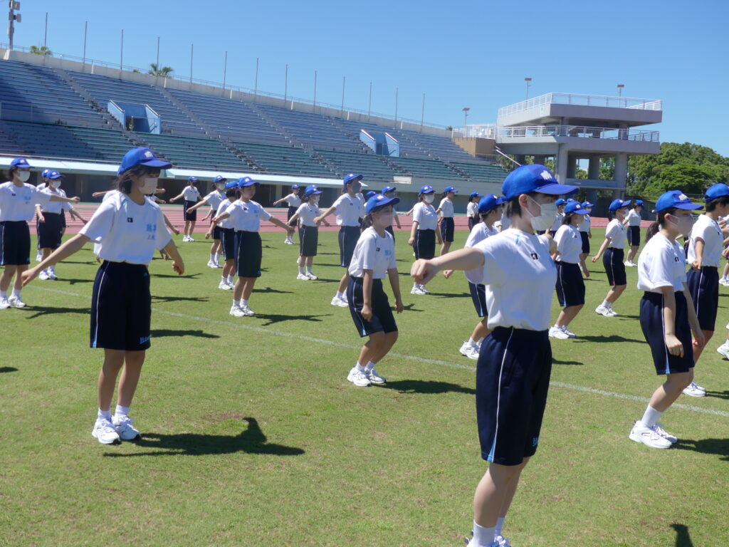 女子は陸上競技場で50m走のタイム測定、ラジオ体操を行いました。