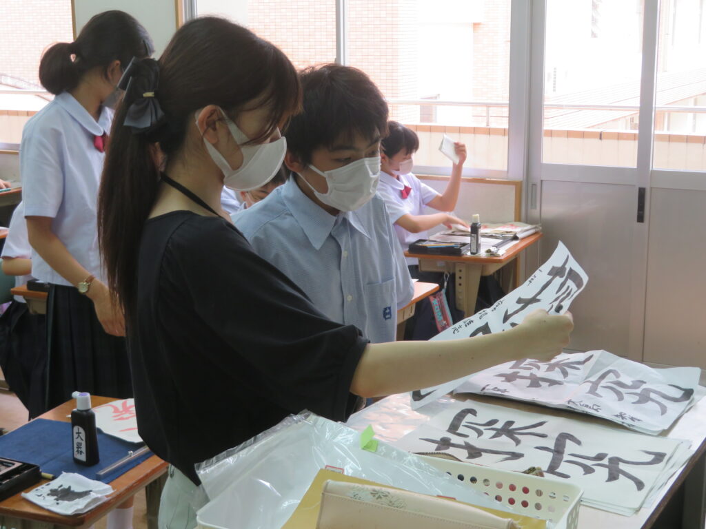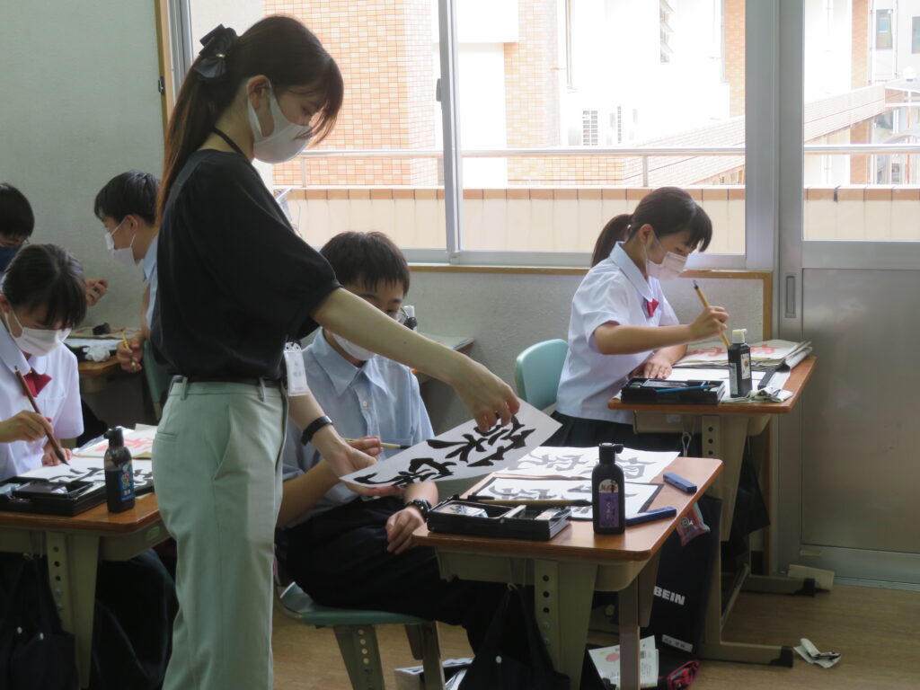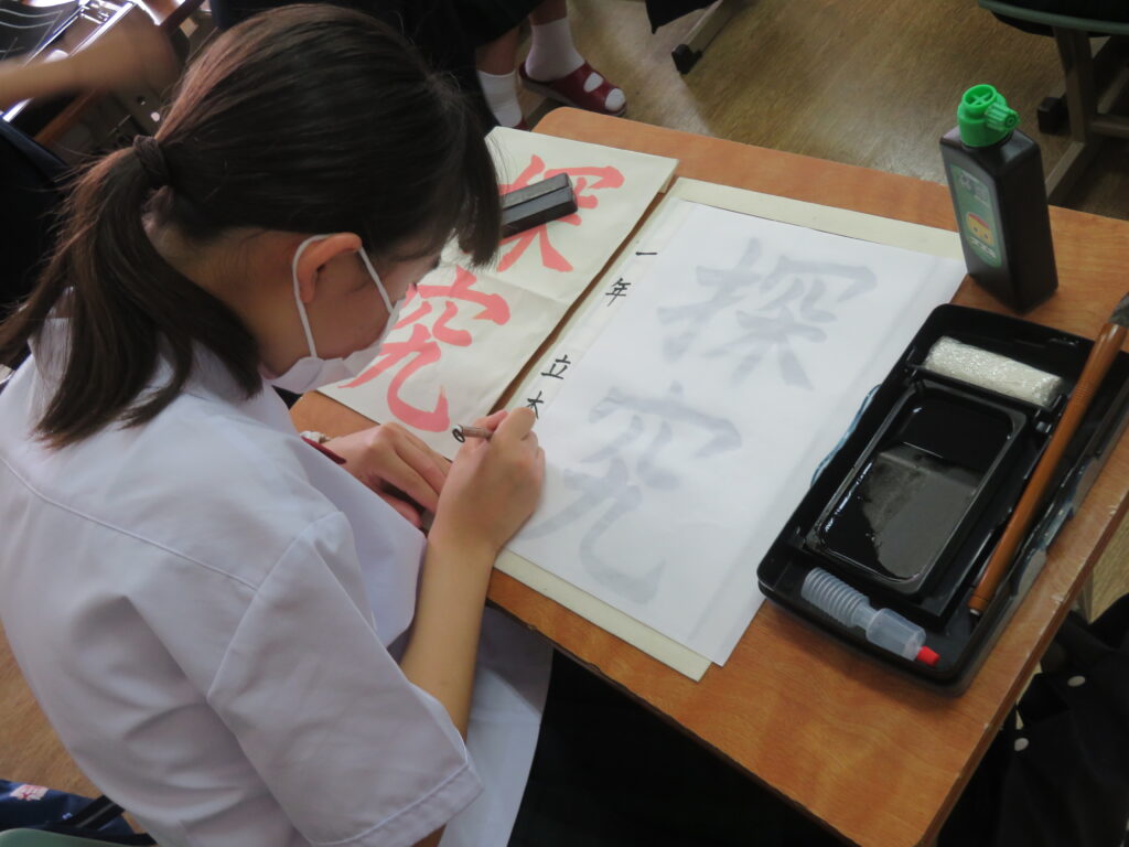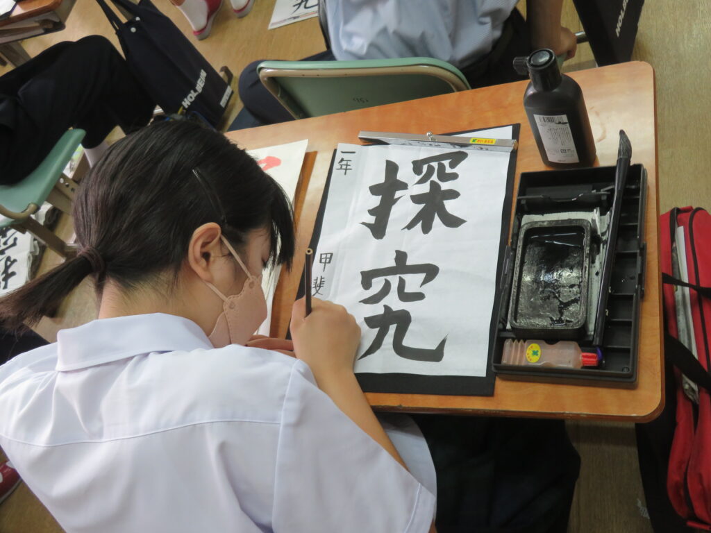 毎週火曜日の7限目、J1-Bは書道の時間です。今日は「探究」を書いていました。 中屋敷先生にアドバイスをもらいながら清書し、提出をしていました。 今回の作品は文化発表会の際、展示をします。楽しみにしていてください!