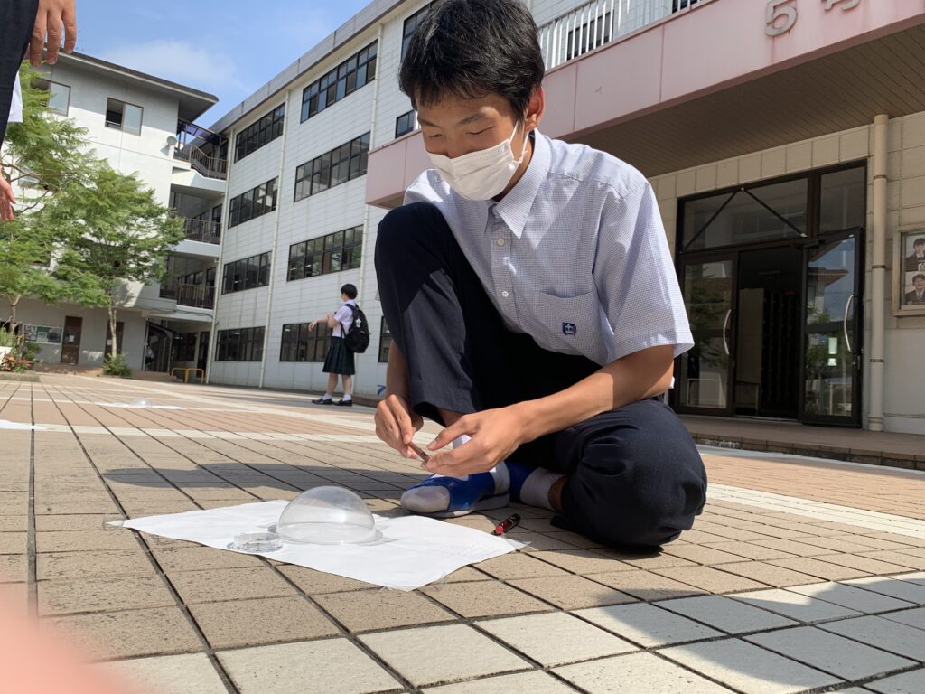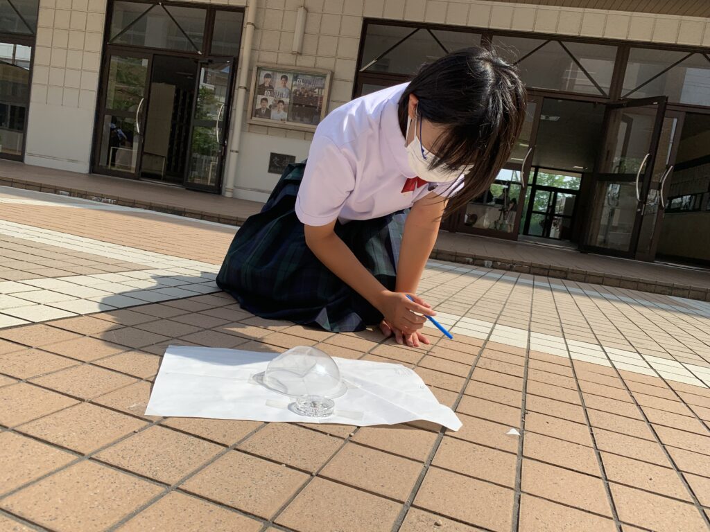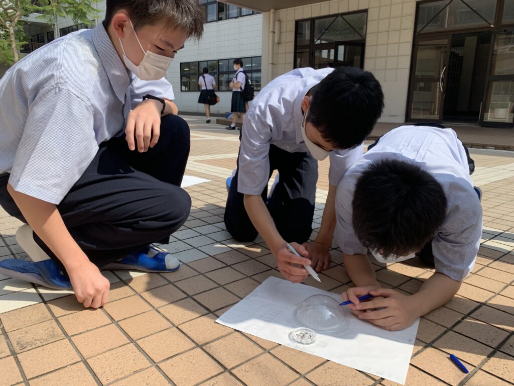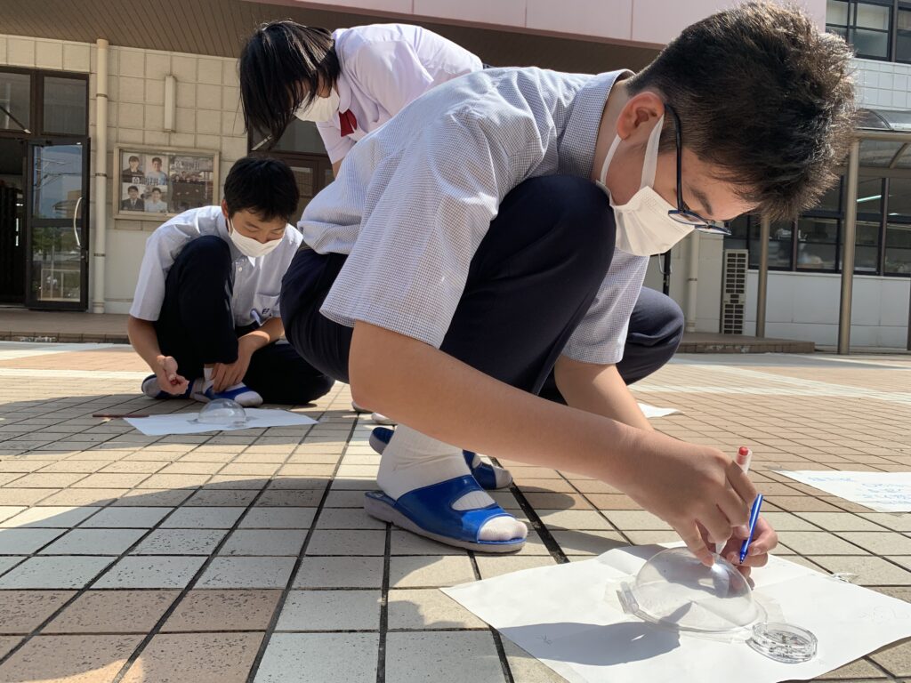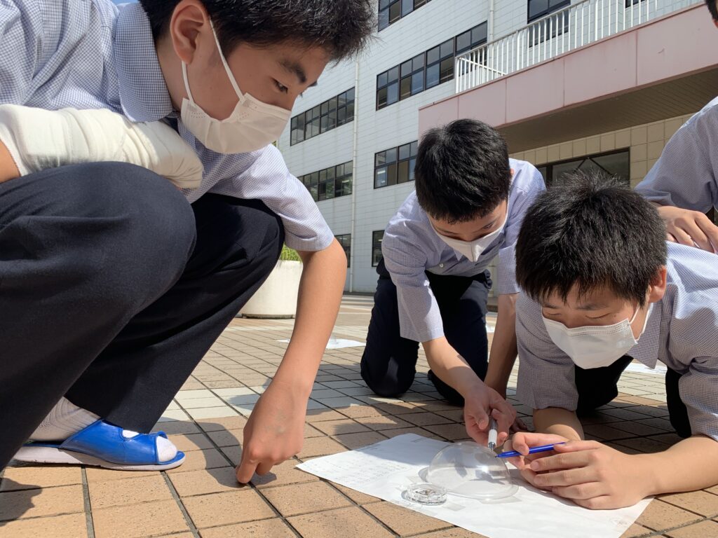 毎休み時間、中庭に降りて観測をしました。5限目の休み時間は曇っており、観測できない場面もありましたが、生徒たちは「実際に太陽の動きを見ることが出来て楽しかった」と教えてくれました。