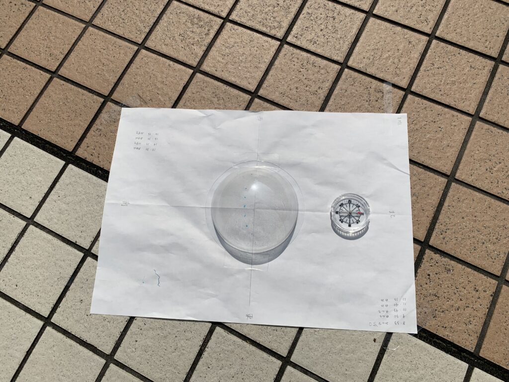 「太陽が一日にどのように動いていくのか(速さの変化や通る道筋)」を、透明半球を使い中庭で観測をしました。