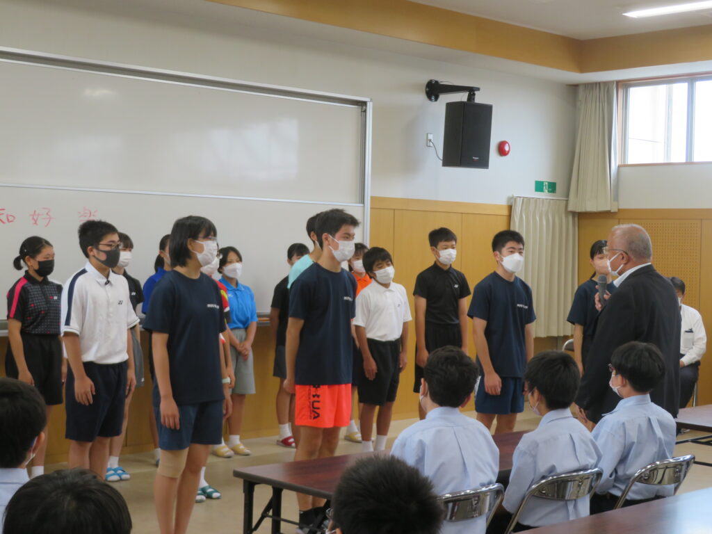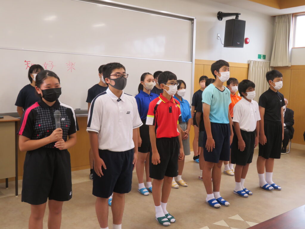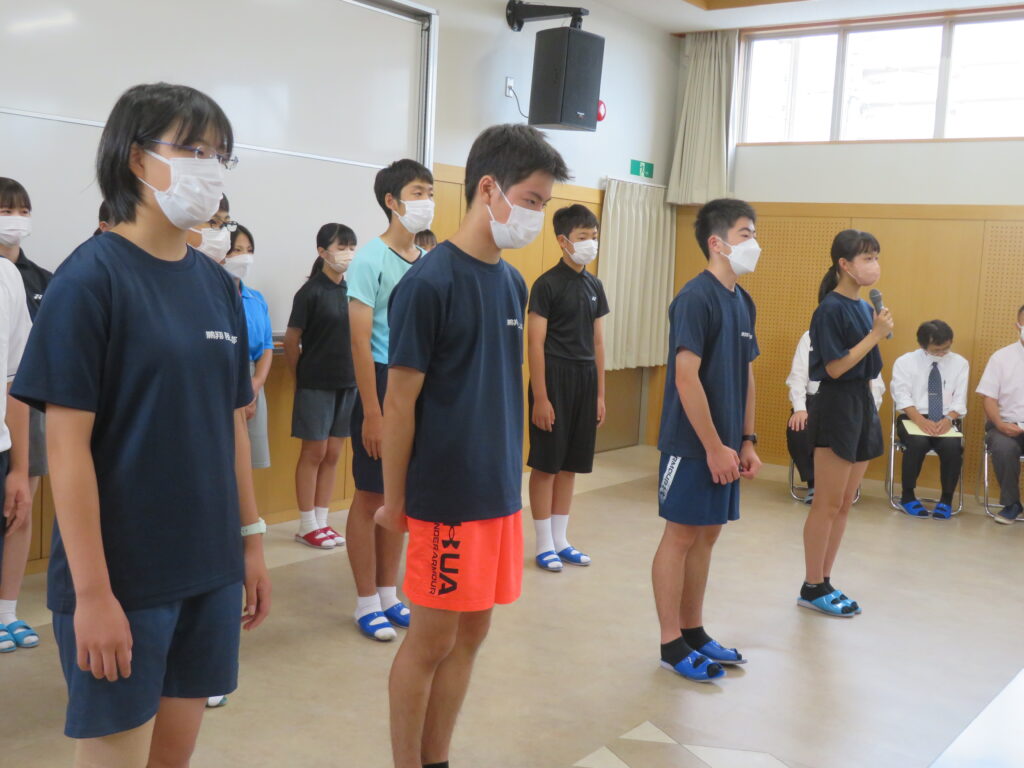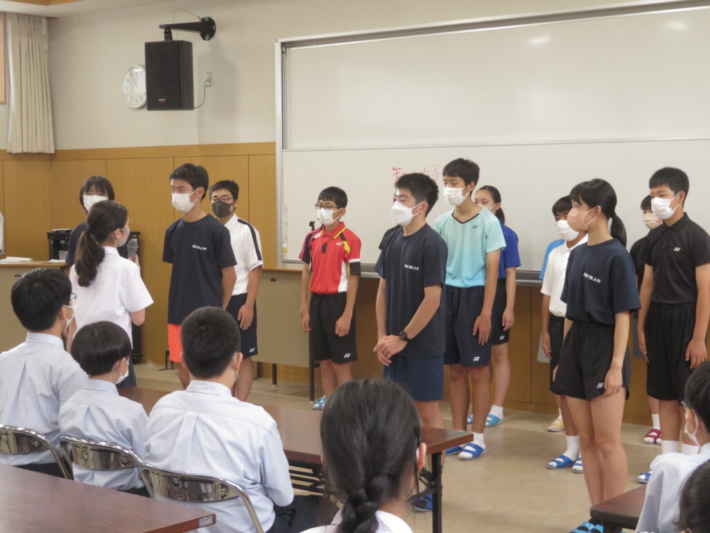 1学期終業式終了後、県大会壮行式が行われました。鵬翔中学校からは、硬式テニス部と陸上部が出場します。学校長と生徒会長J3-A篠原李和子さんより、激励の言葉をいただき、その後、各部主将より、大会への意気込み・抱負を述べてもらいました。