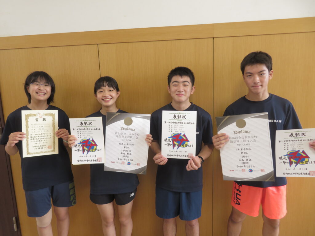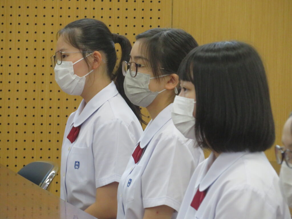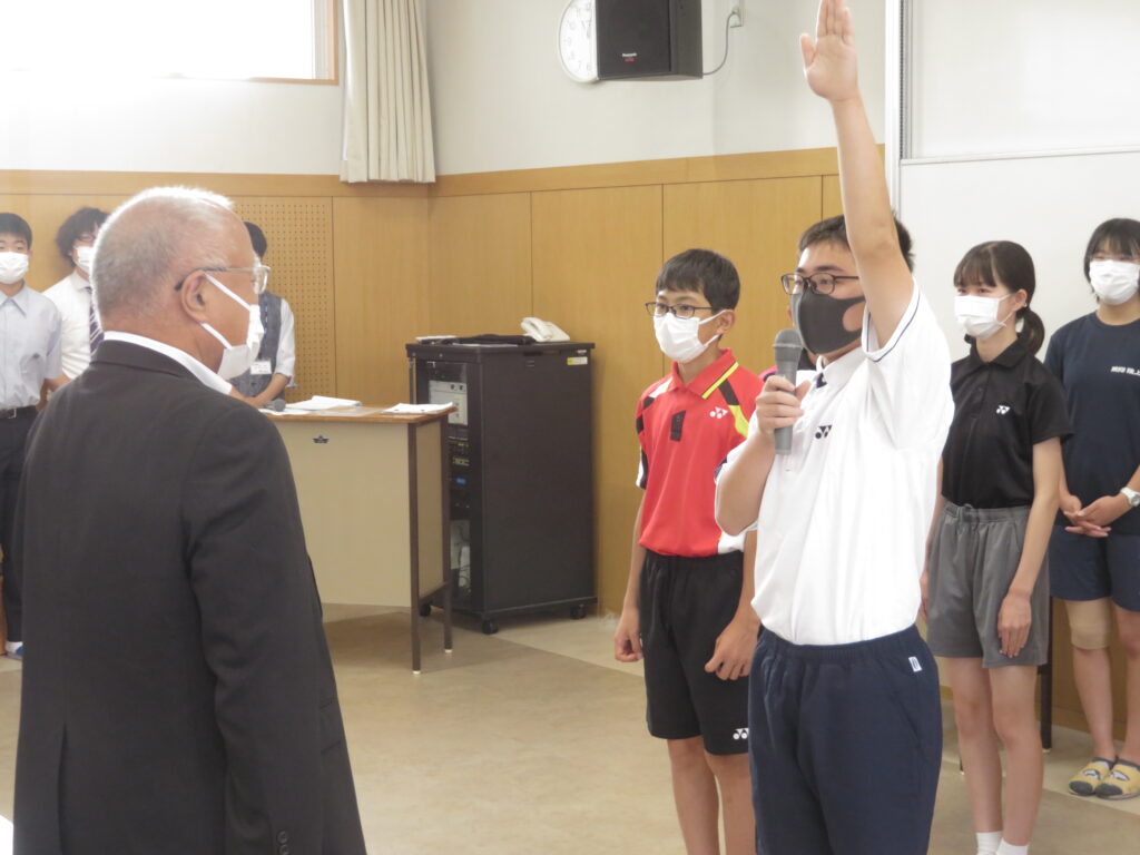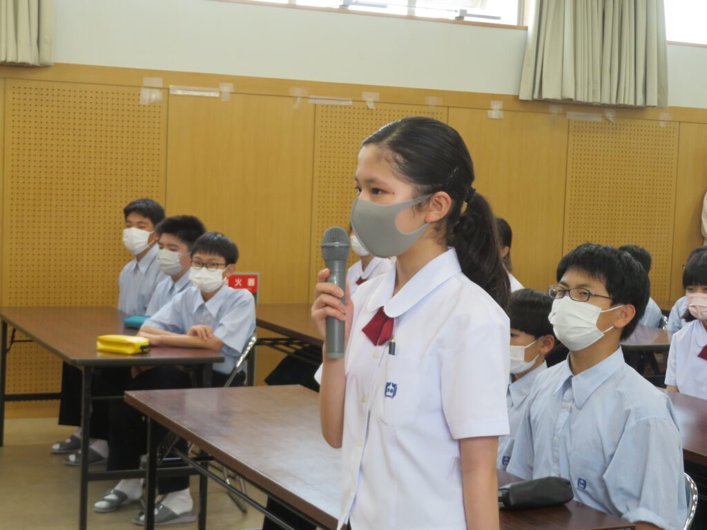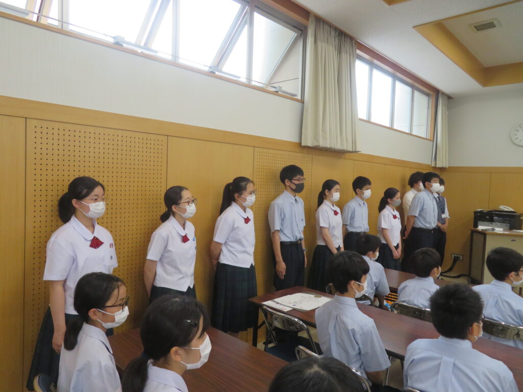 1学期終業式終了後、県大会壮行式が行われました。鵬翔中学校からは、硬式テニス部と陸上部が出場します。学校長と生徒会長J3-A篠原李和子さんより、激励の言葉をいただき、その後、各部主将より、大会への意気込み・抱負を述べてもらいました。