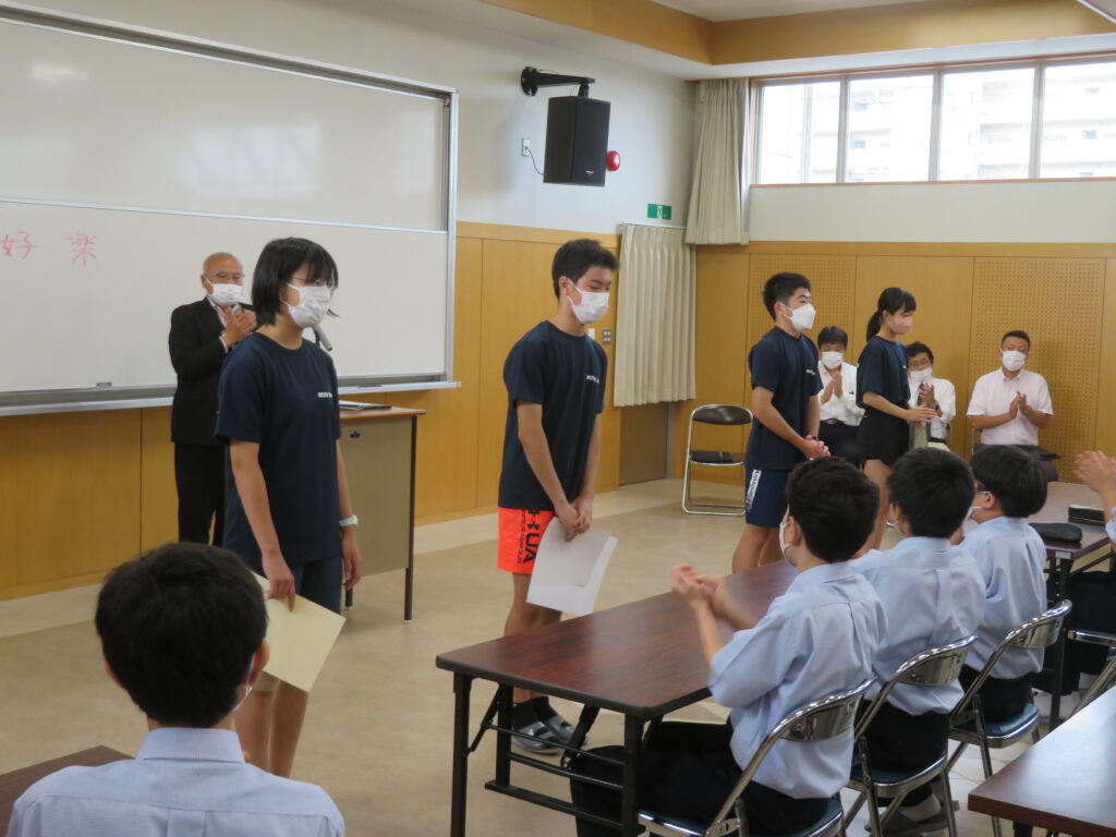 本日は、1学期終業式でした。学校長より、これから迎える夏休みに向け、「知・好・楽」を基にし、時間があるときだからこそ、勉強でも、読書でも、趣味でも、無我夢中に取り組んで欲しいという「身に着く極意」の話がありました。