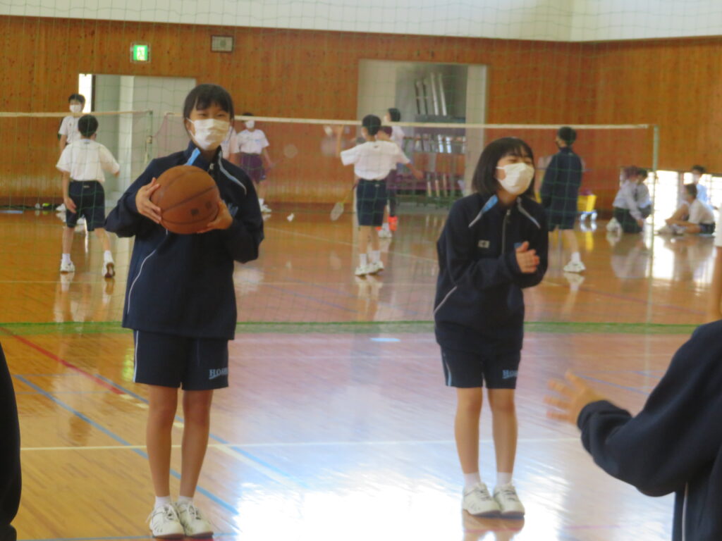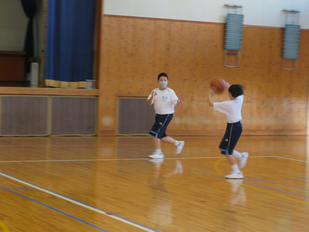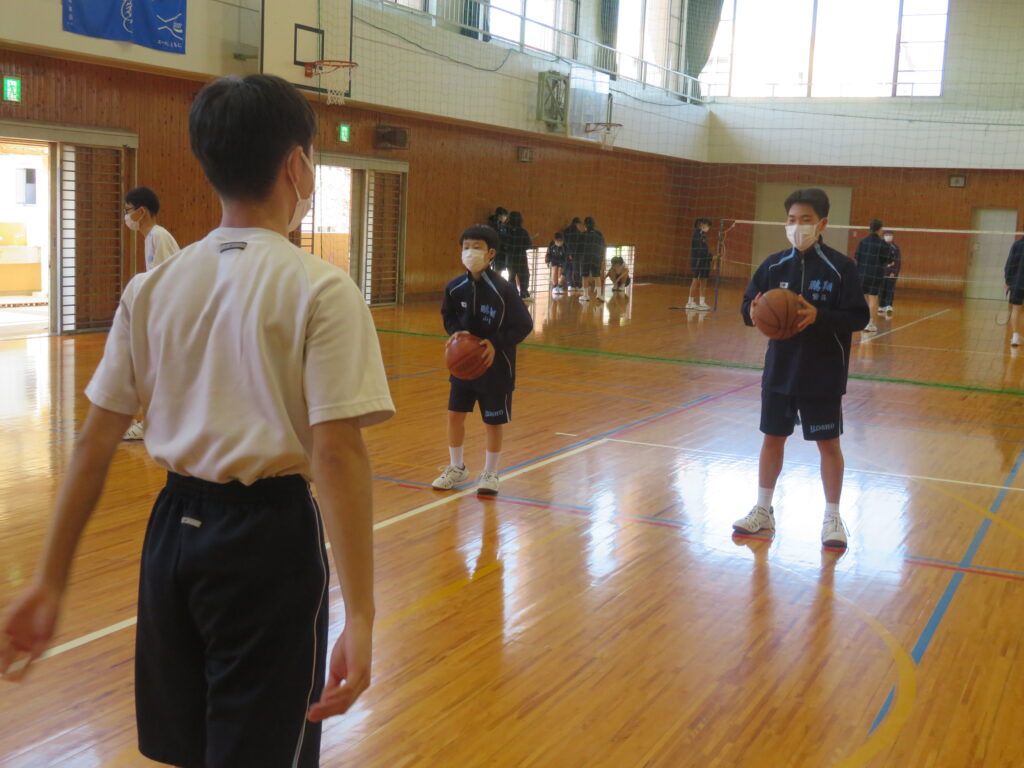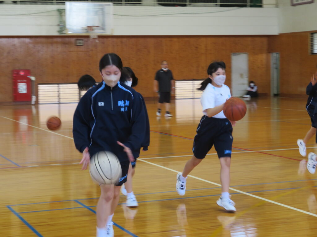 バスケットボールでは、まずペアをつくり、その場でパス練習・ドリブル練習をしていました。だんだんボールに慣れてきたところで、走りながらパスを出し合ったり、全速力で走りながらドリブルをつく練習をしていました。