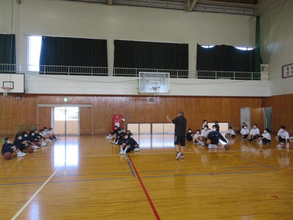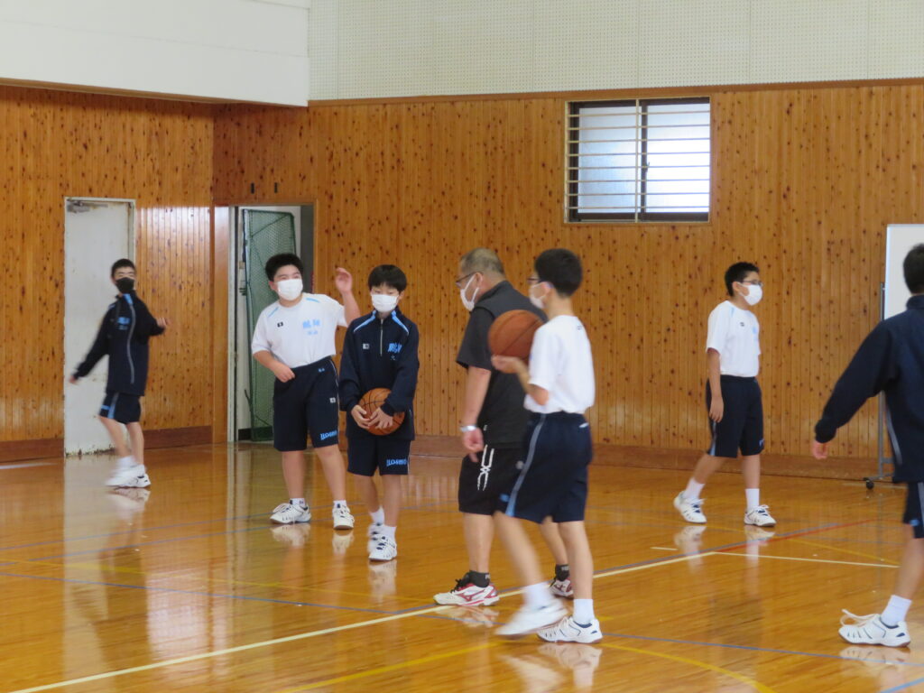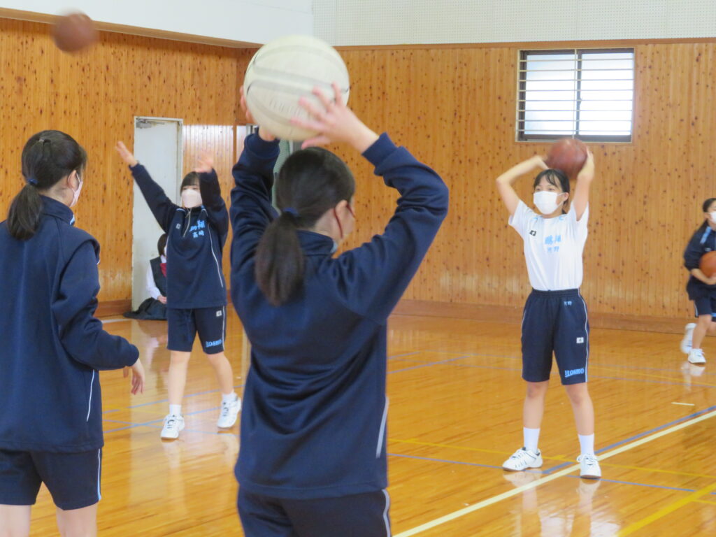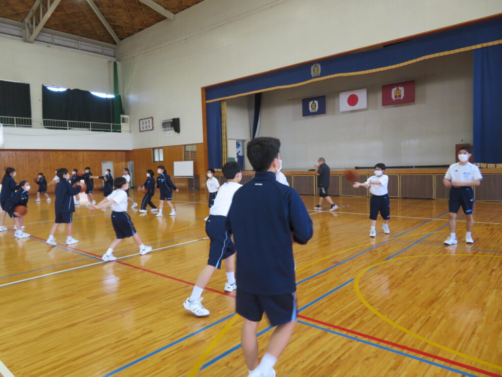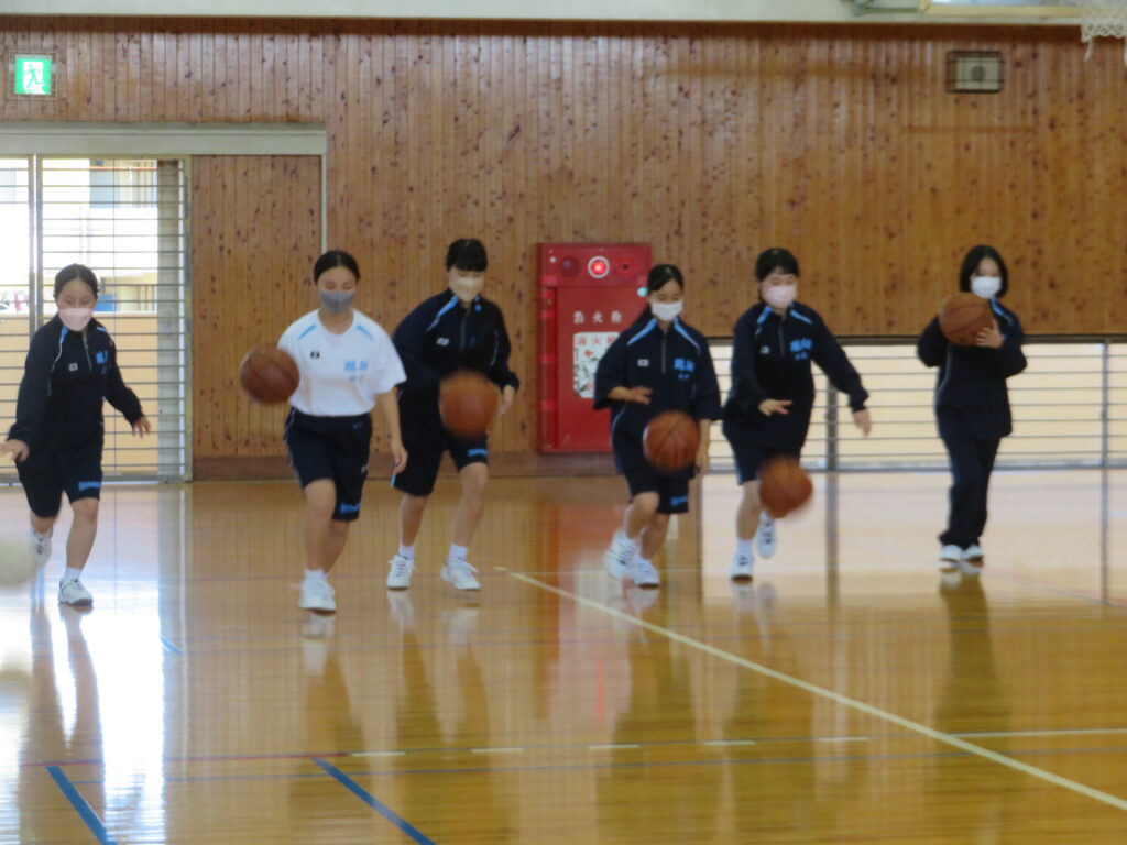 バスケットボールでは、まずペアをつくり、その場でパス練習・ドリブル練習をしていました。だんだんボールに慣れてきたところで、走りながらパスを出し合ったり、全速力で走りながらドリブルをつく練習をしていました。