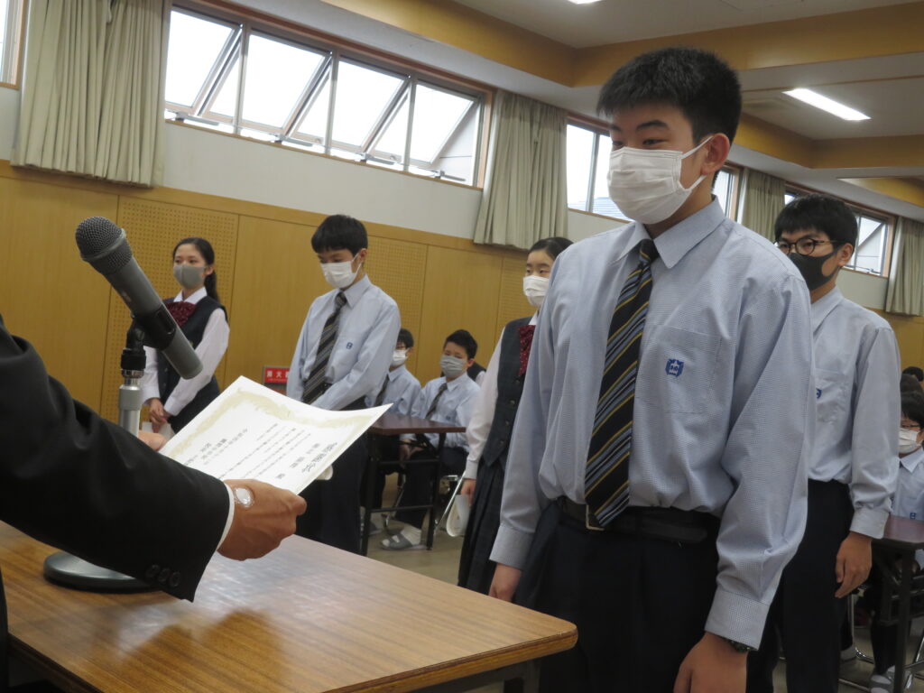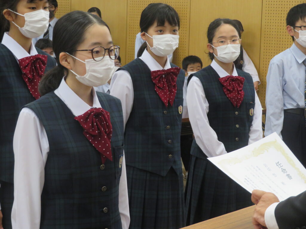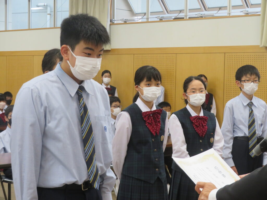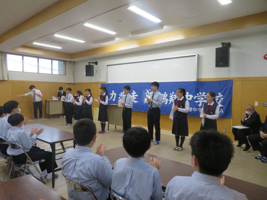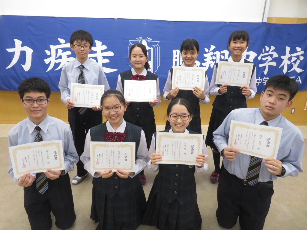 その後、新生徒会役員へ任命証授与が行われました。新生徒会役員のみなさん、それぞれが立会演説で掲げた「よりよい学校生活」のために活動する第一歩となります!これまで先輩たちが築いてきた伝統を大切にしつつ、新しい鵬翔中学校を作ってください!