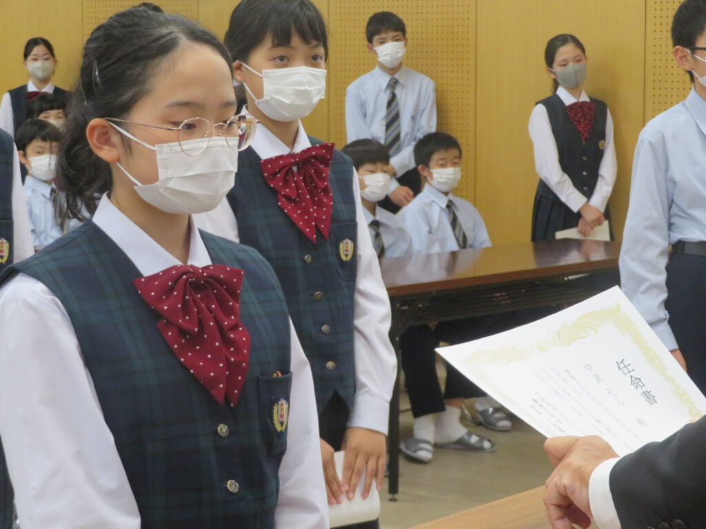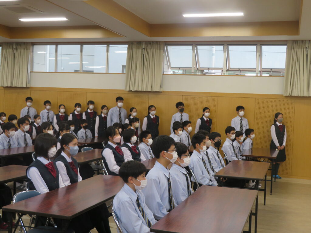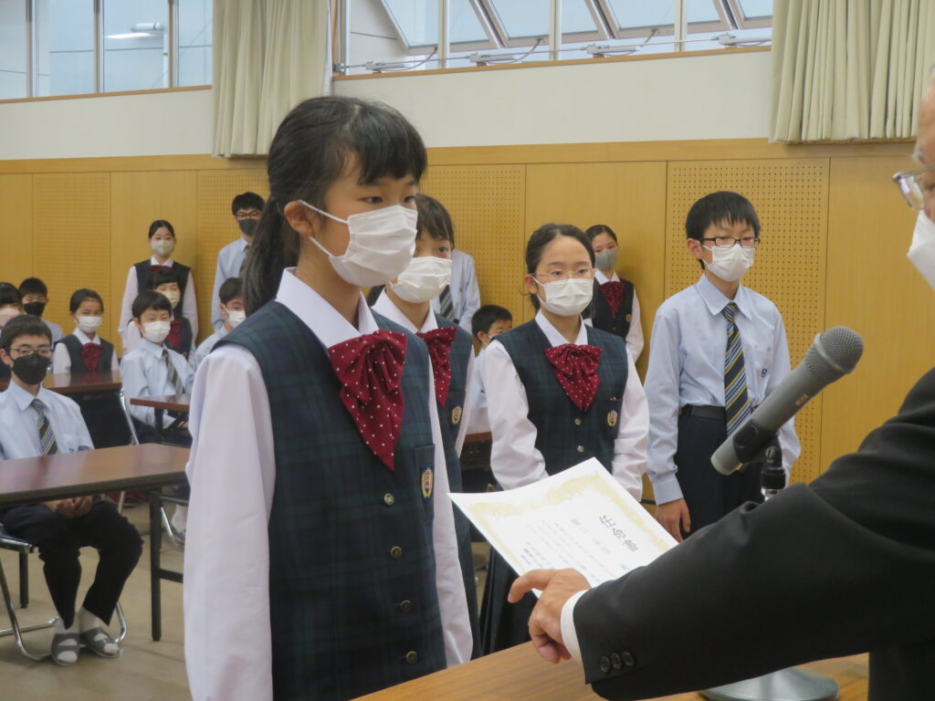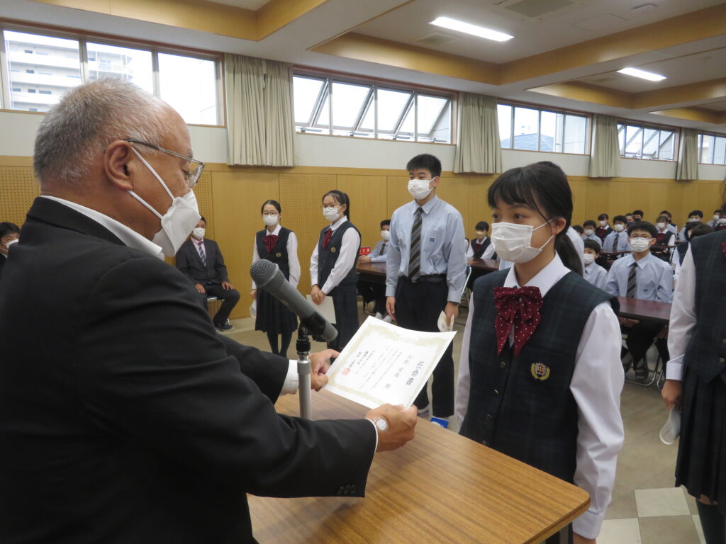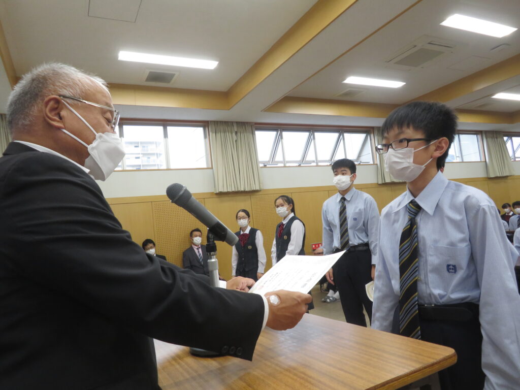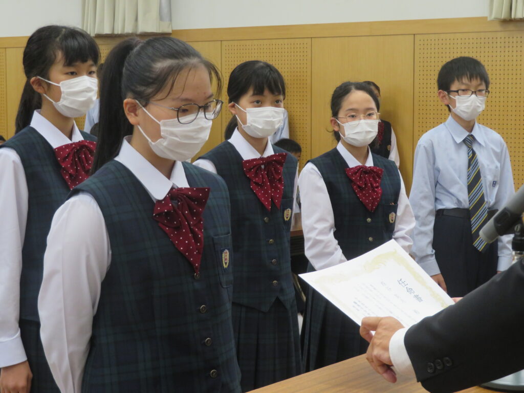 その後、新生徒会役員へ任命証授与が行われました。新生徒会役員のみなさん、それぞれが立会演説で掲げた「よりよい学校生活」のために活動する第一歩となります!これまで先輩たちが築いてきた伝統を大切にしつつ、新しい鵬翔中学校を作ってください!