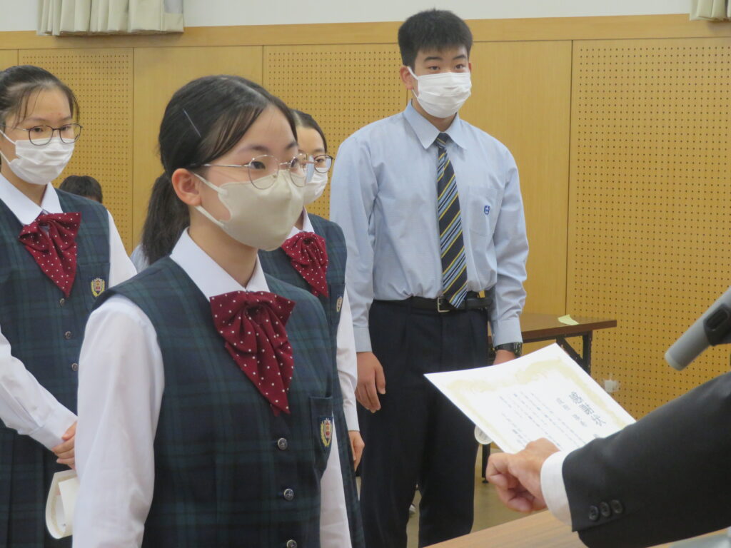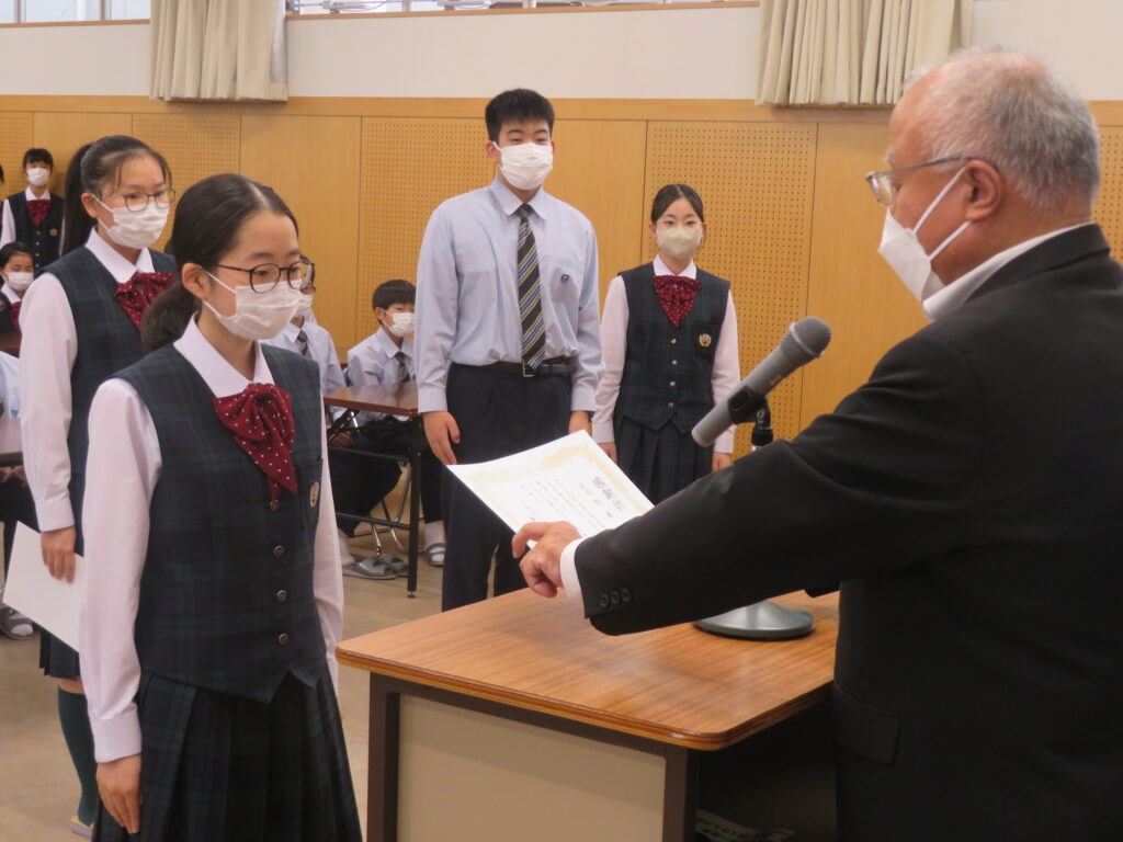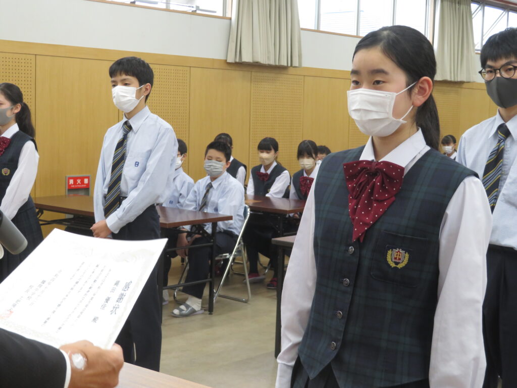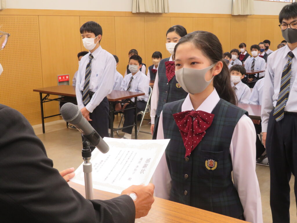 次に、1年間学校のために頑張ってくれた旧生徒会役員のみなさんへ感謝状の授与が行われました。旧役員のみなさん本当にありがとうございました。生徒会での経験を活かし、今後の学校生活も頑張ってください。