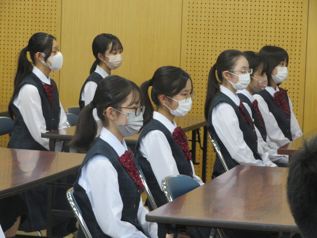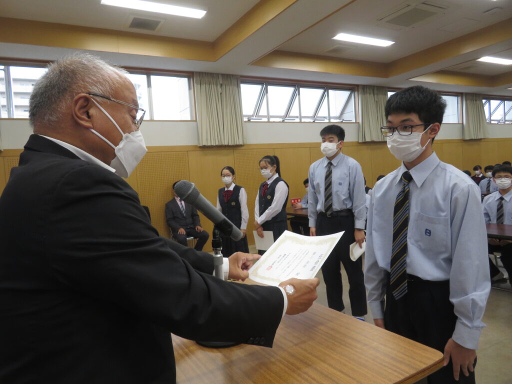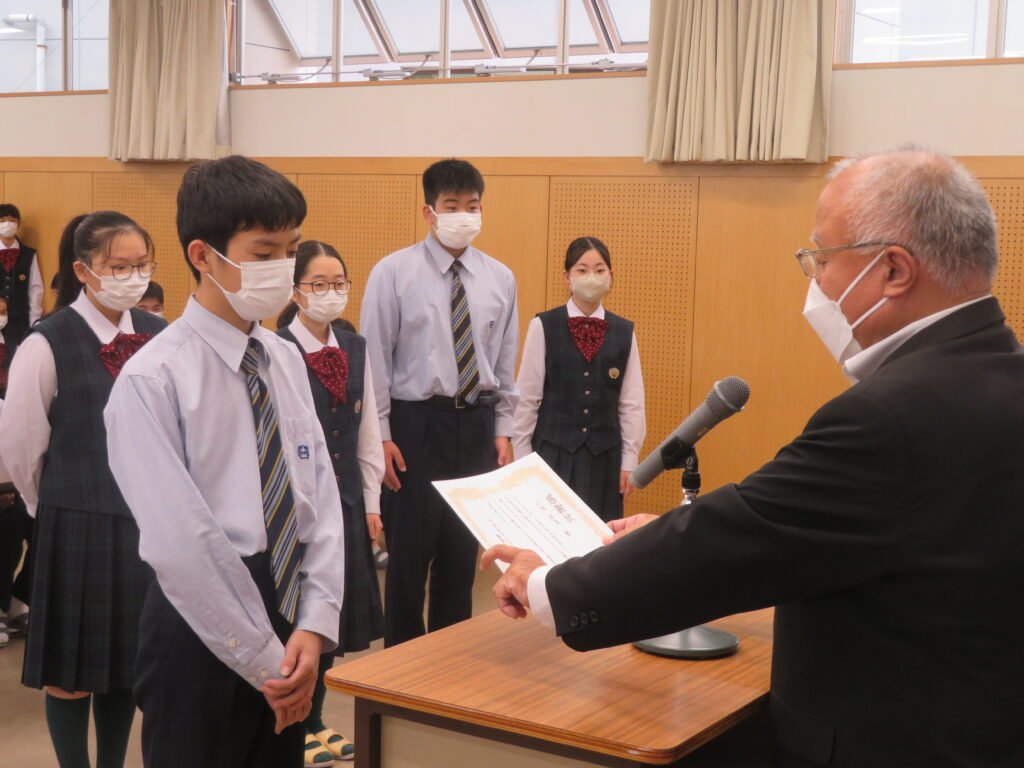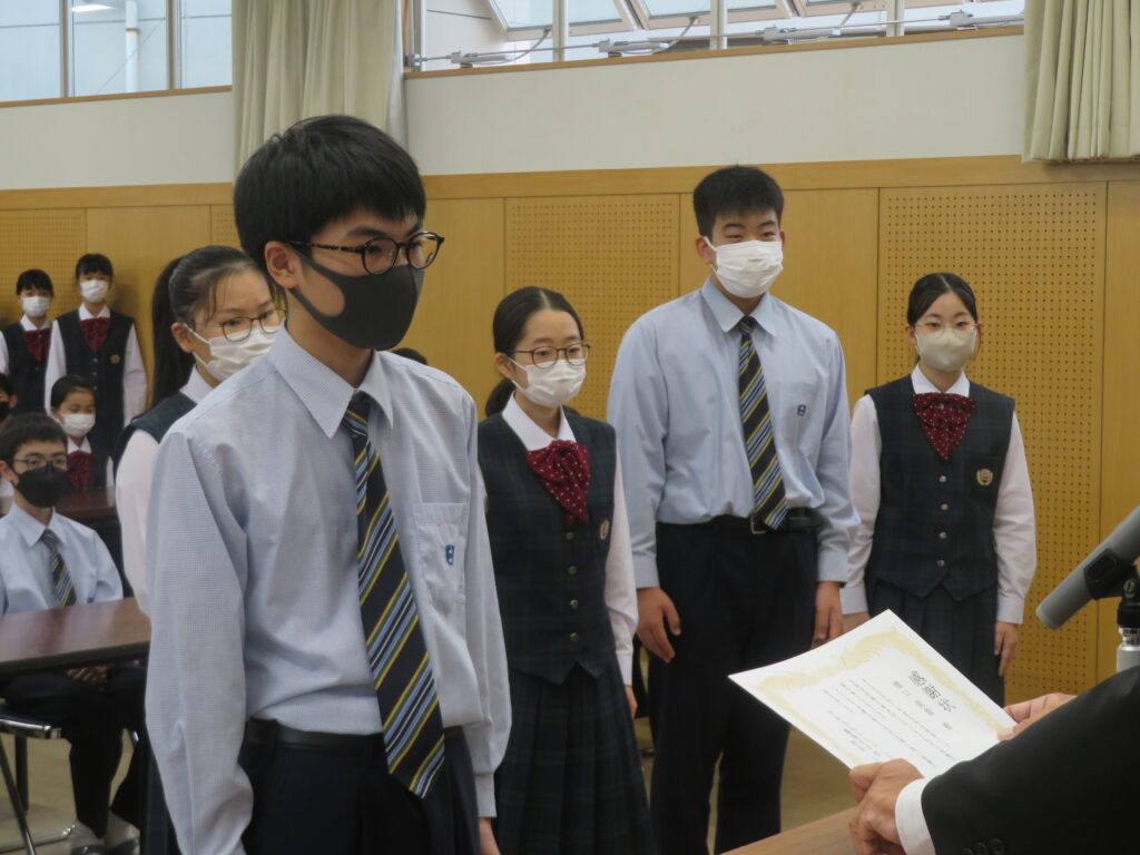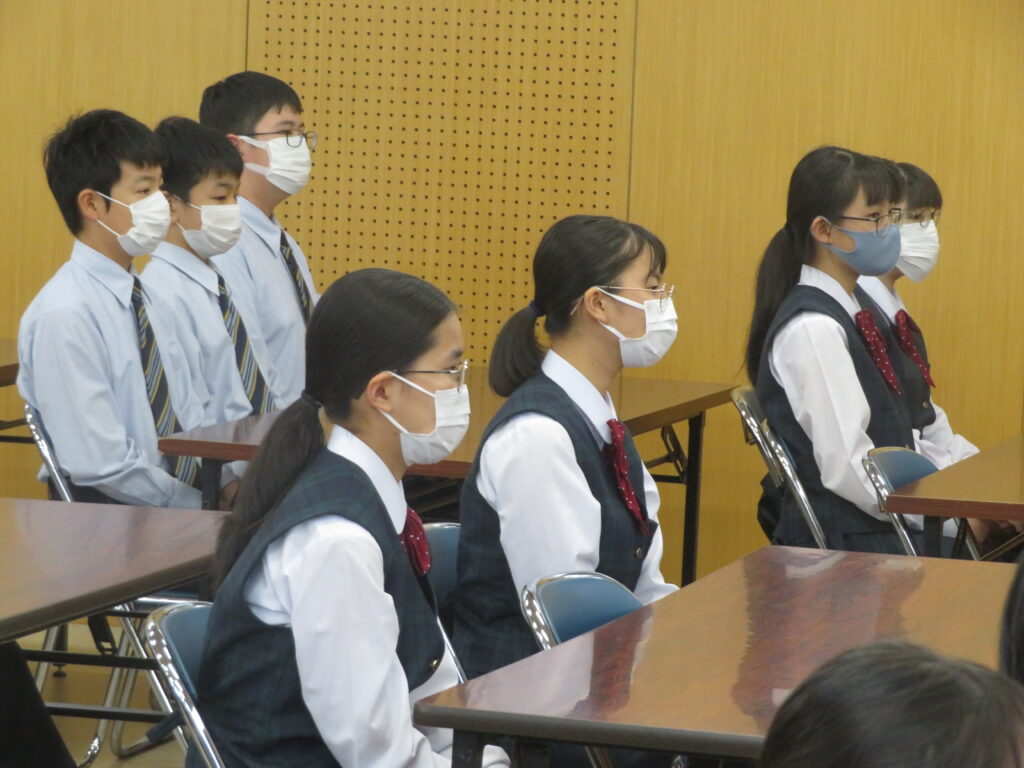 次に、1年間学校のために頑張ってくれた旧生徒会役員のみなさんへ感謝状の授与が行われました。旧役員のみなさん本当にありがとうございました。生徒会での経験を活かし、今後の学校生活も頑張ってください。