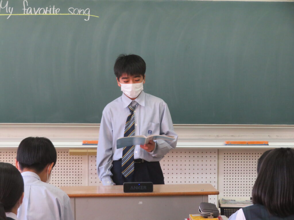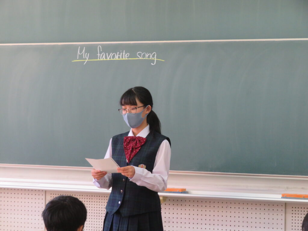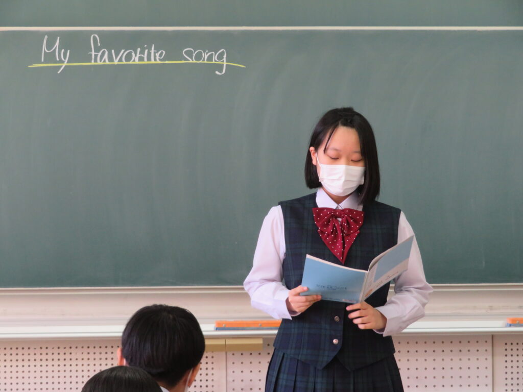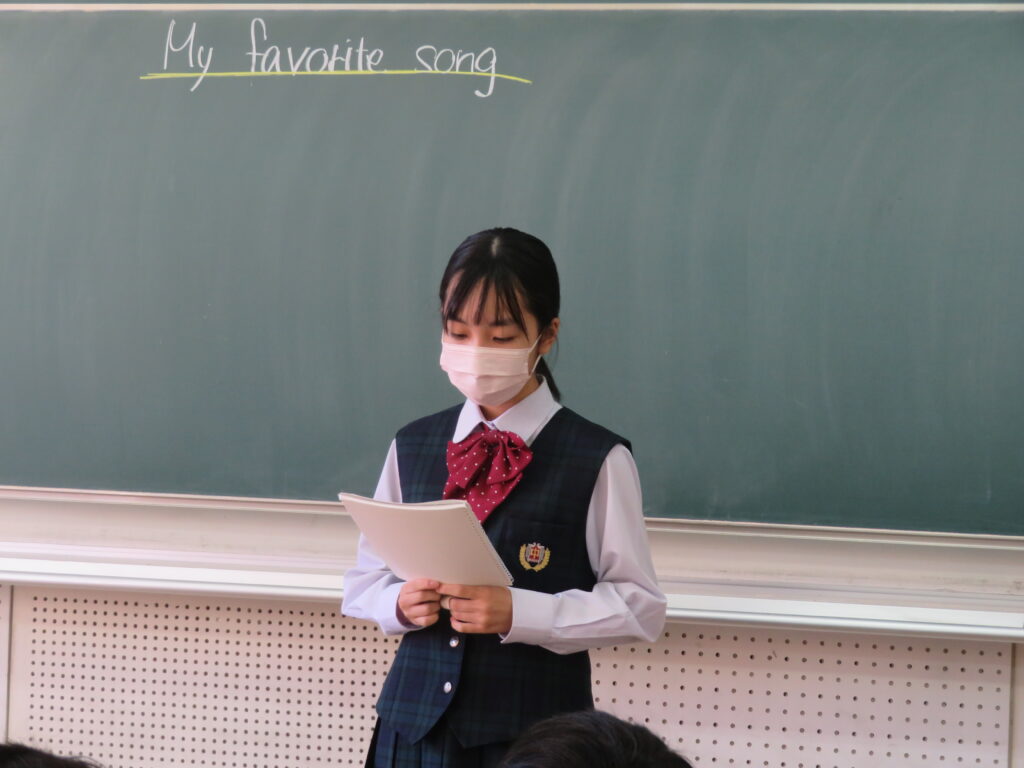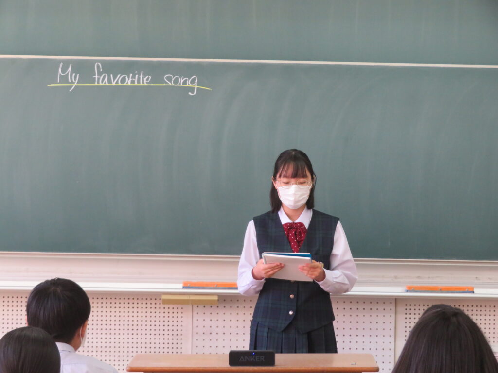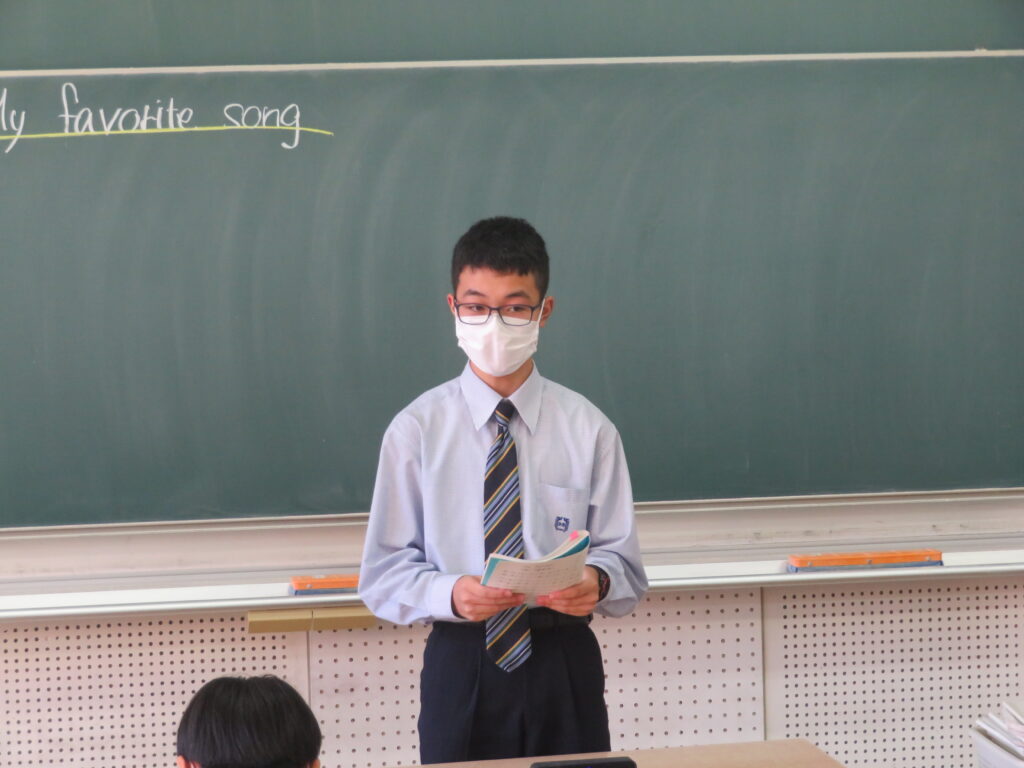 本日、J2英語発展クラスは、「自分のお気に入りの曲」をテーマに、その曲の好きな理由や歌詞に込められた思いなど、自分なりに考えスピーチをしていました。