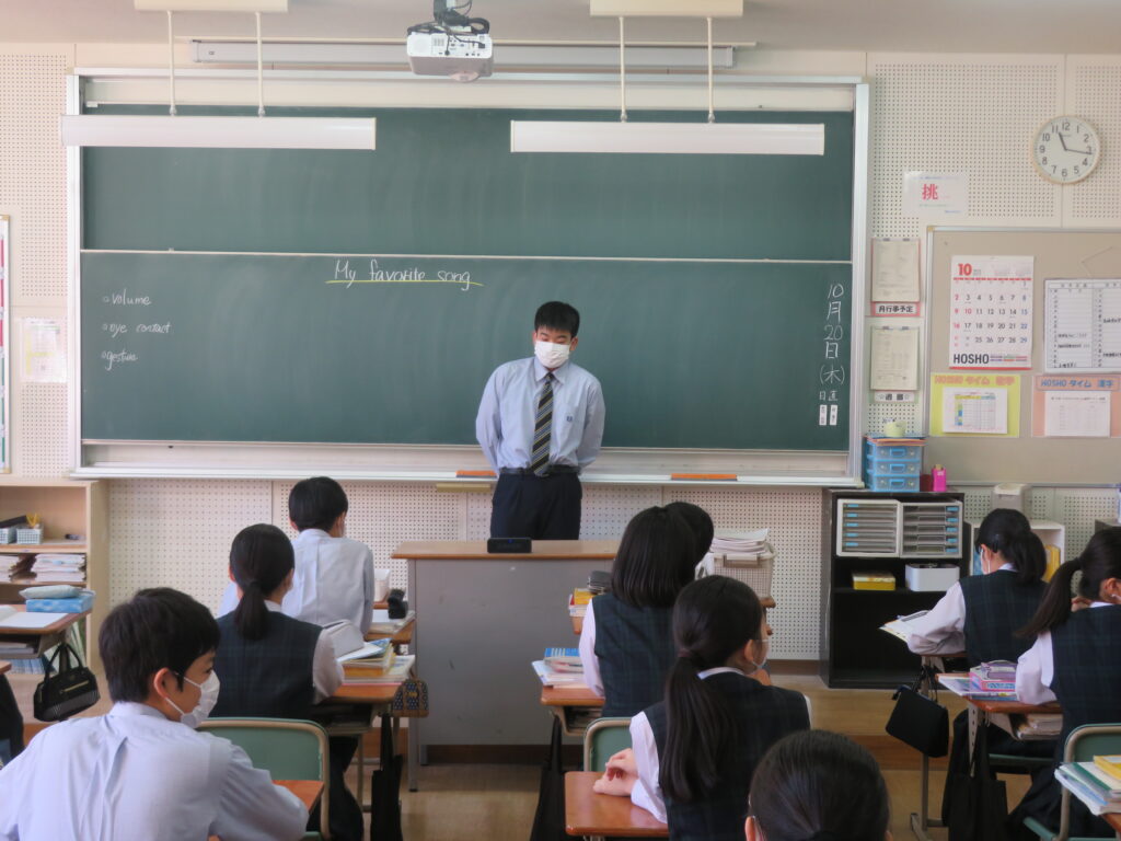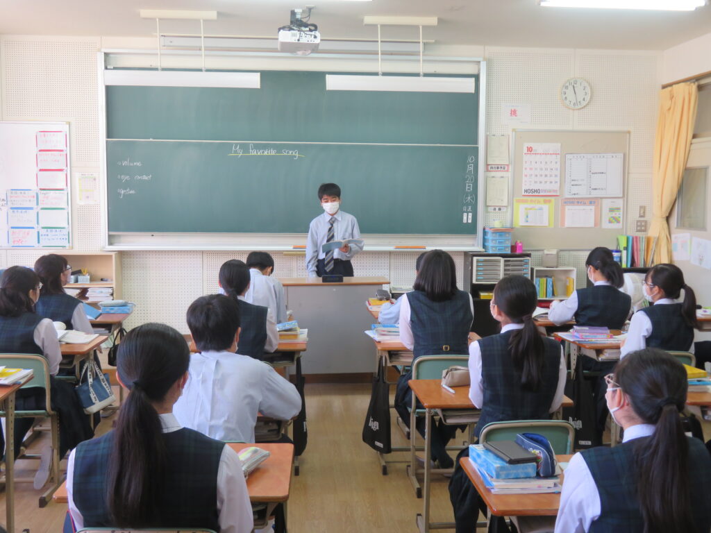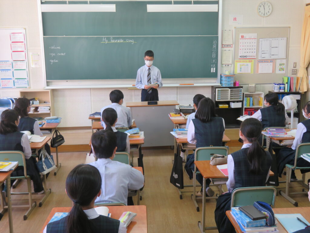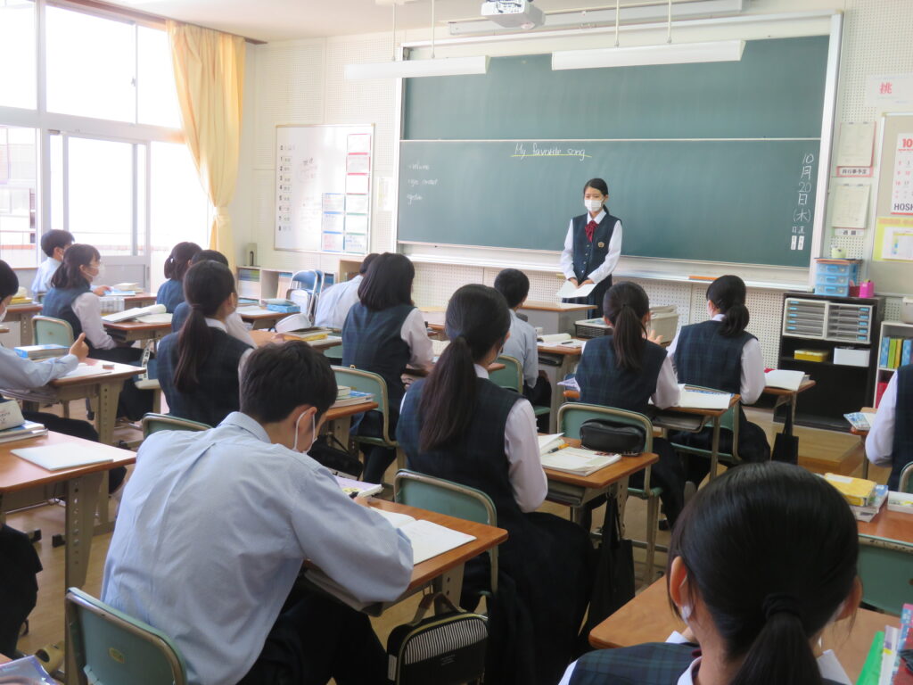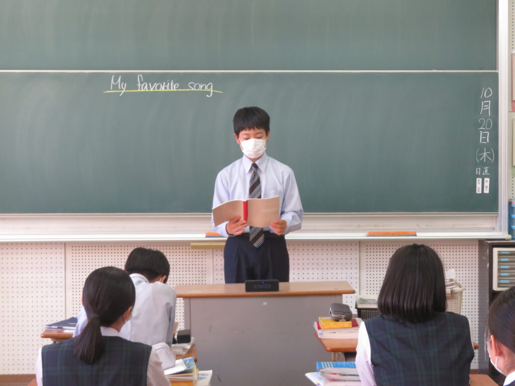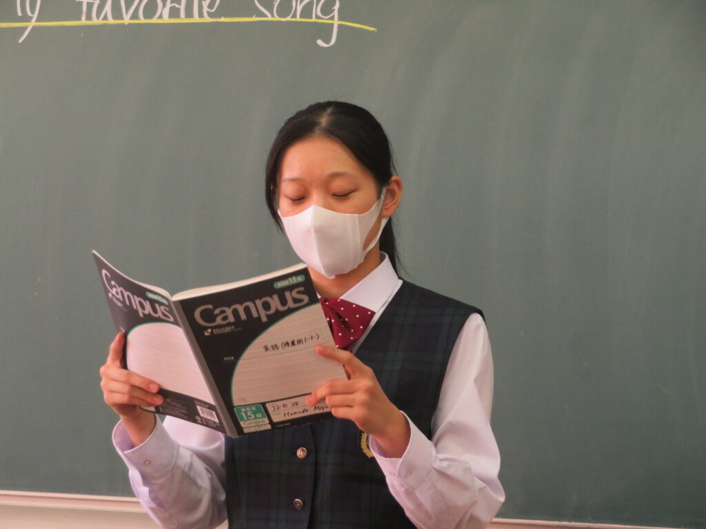 本日、J2英語発展クラスは、「自分のお気に入りの曲」をテーマに、その曲の好きな理由や歌詞に込められた思いなど、自分なりに考えスピーチをしていました。