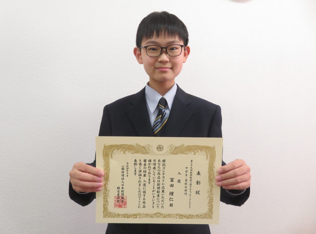 9月28日に紹介しました「第29回新聞配達に関するエッセーコンテスト 中学生・高校生部門」で見事入選を果たした、J1-A冨田理仁さん(宮大附属小出身)が、表彰を受けました。