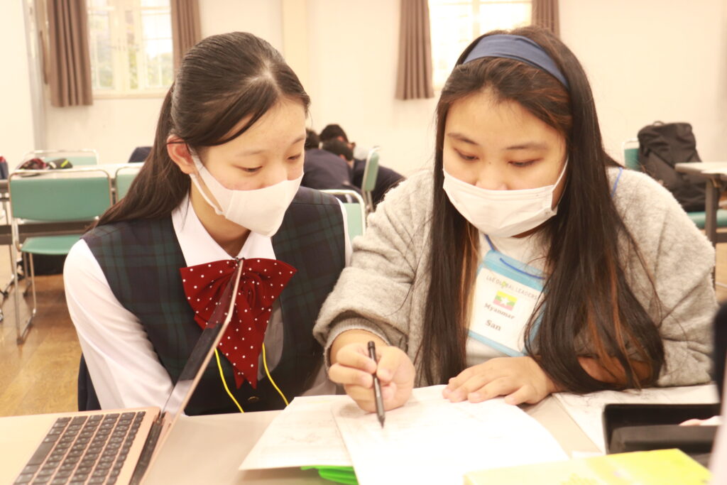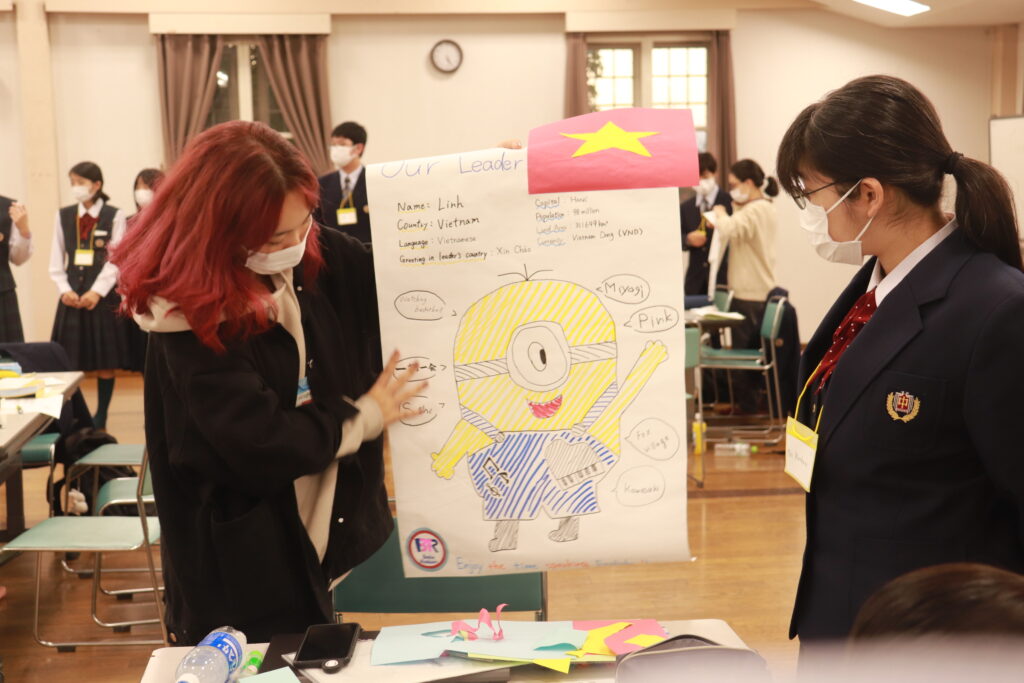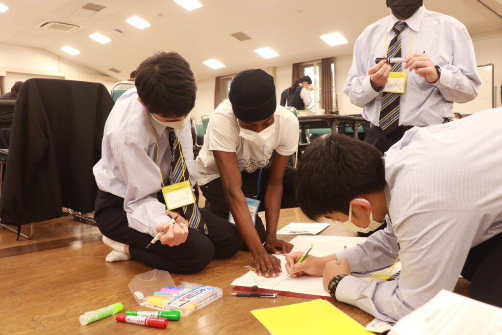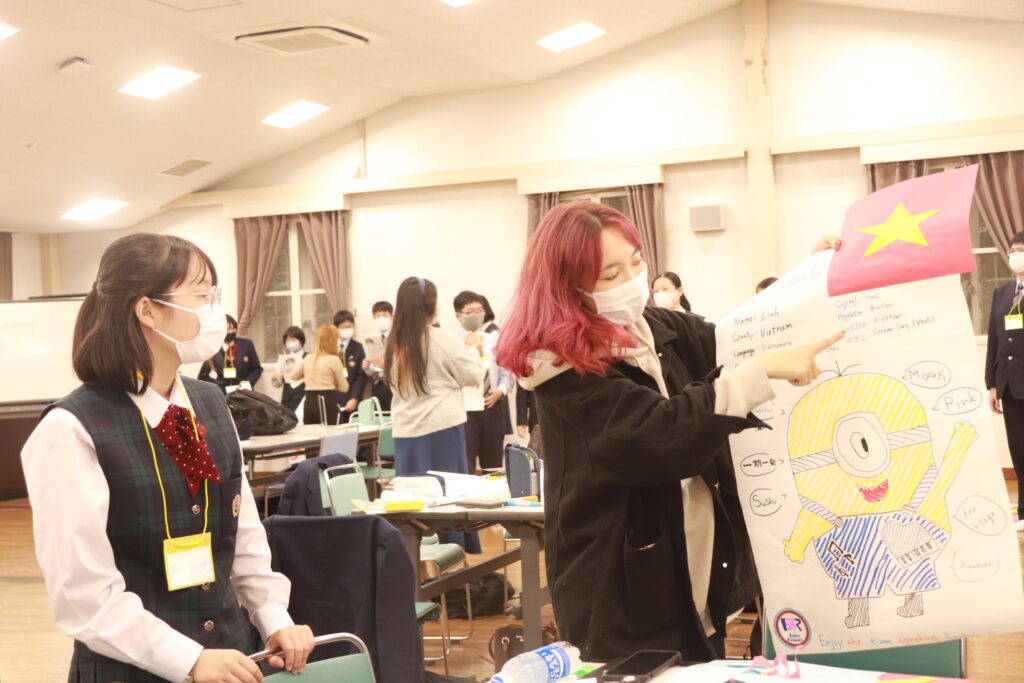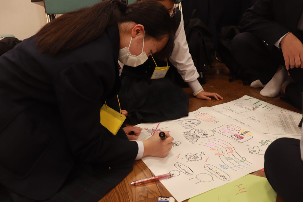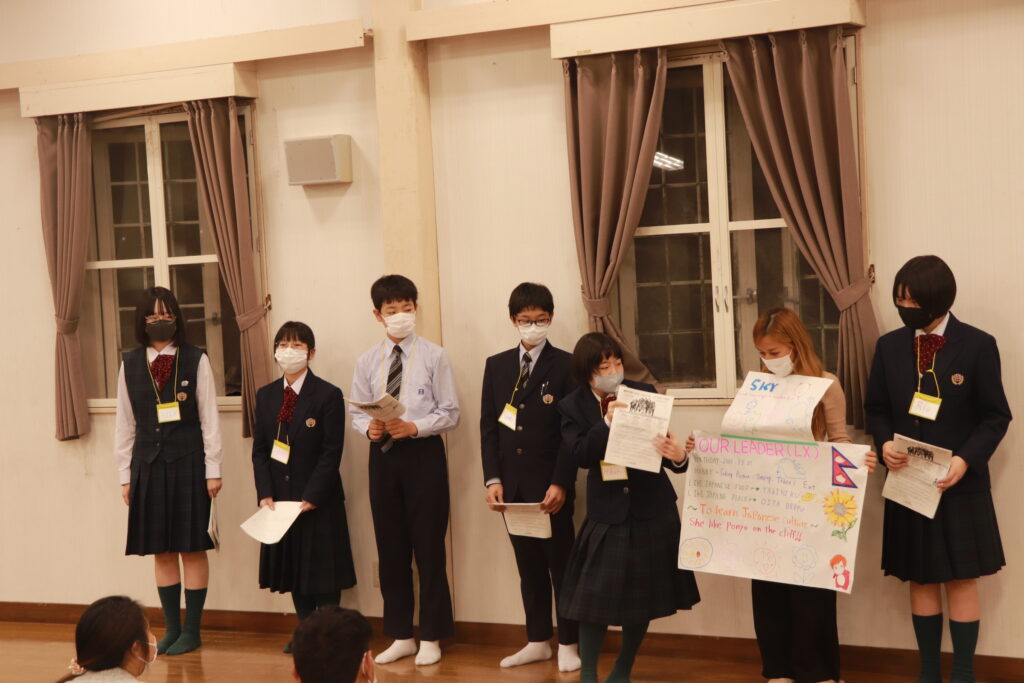 グローバルビレッジプログラム1日目後半は「グローバルリーダーについて」のポスター作成&ポスタープレゼンテーションでした。自分達でインタビューしたことなどをもとに各班とも趣向を凝らしながら、一生懸命頑張っていました。