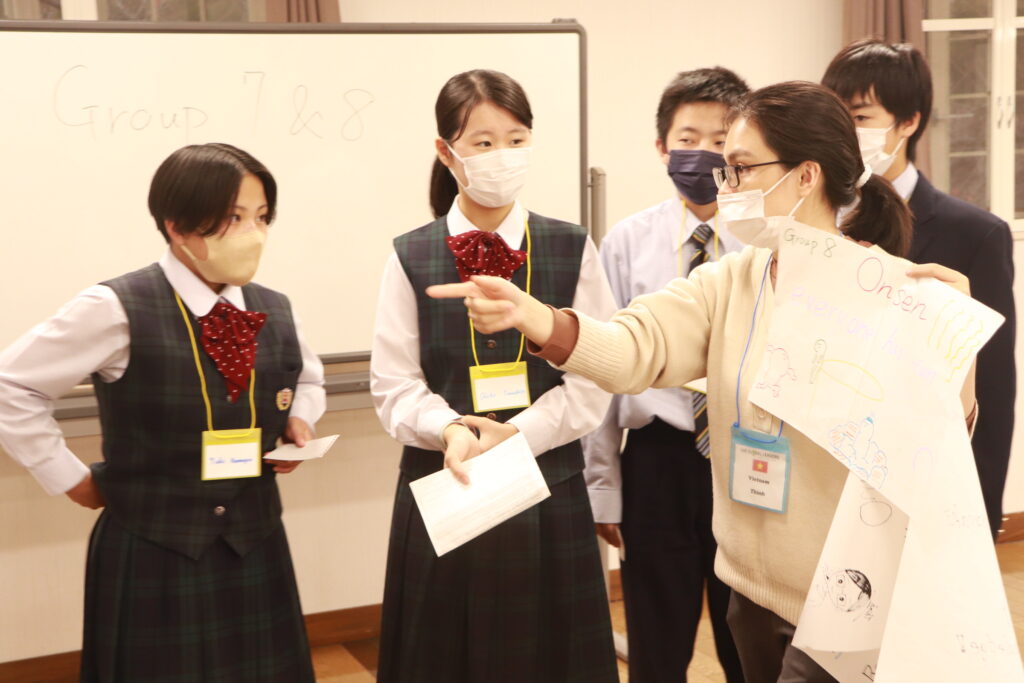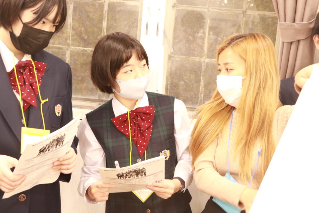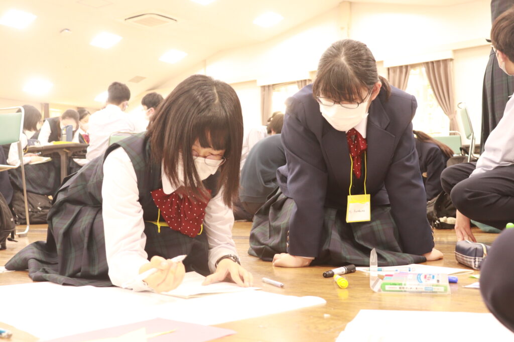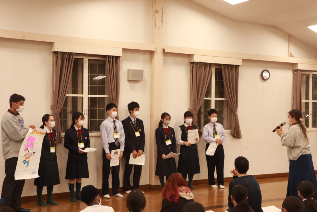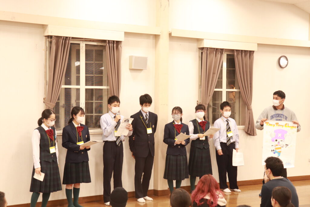 ポスタープレゼンテーションはもちろん、英語での発表になります。1時間で原稿を考え、ポスターを使いながら、グローバルリーダーと共に協力して発表していました。どこの班の発表も工夫がありとても面白かったです。