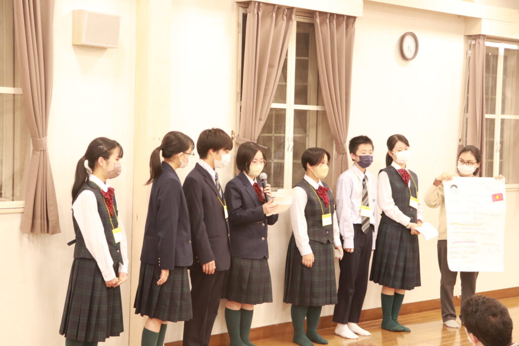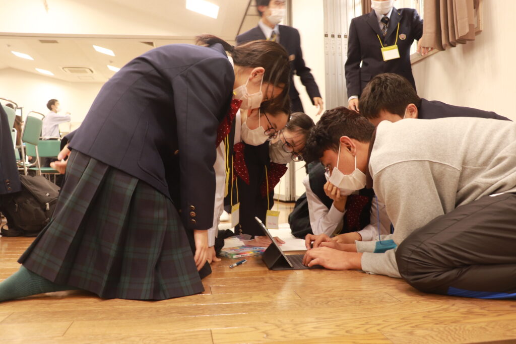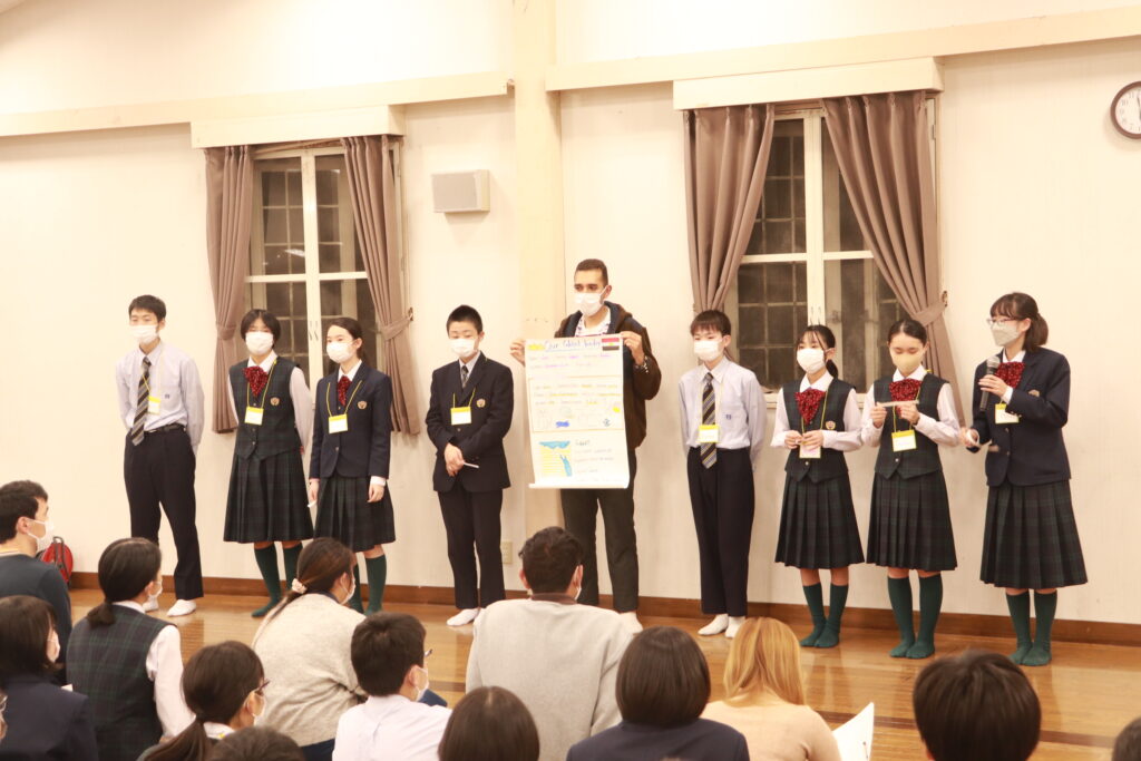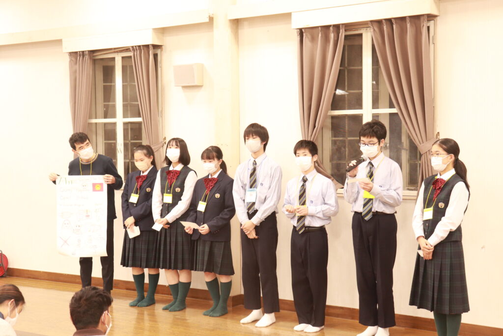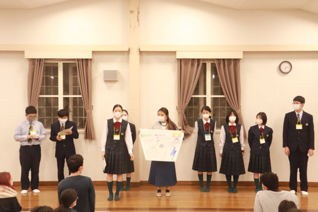 ポスタープレゼンテーションはもちろん、英語での発表になります。1時間で原稿を考え、ポスターを使いながら、グローバルリーダーと共に協力して発表していました。どこの班の発表も工夫がありとても面白かったです。