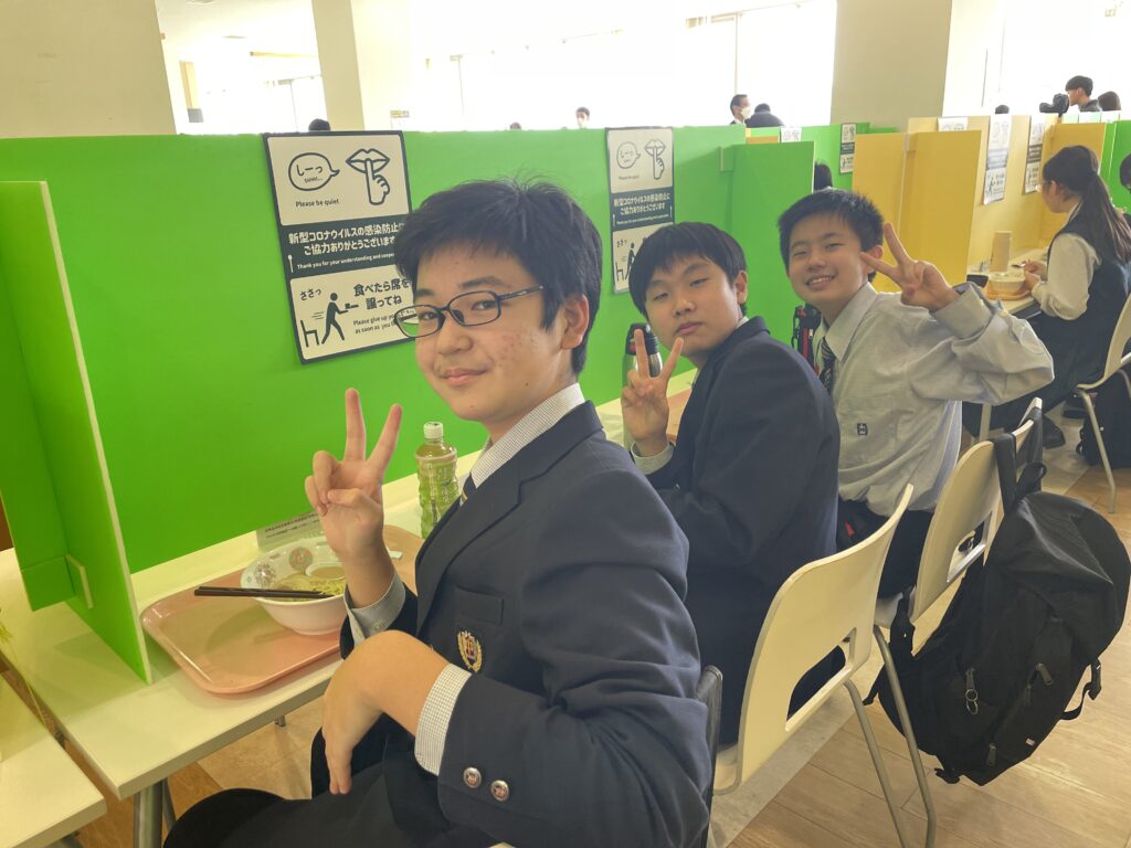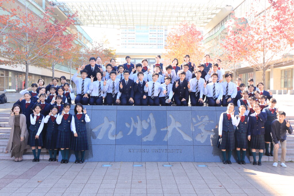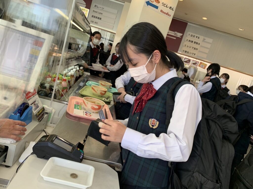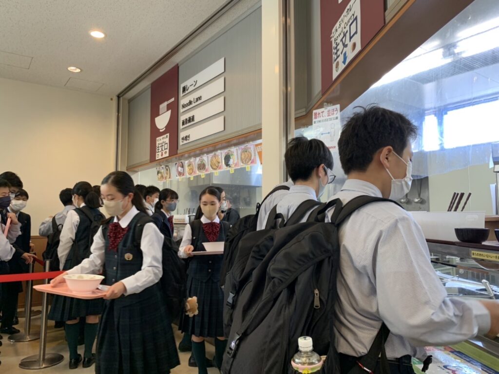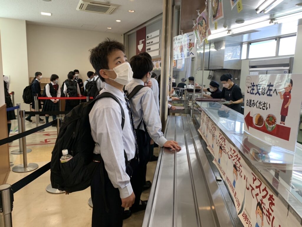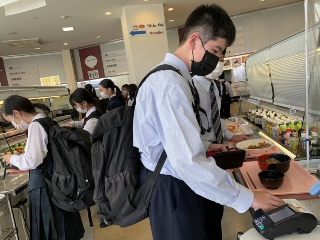 最後の目的地の九州大学に到着しました。朝から動きつづけていた生徒たちは、大学の学食で大学生に交じりながら、自分たちでメニューを選びお昼ご飯を食べました。普段は、学校の教室で昼食をとる生徒たちにとっては、大学生に交じっての昼食は、ちょっと背伸びをした良い経験になったのではないでしょうか。
