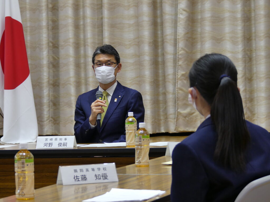 昨日、令和4年度青少年の主張宮崎県大会において、優秀賞を受賞しましたJ3A三田井愛結さん(住吉小出身) が、河野俊嗣県知事と対談を行いました。