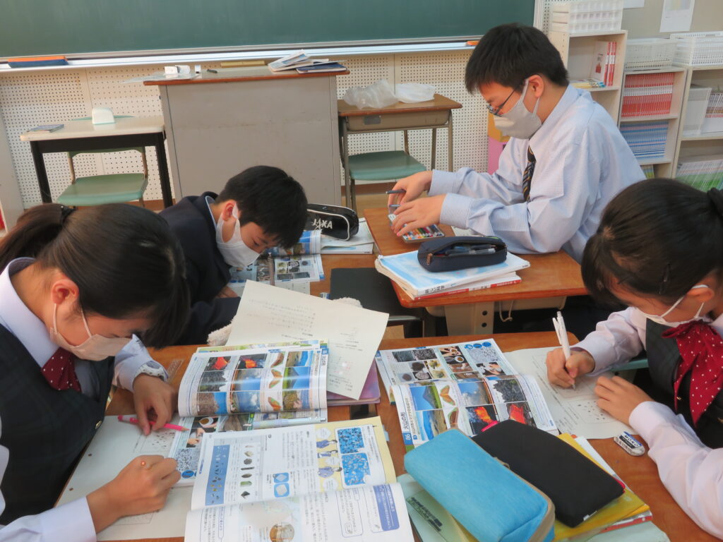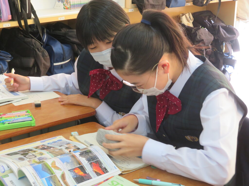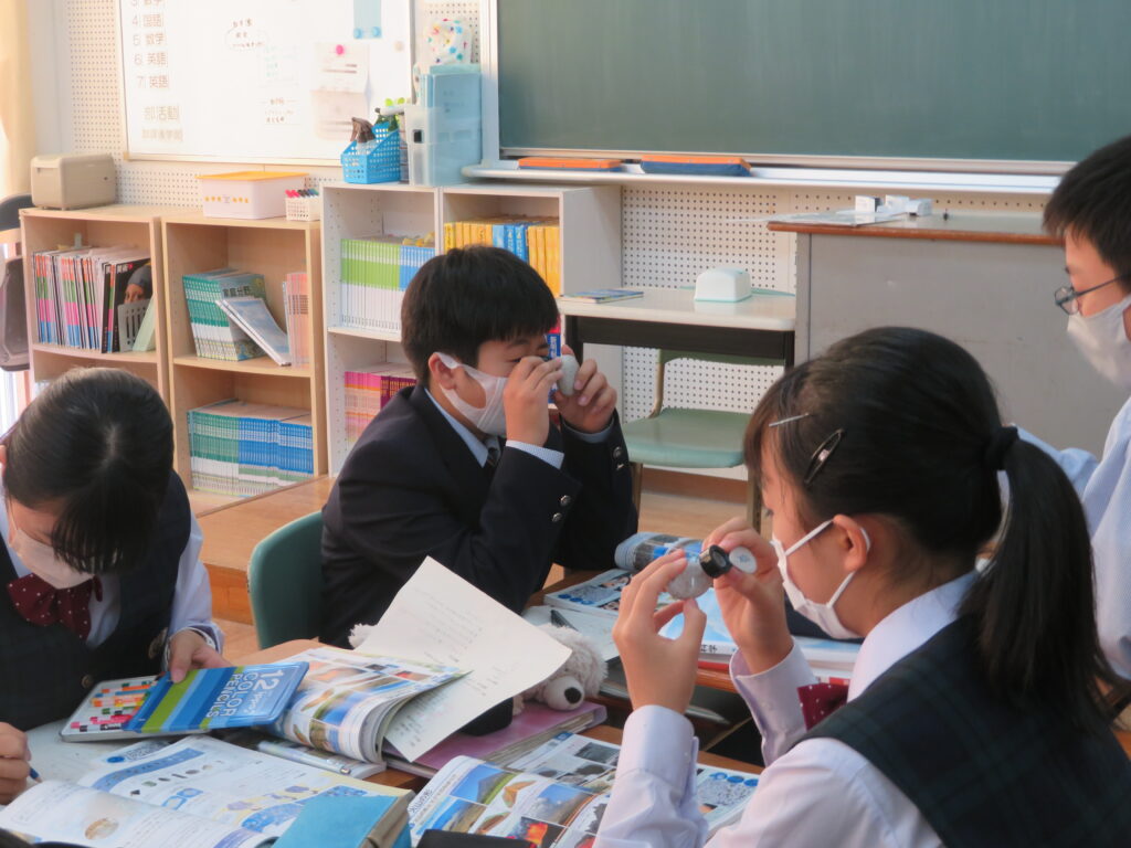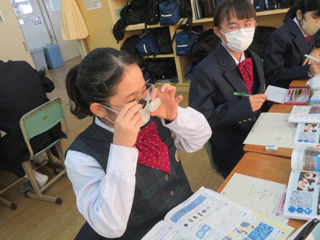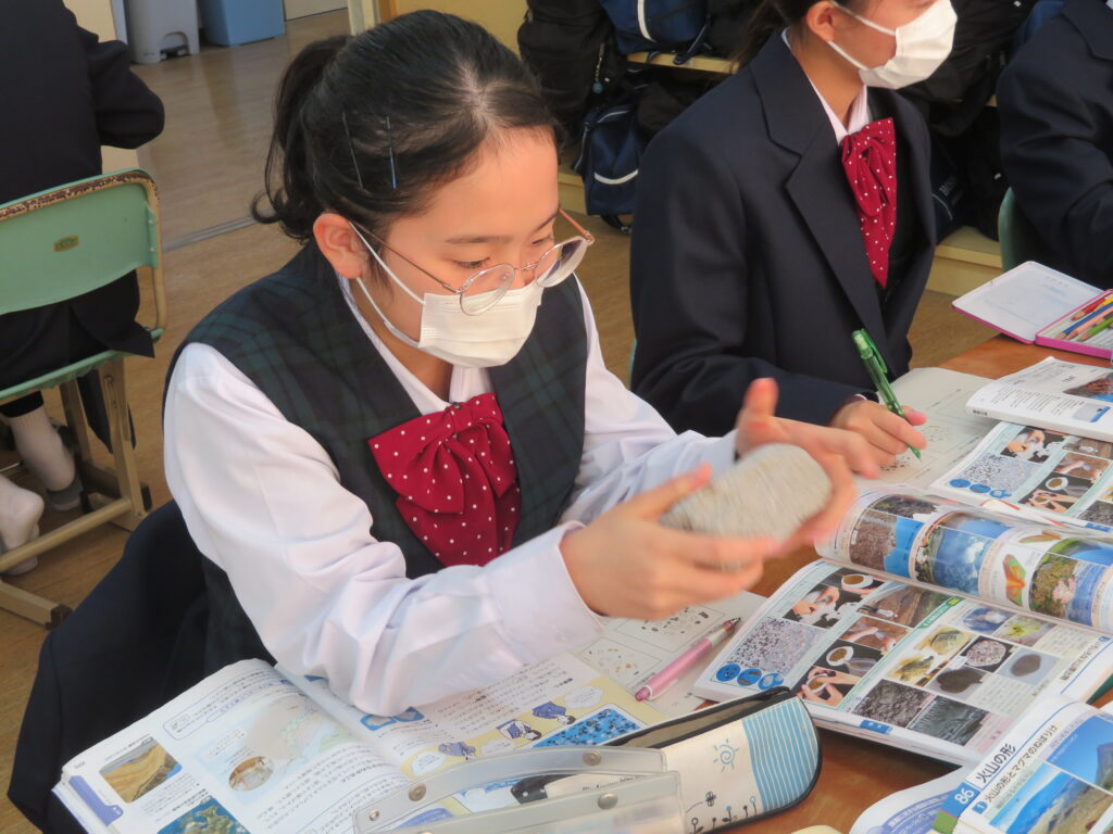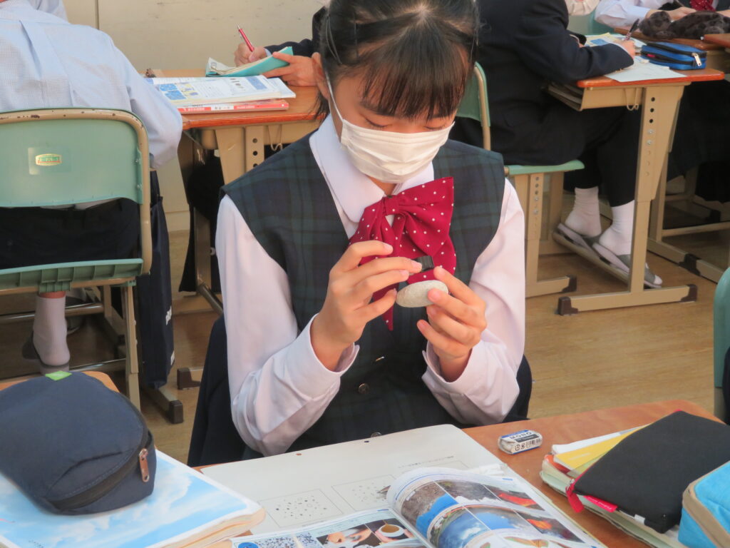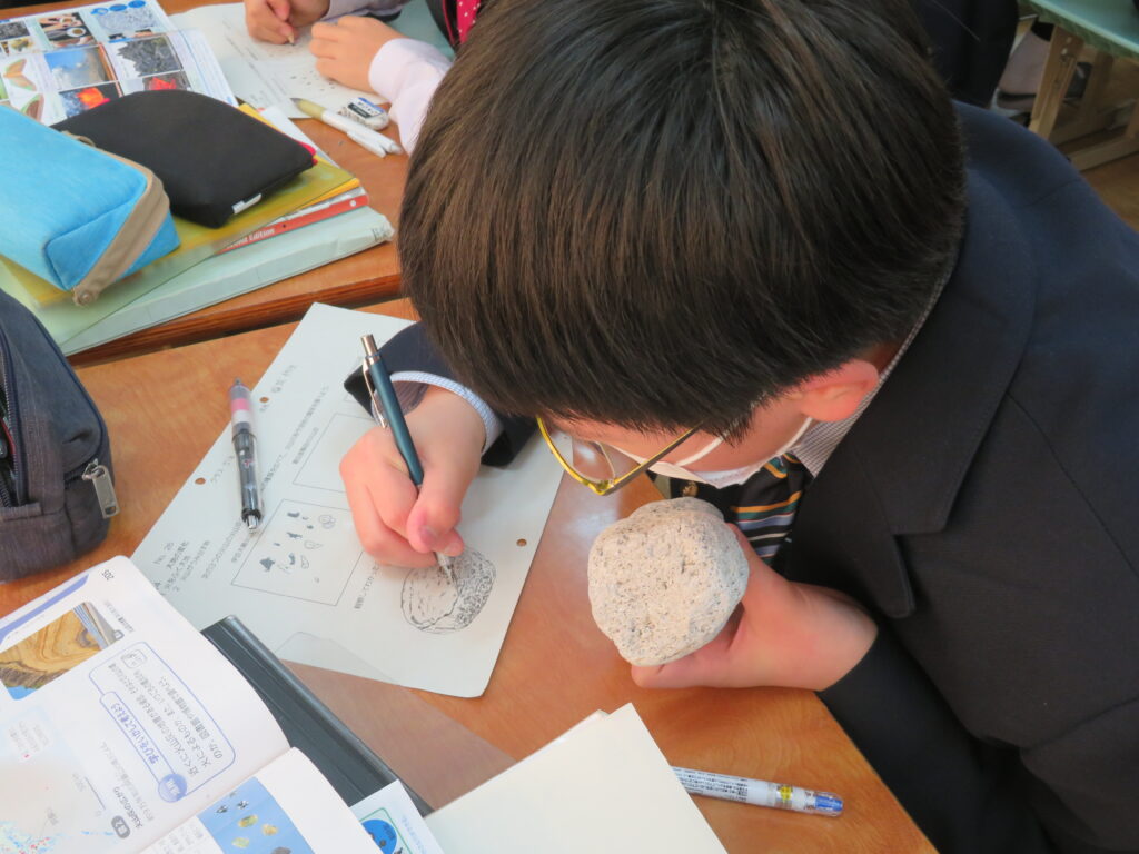 生徒たちは、「ごつごつしていた」「ポコポコと穴が開いていて、お月様みたいみたいだった」と楽しく観察をしていました。