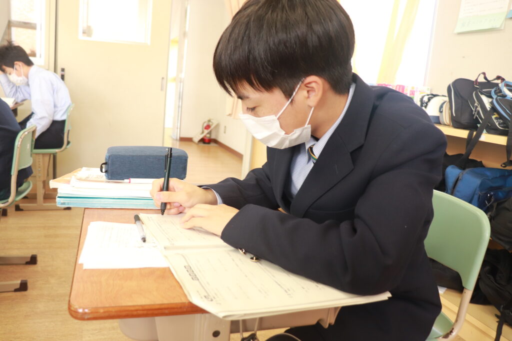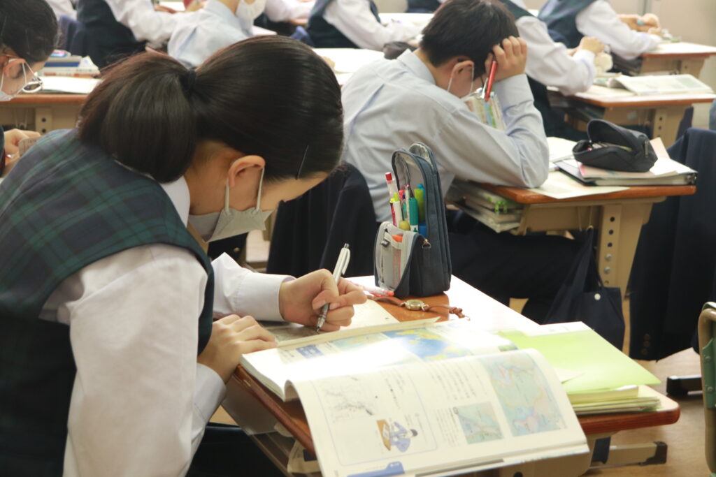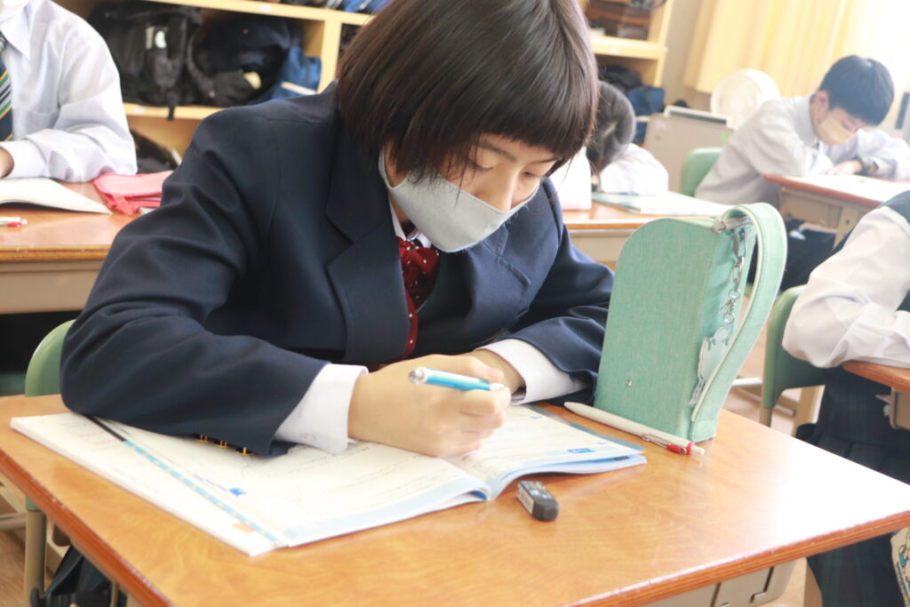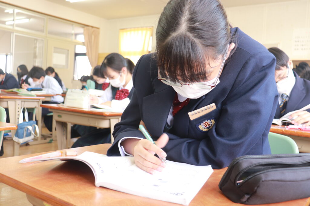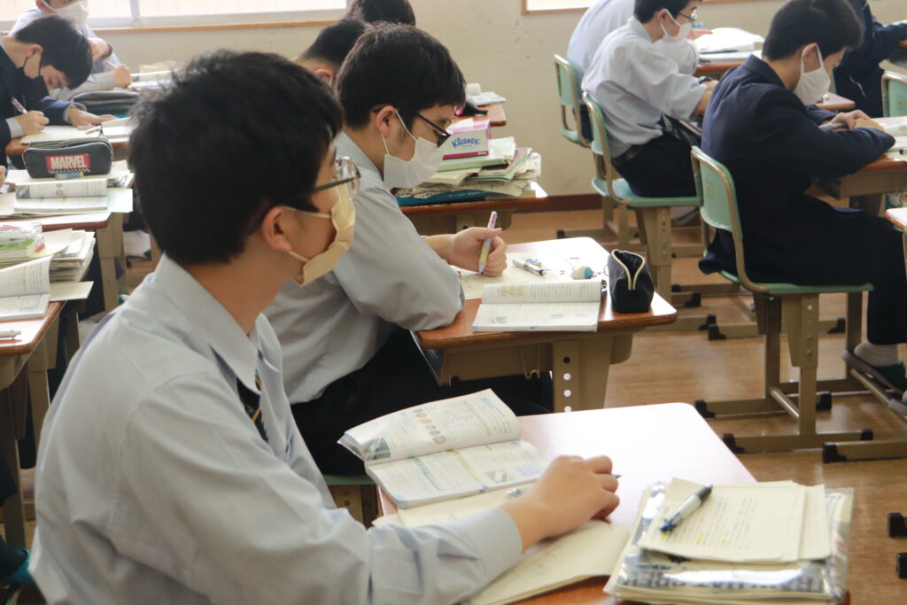 第4回定期考査目前となり、授業中はピリピリとした空気が流れています。どのクラスを覗いても良い緊張感の中、黒板や教科書に向かい合う生徒の姿でいっぱいです。