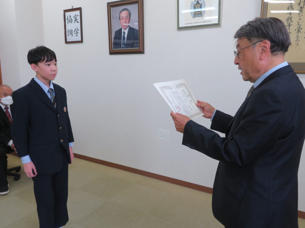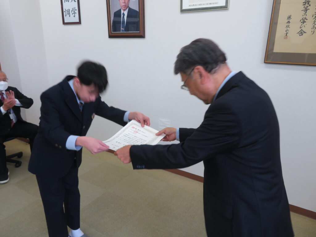 先日、2022年度第60回中学校作文コンクール「わたしたちのくらしと生命保険」で受賞したJ1-B井手大雅さん(学園木花台小出身)の表彰式が執り行われました。