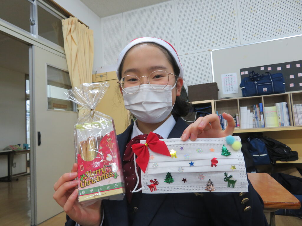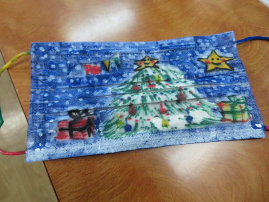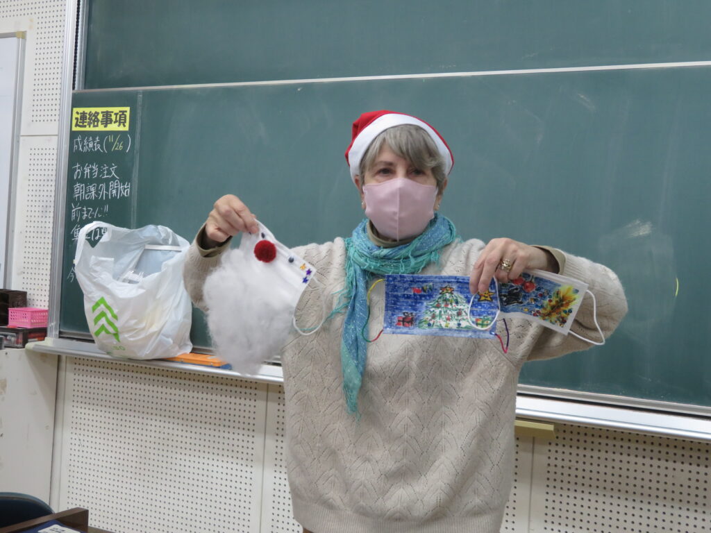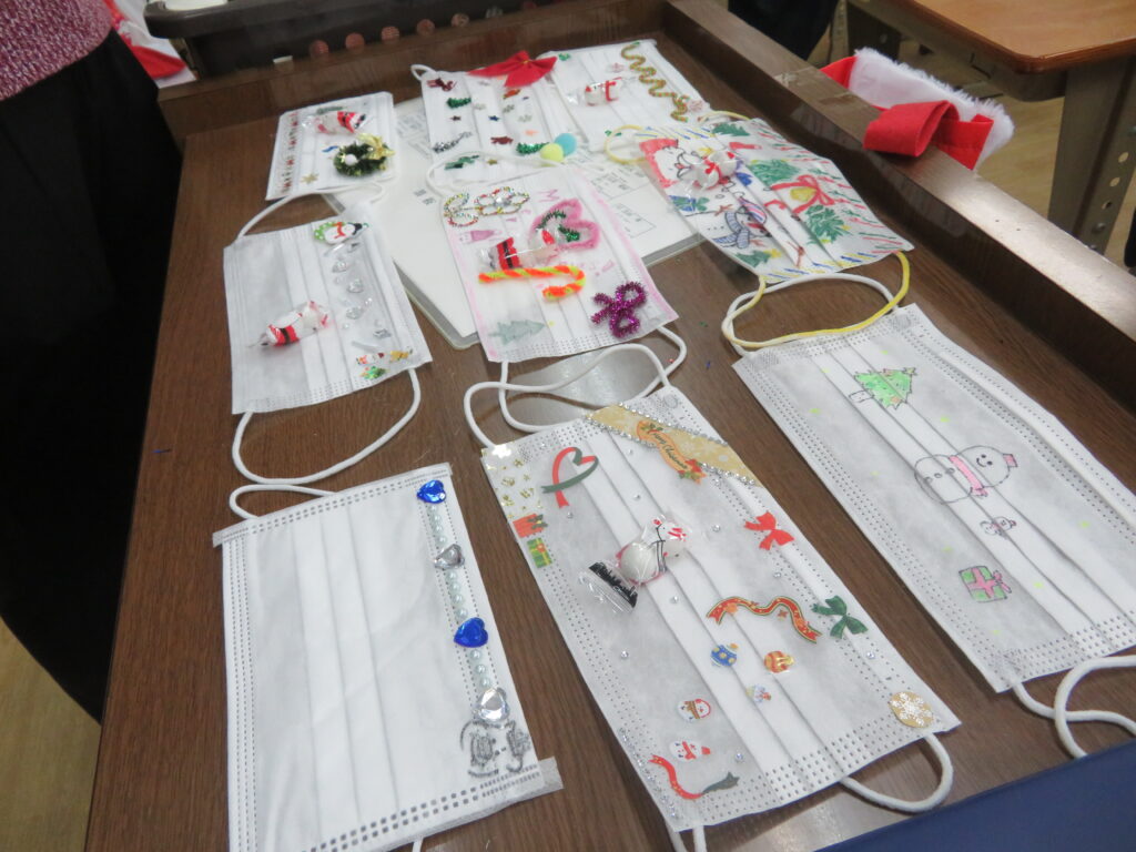 まず、「Ugly Christmas mask contest 」というものをしました。部員それぞれがマスクをクリスマス風にデコレーションして、どのデザインが最も良いかトンプソン先生に決めてもらいました。それぞれが工夫したデコレーションをしていて、とても素敵なものばかりでした。