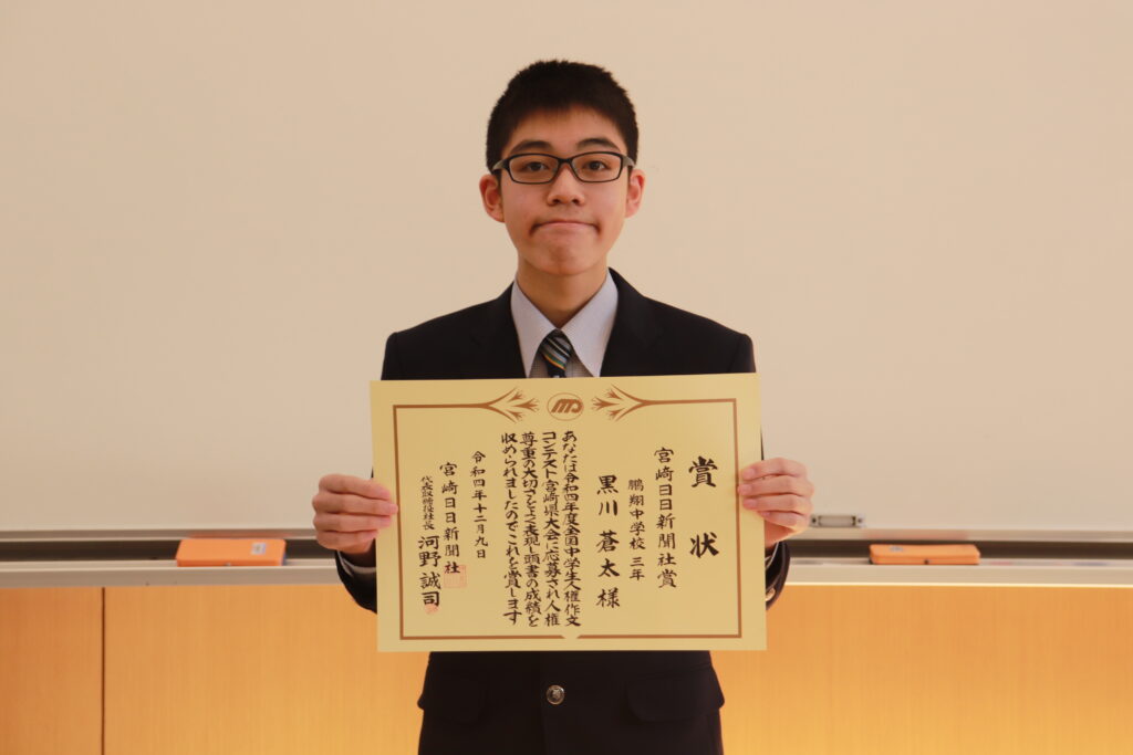 〇J3-A黒川 蒼太さん(宮崎南小出身) 令和4年度 全国中学生人権作文コンテスト宮崎県大会 宮崎日日新聞社賞