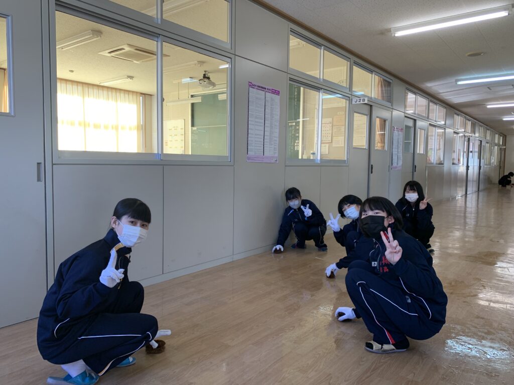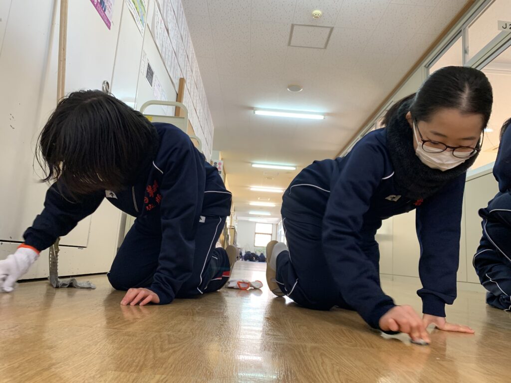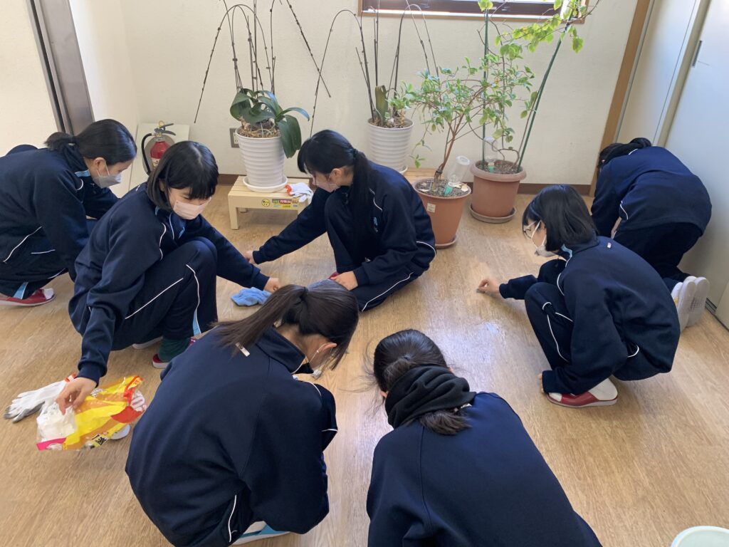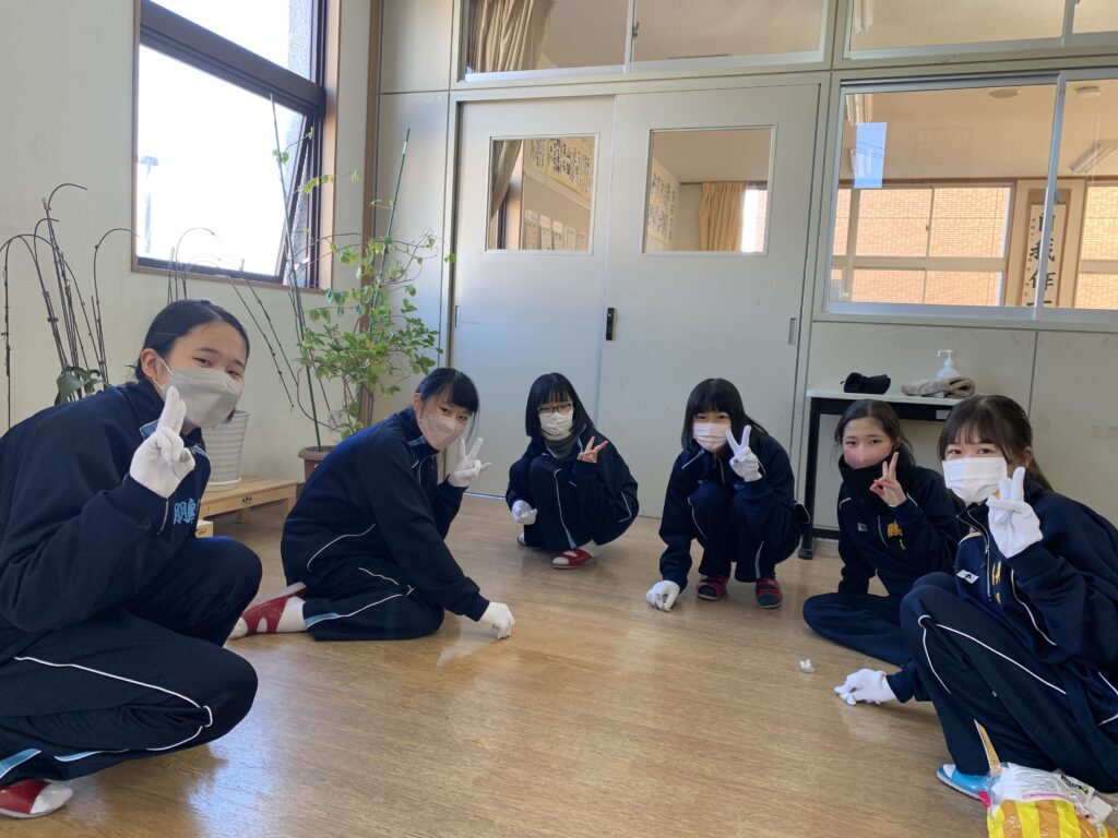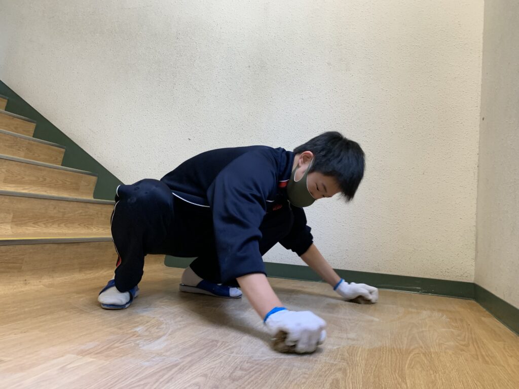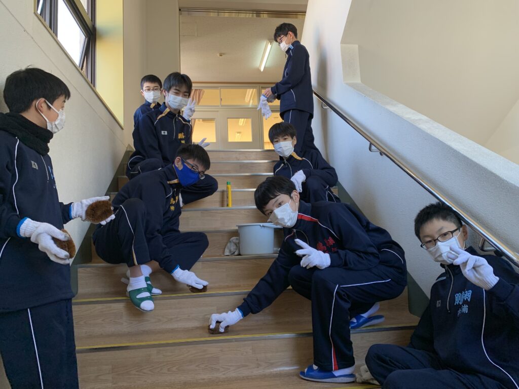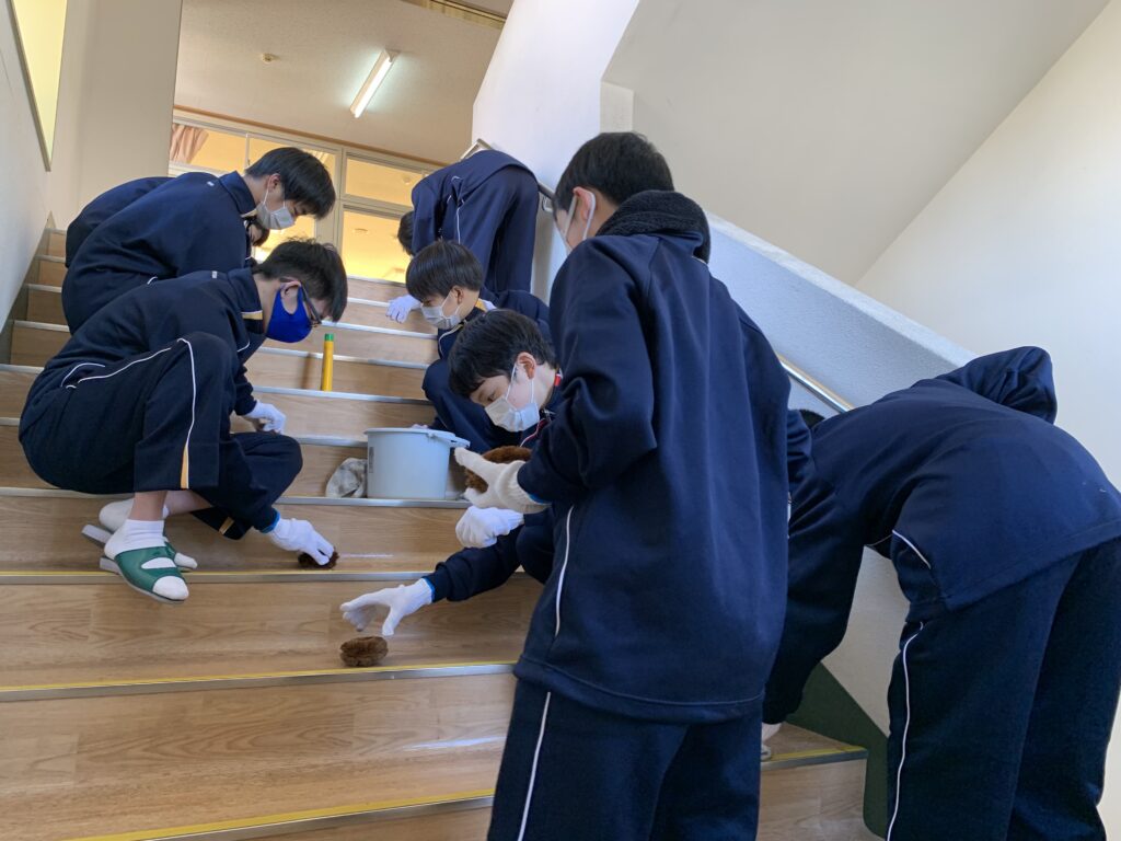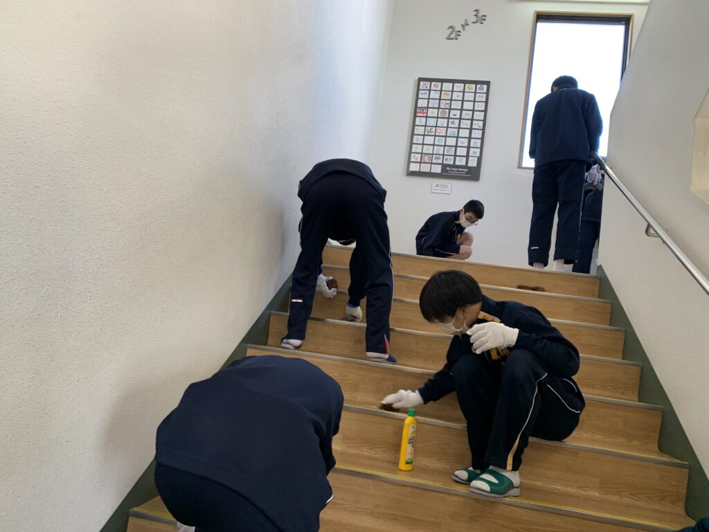 植木の間や、自販機の下など隅々までゴミをみつけて拾っていました。校内の廊下階段も、たわし等で一生懸命磨き見違えるほどきれいになりました。風がありとても寒い中での清掃ボランティアでしたが、とても楽しく活動していました。普段お世話になっている校舎や地域がきれいになると気持ちがいいですね!