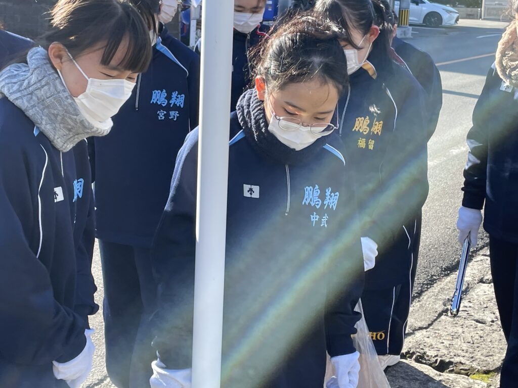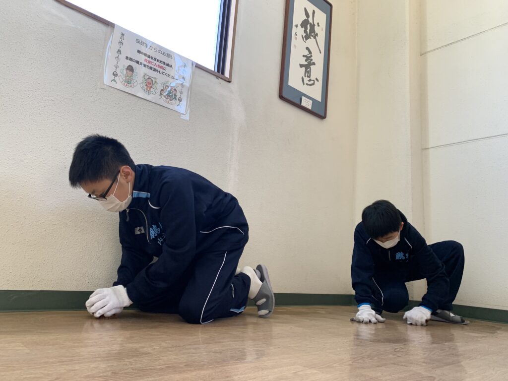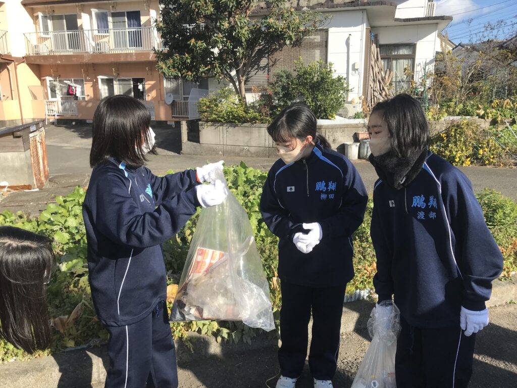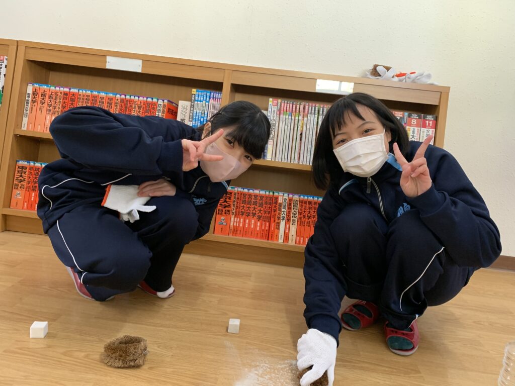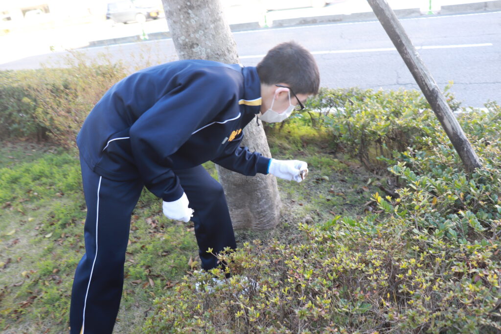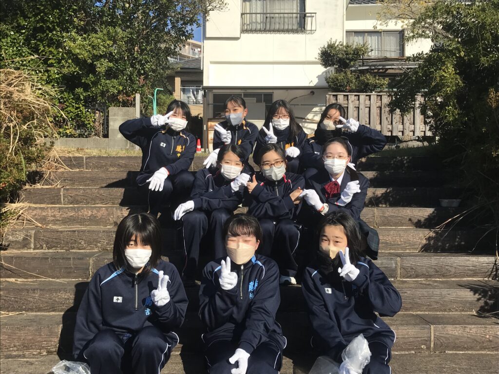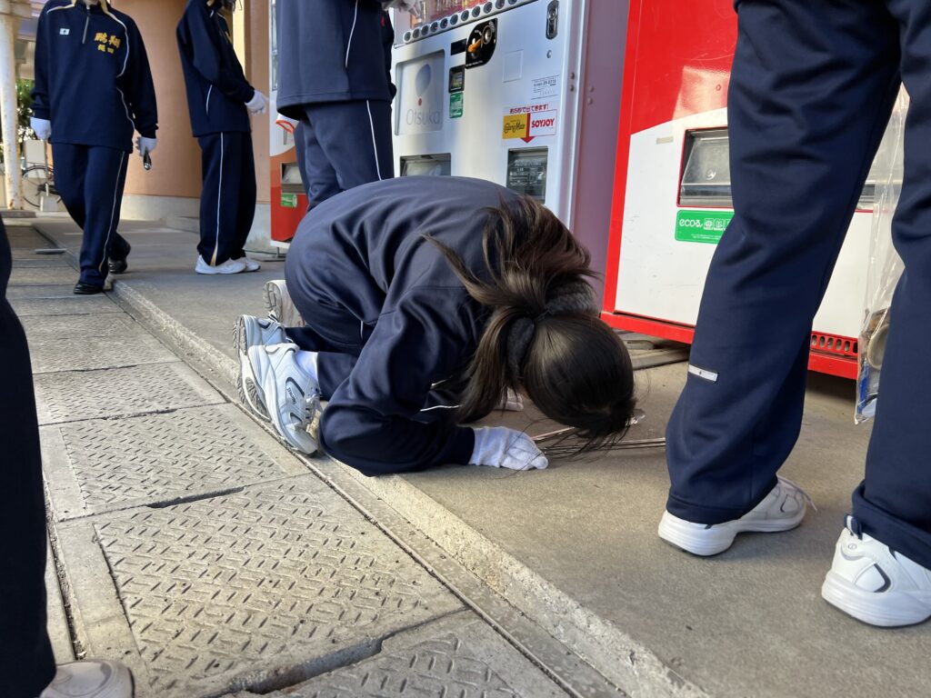 植木の間や、自販機の下など隅々までゴミをみつけて拾っていました。校内の廊下階段も、たわし等で一生懸命磨き見違えるほどきれいになりました。風がありとても寒い中での清掃ボランティアでしたが、とても楽しく活動していました。普段お世話になっている校舎や地域がきれいになると気持ちがいいですね!