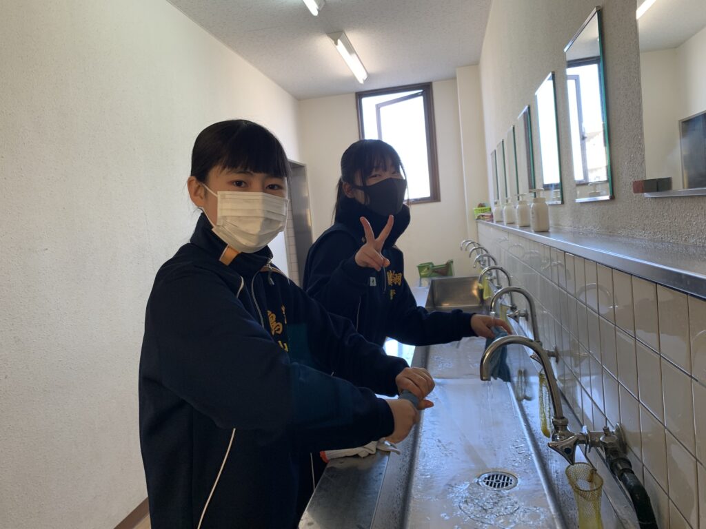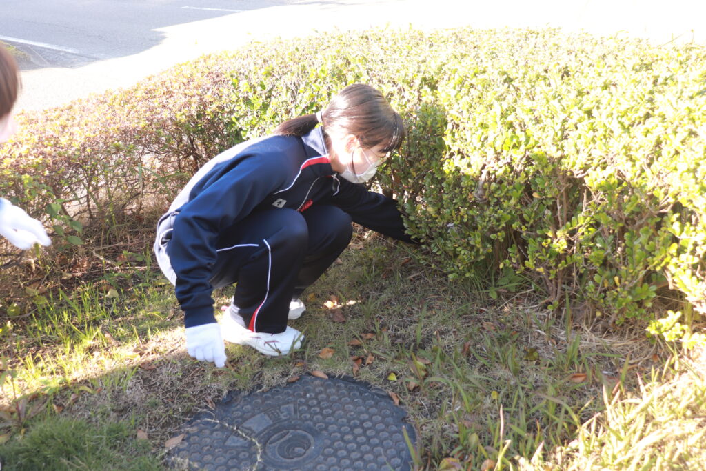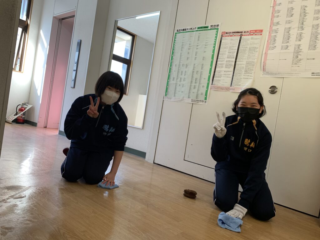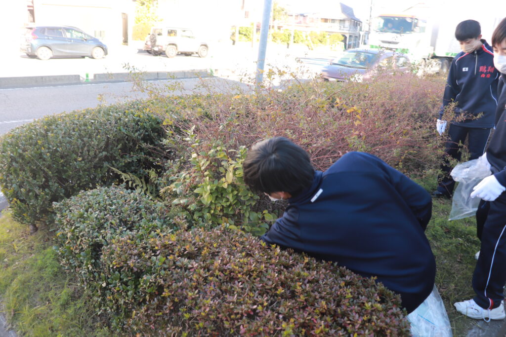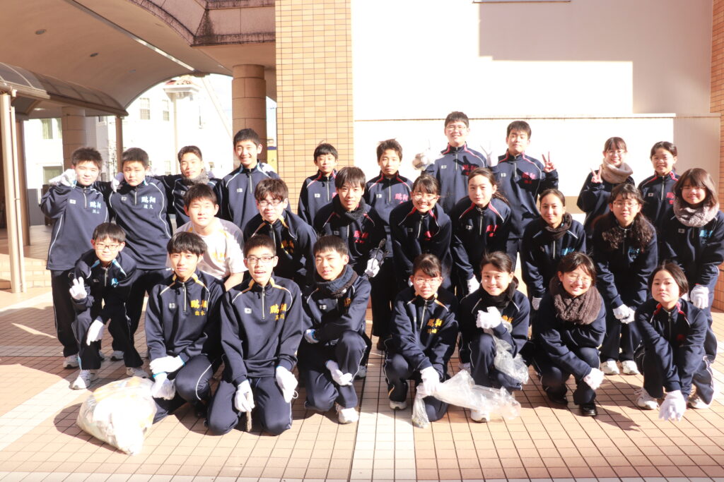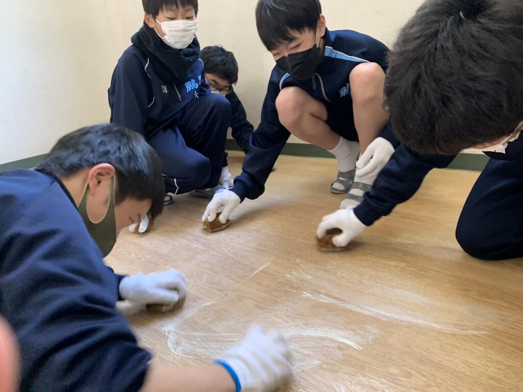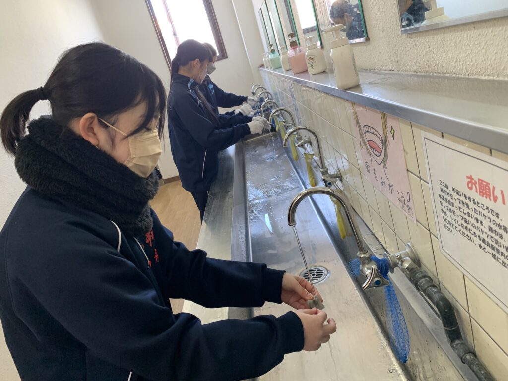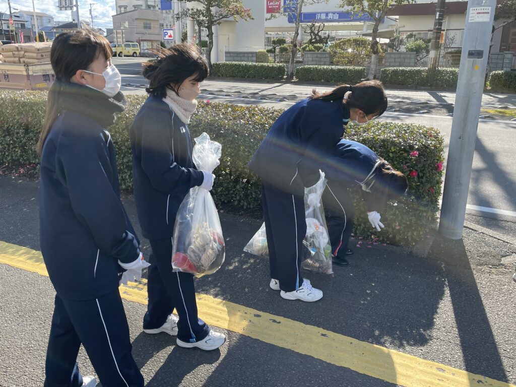 植木の間や、自販機の下など隅々までゴミをみつけて拾っていました。校内の廊下階段も、たわし等で一生懸命磨き見違えるほどきれいになりました。風がありとても寒い中での清掃ボランティアでしたが、とても楽しく活動していました。普段お世話になっている校舎や地域がきれいになると気持ちがいいですね!