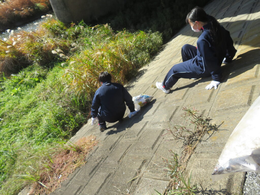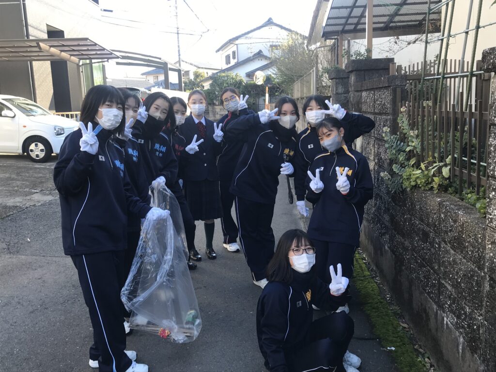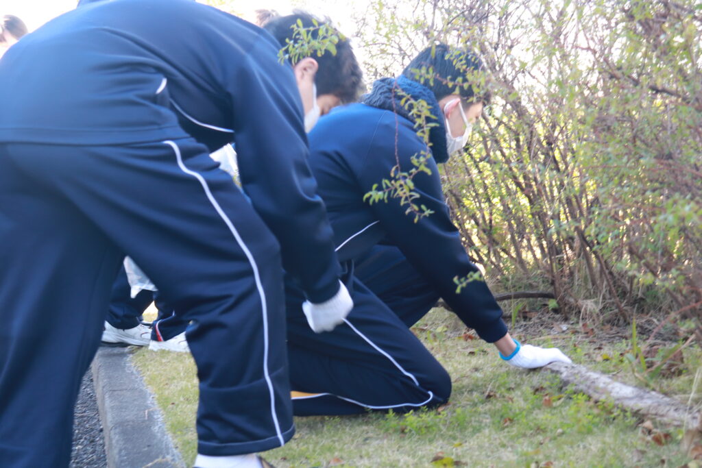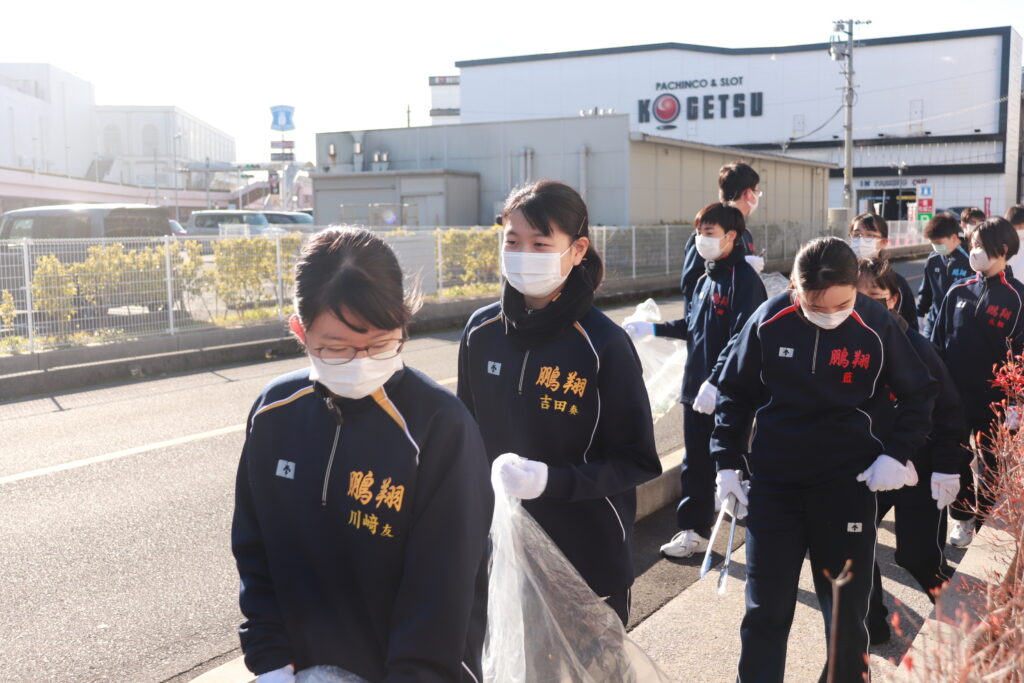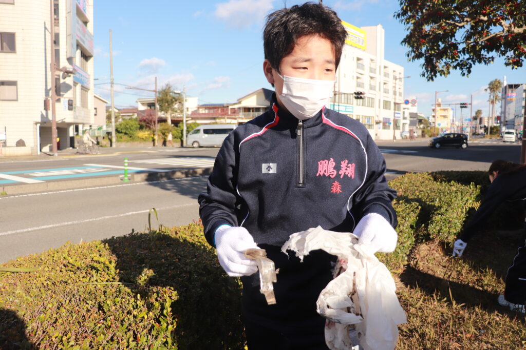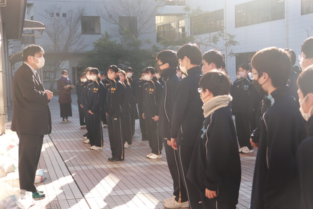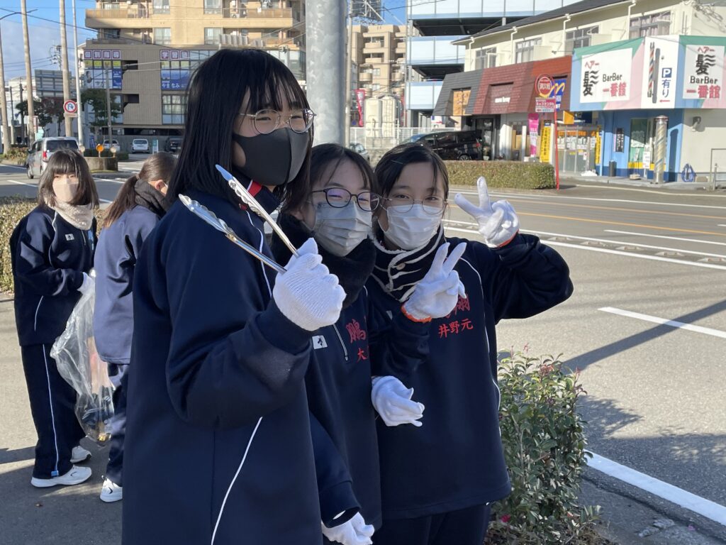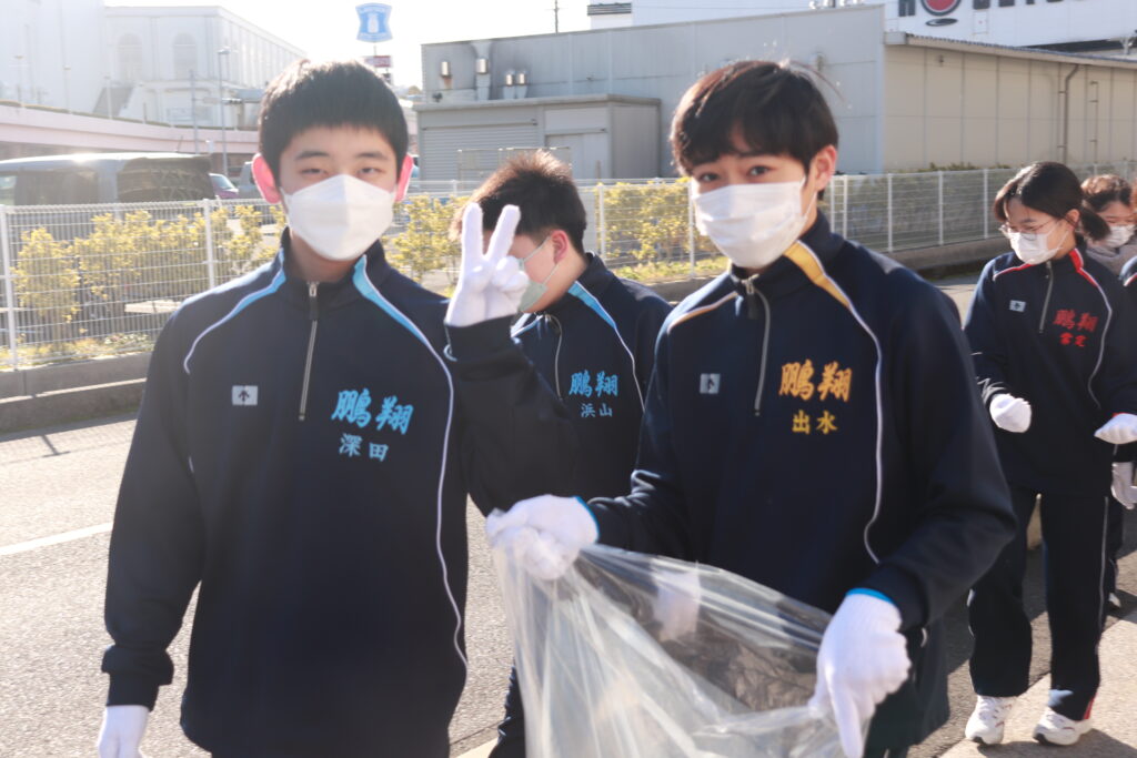 植木の間や、自販機の下など隅々までゴミをみつけて拾っていました。校内の廊下階段も、たわし等で一生懸命磨き見違えるほどきれいになりました。風がありとても寒い中での清掃ボランティアでしたが、とても楽しく活動していました。普段お世話になっている校舎や地域がきれいになると気持ちがいいですね!