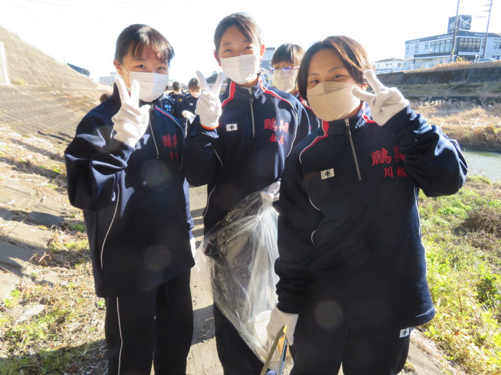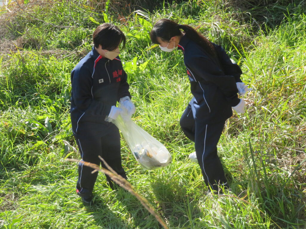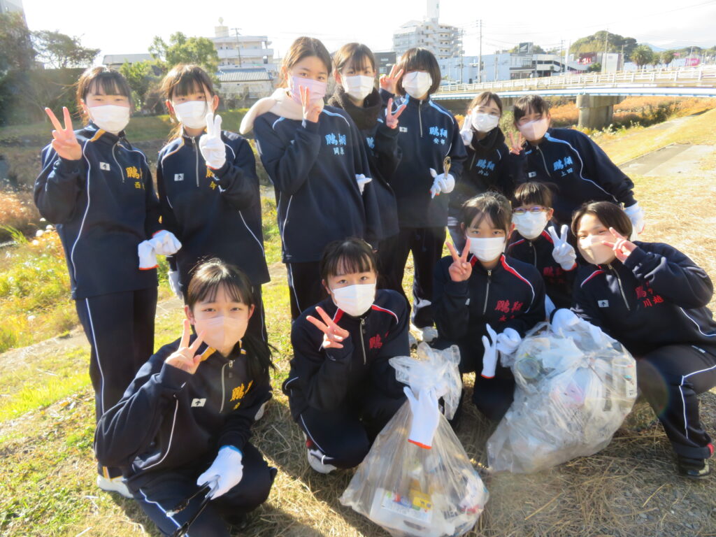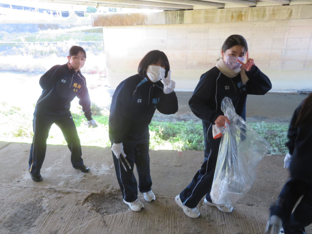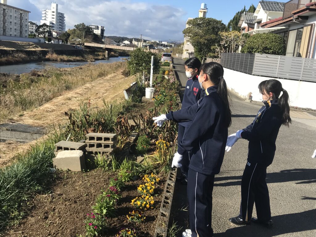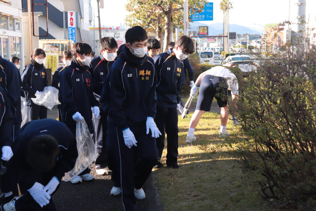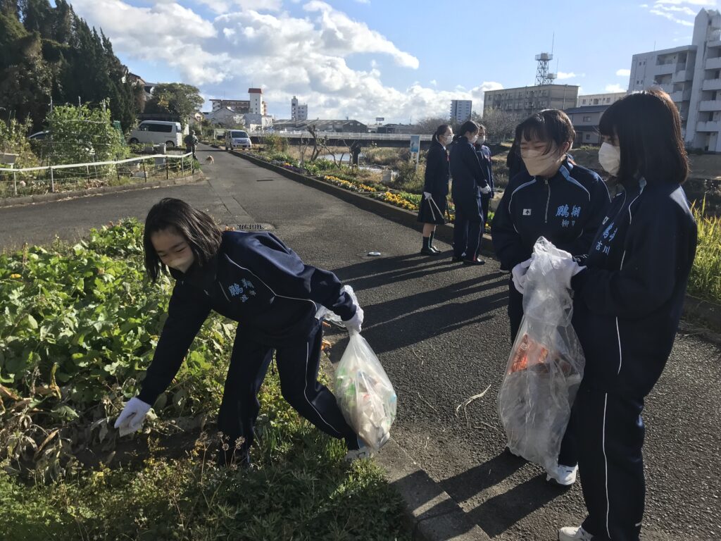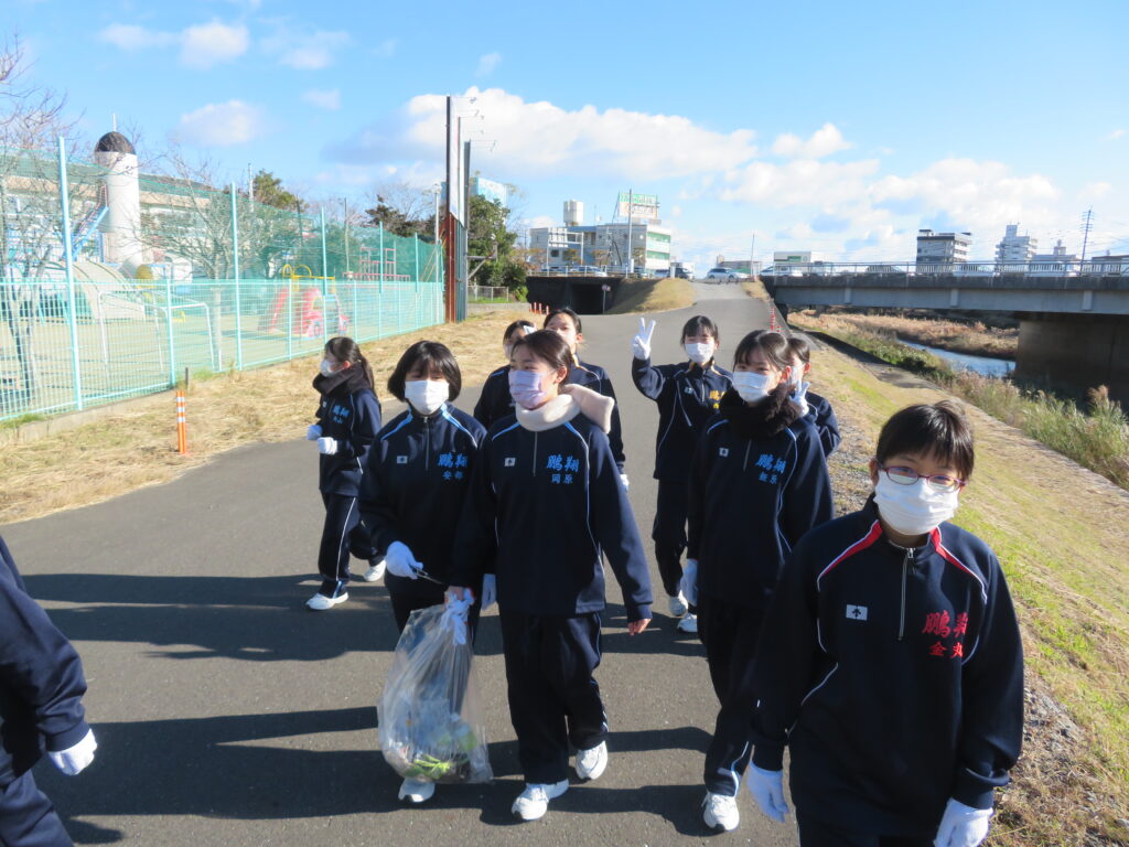 植木の間や、自販機の下など隅々までゴミをみつけて拾っていました。校内の廊下階段も、たわし等で一生懸命磨き見違えるほどきれいになりました。風がありとても寒い中での清掃ボランティアでしたが、とても楽しく活動していました。普段お世話になっている校舎や地域がきれいになると気持ちがいいですね!