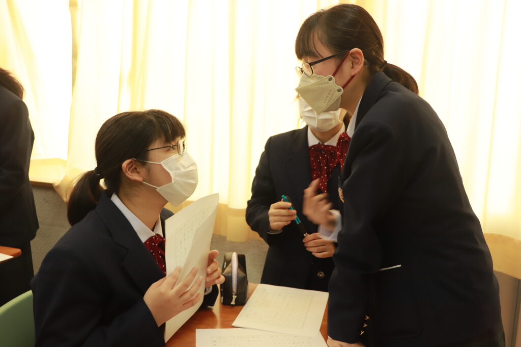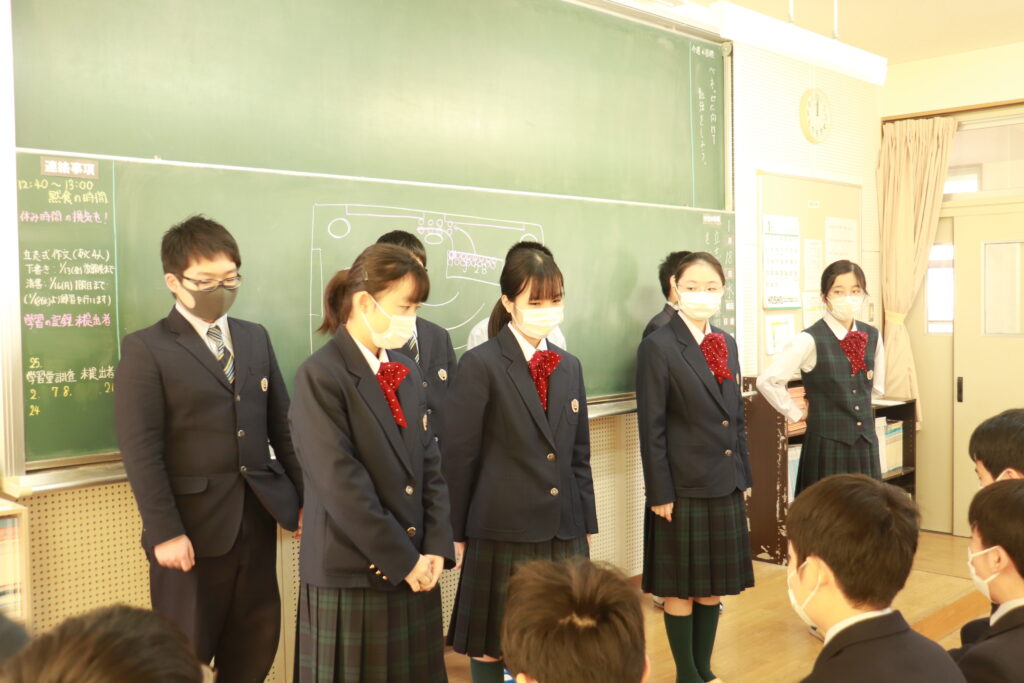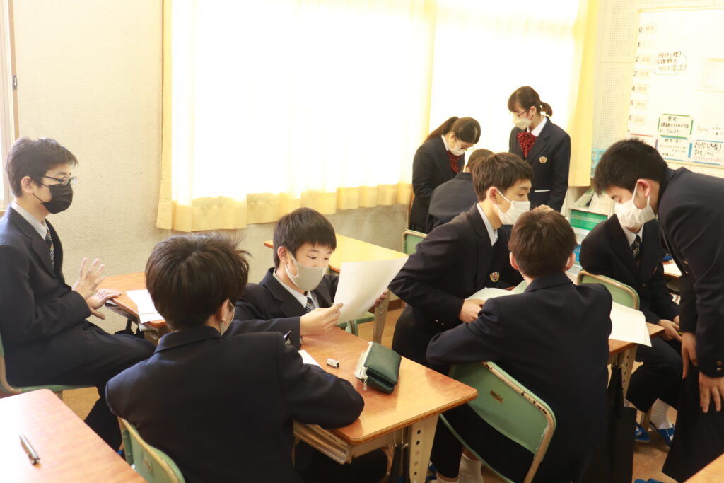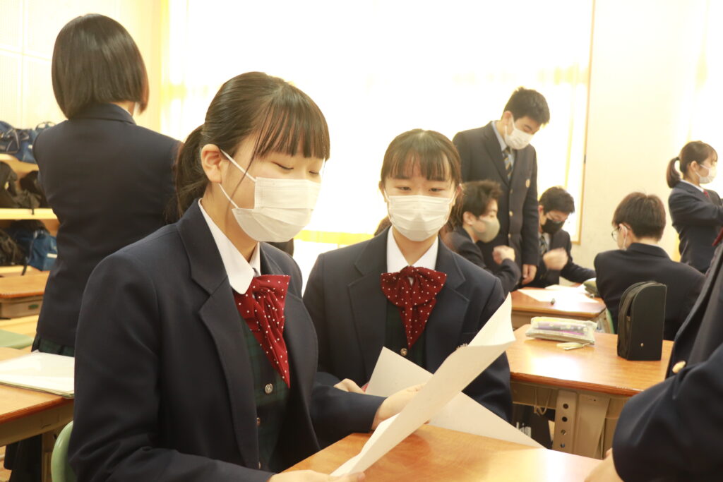 各クラスで当日の流れについて確認を行なったり、友達と意見交換をしながら発表の練習をしたりしていました。来週からは実際に会場で立ち位置の確認を行い、全体の前で読むリハーサル等も行っていきます。良い形で当日発表できるように残された時間の中で精一杯練習していきましょう。