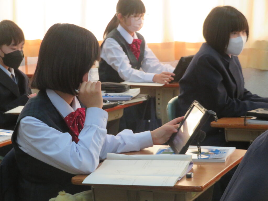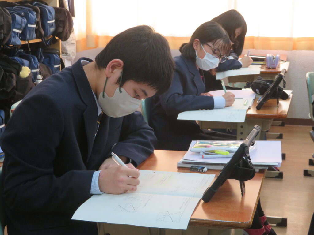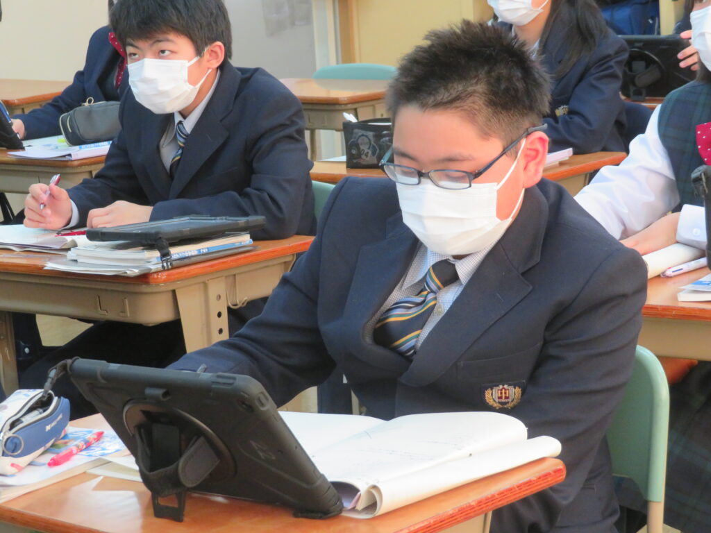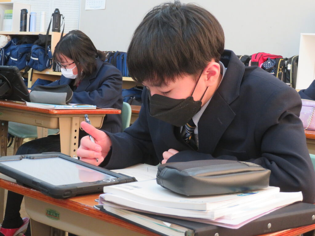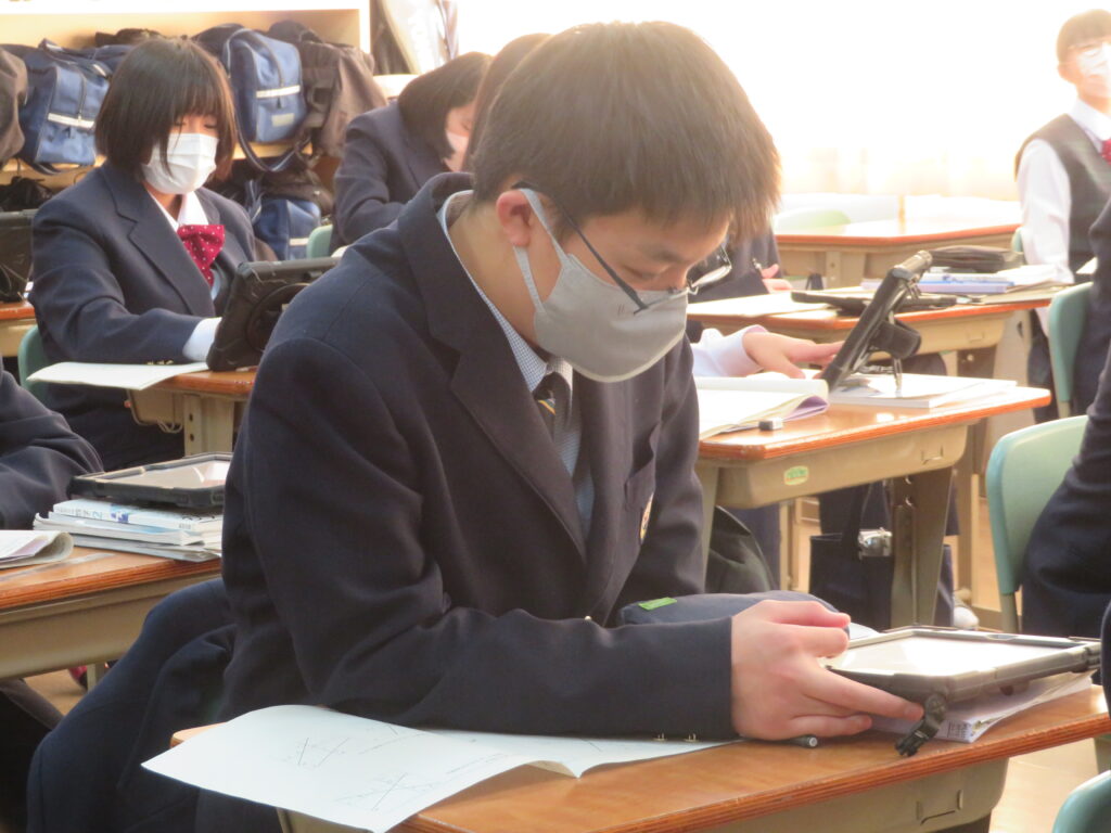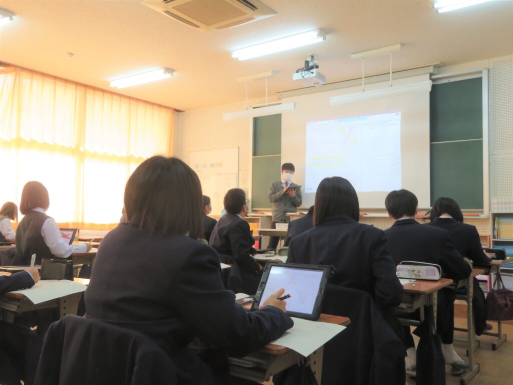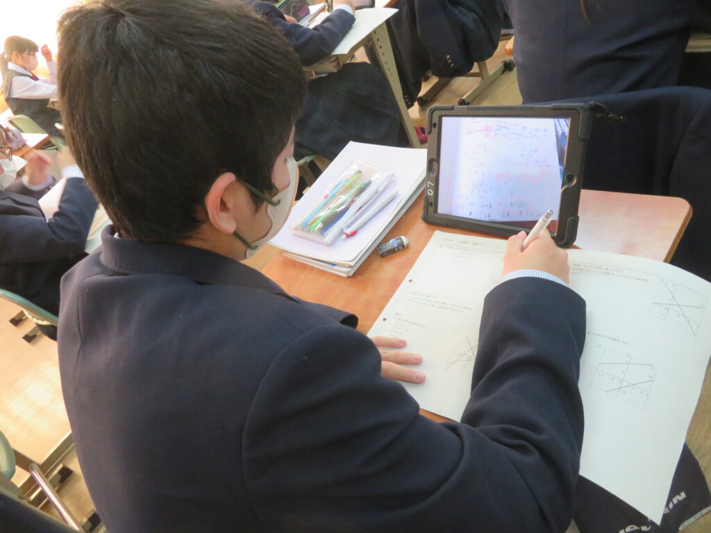 標準クラスでは、タブレットを使用していました。タブレットを使用することで、黒板に書く模範解答だけではなく、生徒たちの回答を共有し、いろんな気づきがあります。