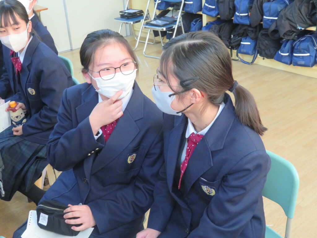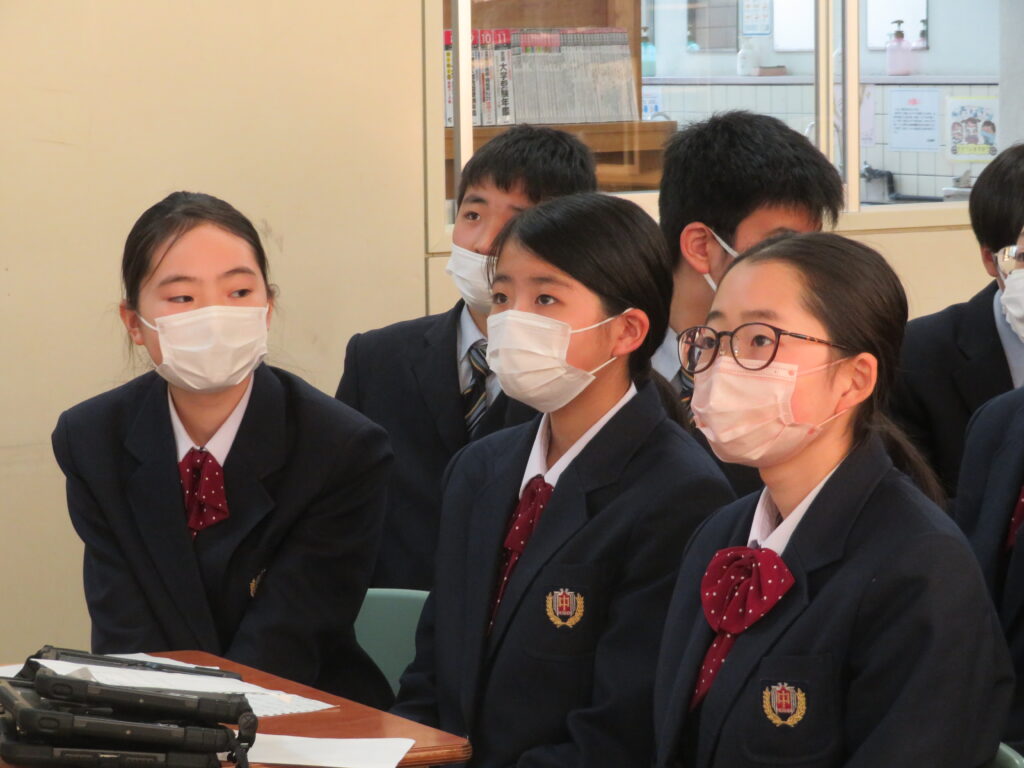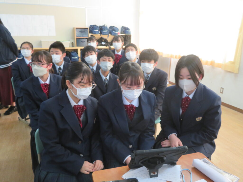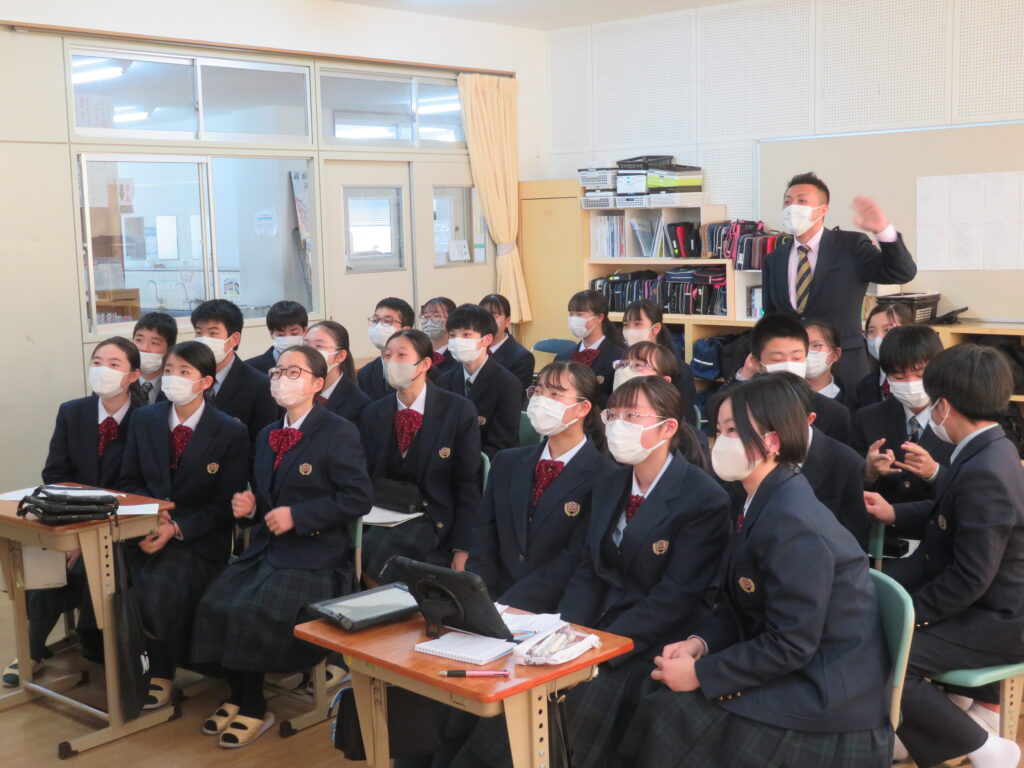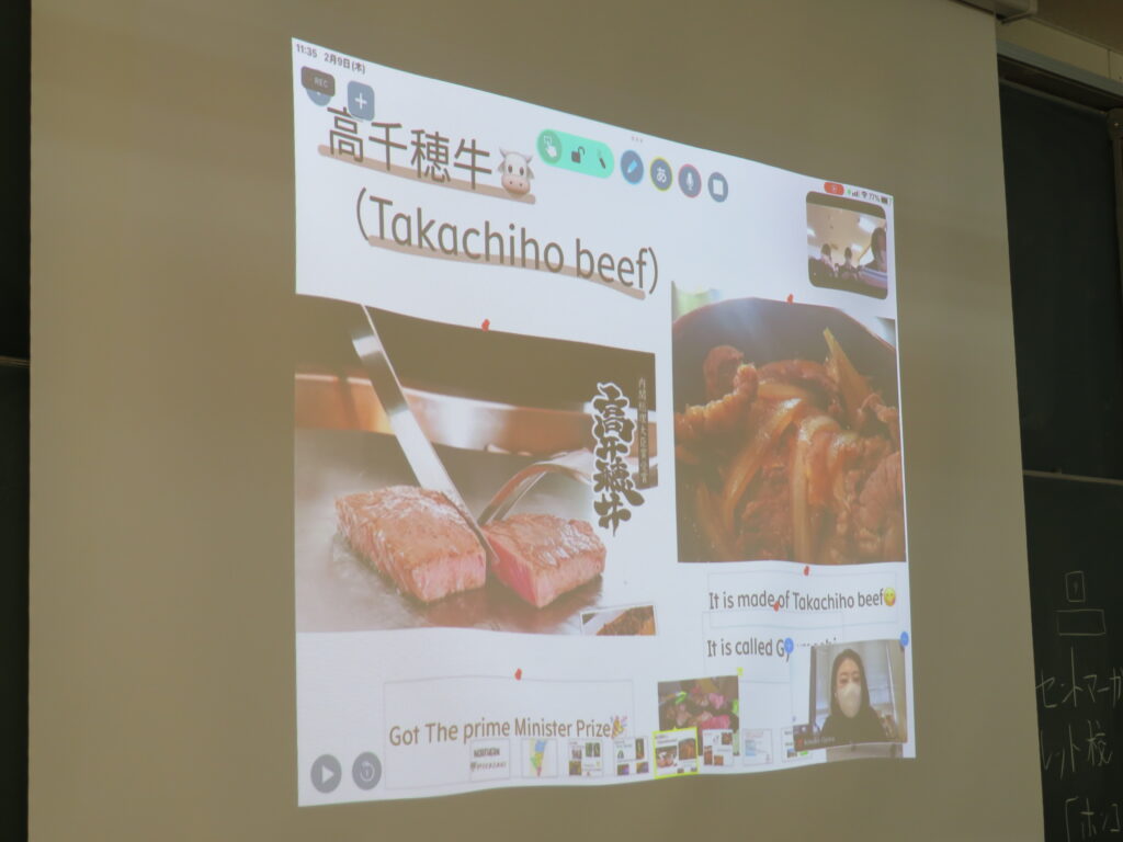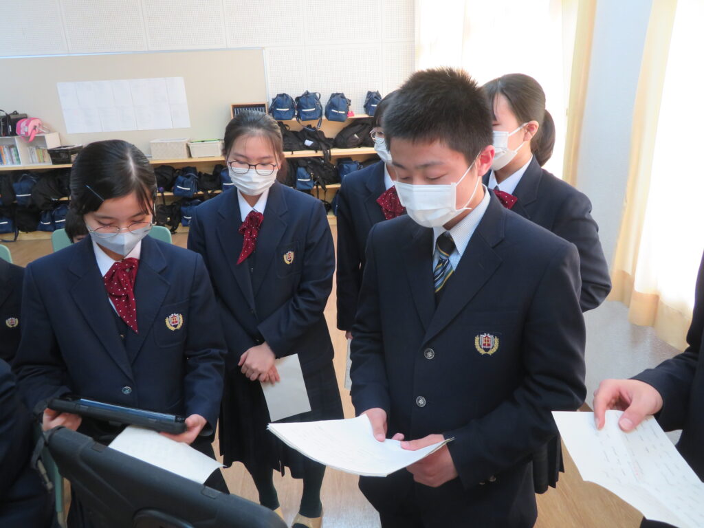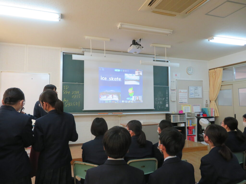 交流会では、4グループに分かれて、 中学生の視線で 宮崎県の観光資源を調査・学習した内容を英語で発表しました。ズームを用いた交流は初めての試みでしたが、見事、自分の意見を主張することができました。 最後の質疑応答では、画面を通してではありましたが、香港の学生と英語でやりとりが出来ました。次年度3年生では、いよいよカナダ・バンクーバーへの修学旅行があります。今日、それぞれが感じた英語の大切さ・必要さを忘れず、これからも英語を学習し続けて欲しいと思います。
