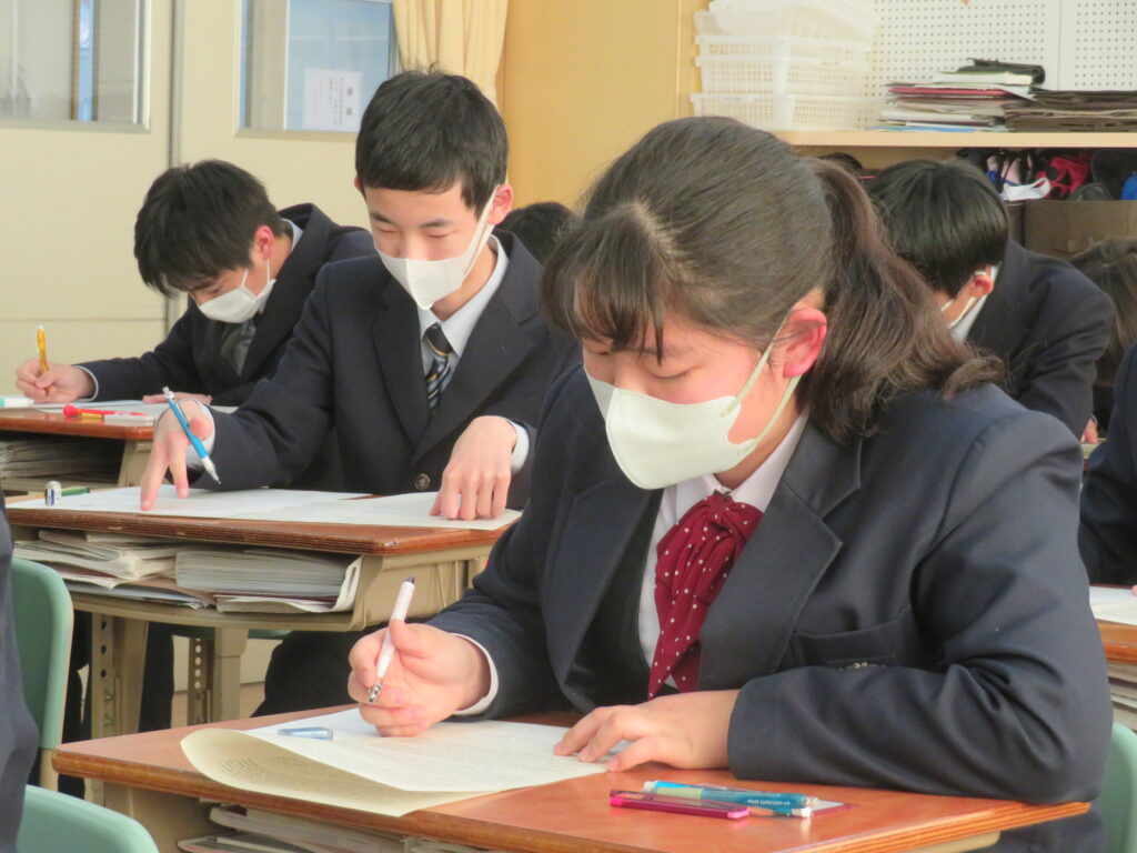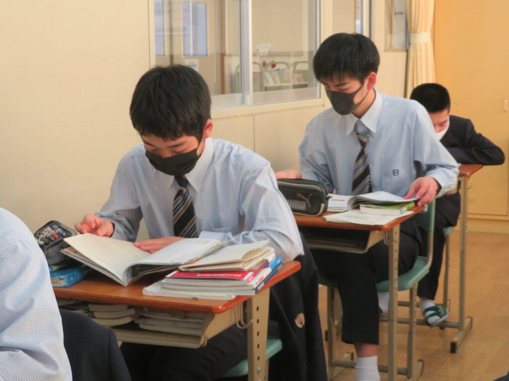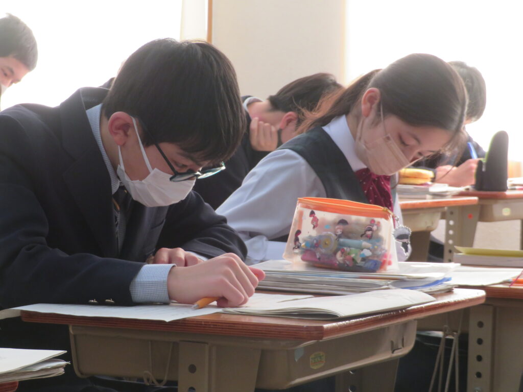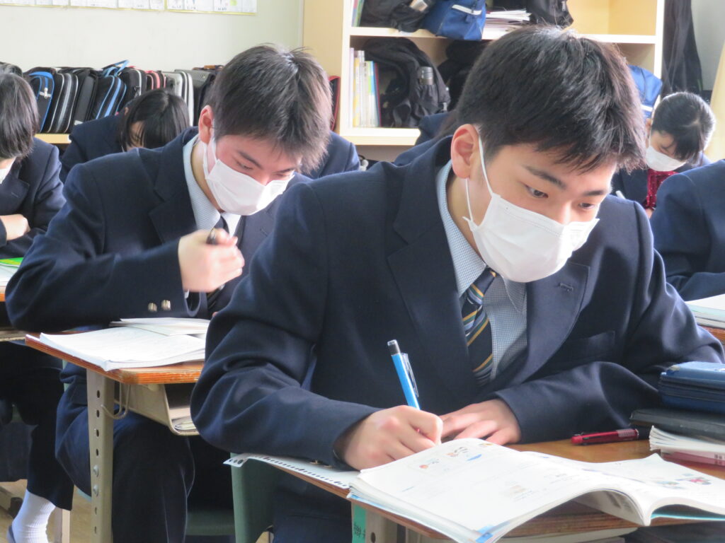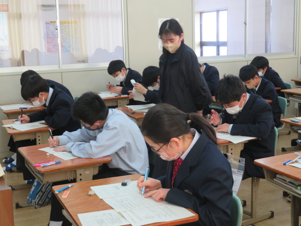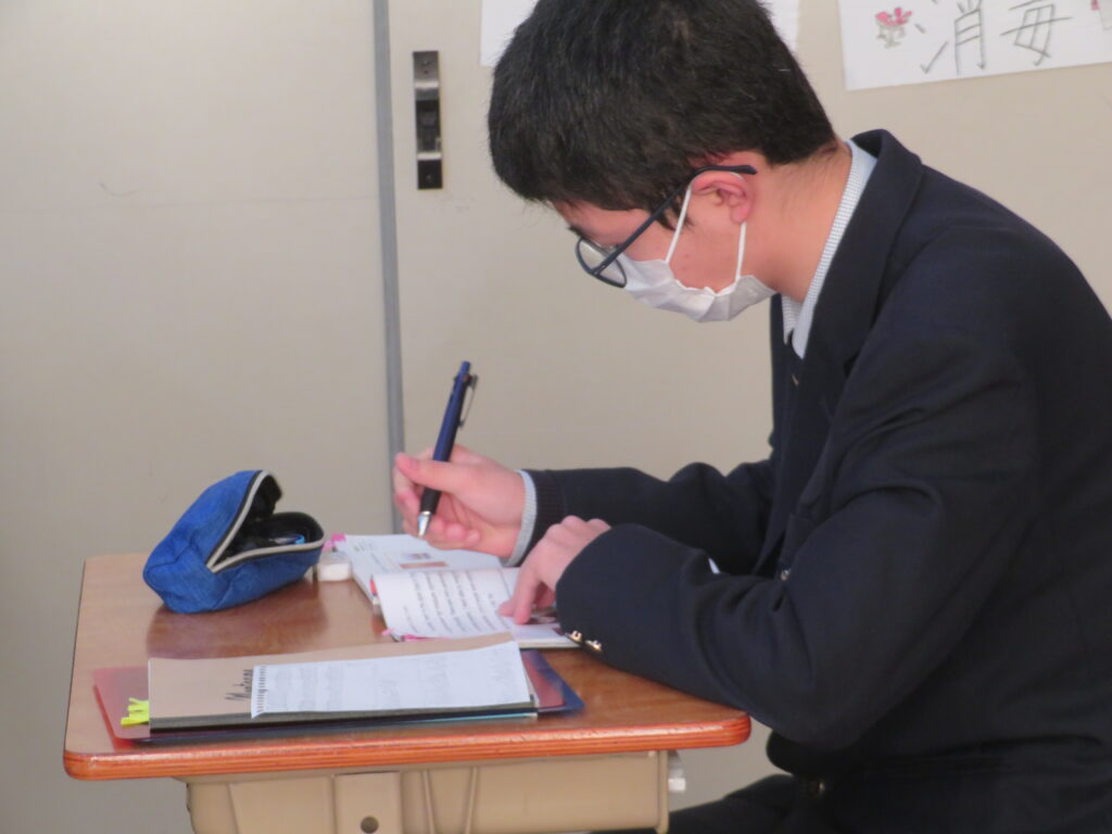 1限目の様子です。1限目は、全学年自学自習の時間になります。これまで学習した振り返りが出来る貴重な1時間です。生徒たちは、自分でまとめたノートや問題集を机いっぱいに広げ、黙々と読んだり、解き直しをしたり、真剣な眼差しで最終確認をしていました。