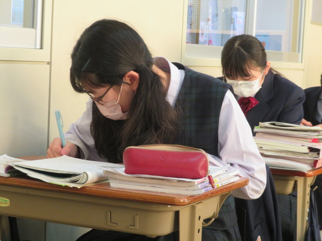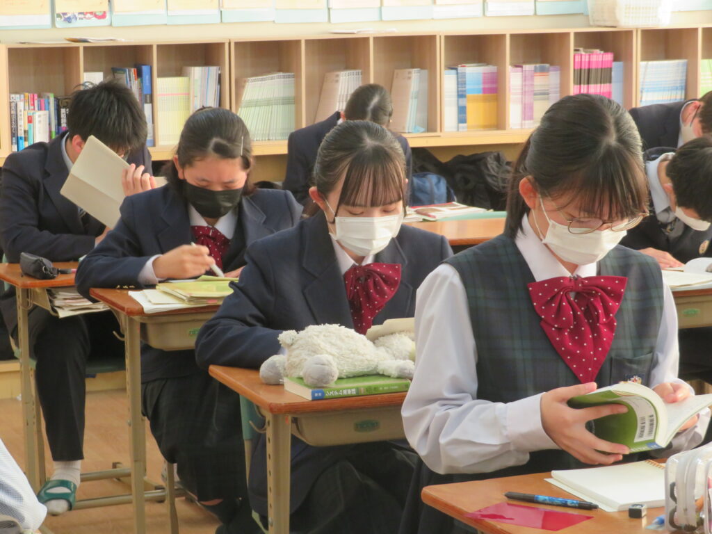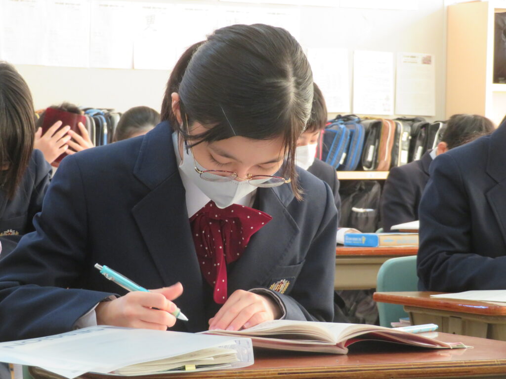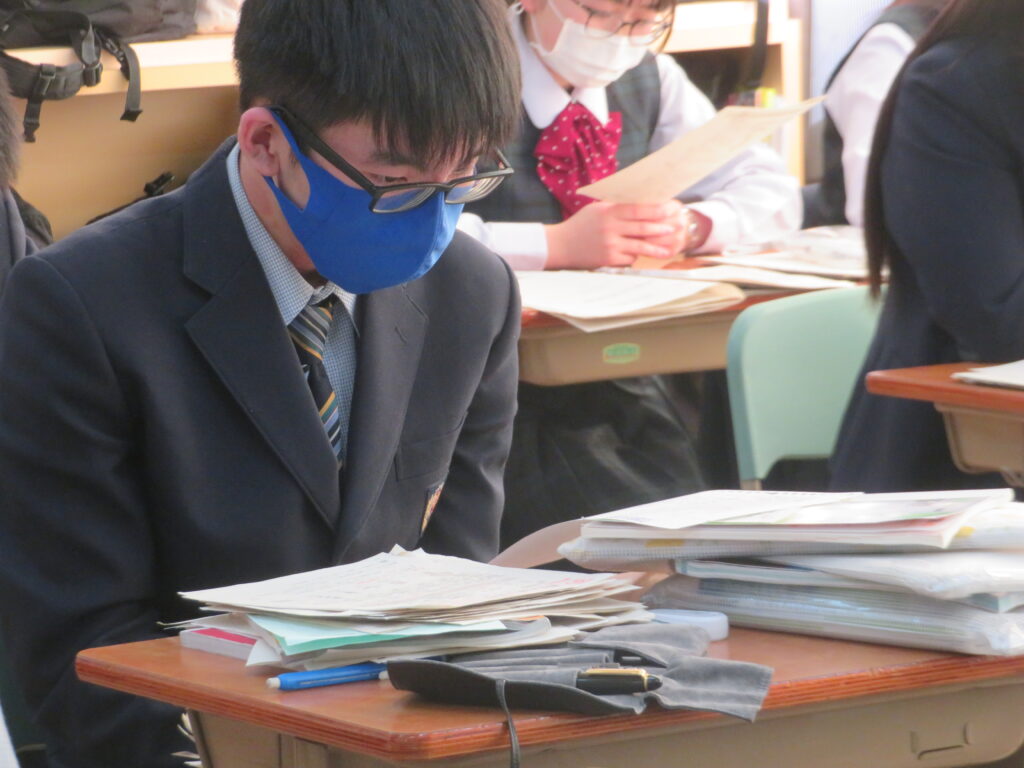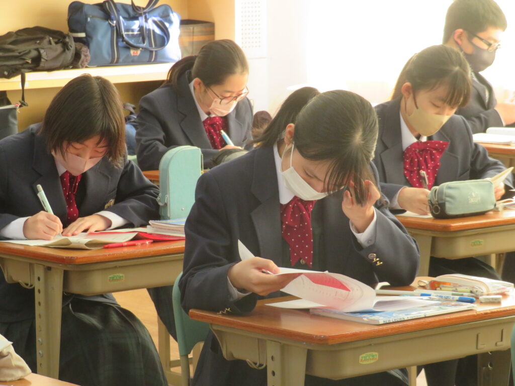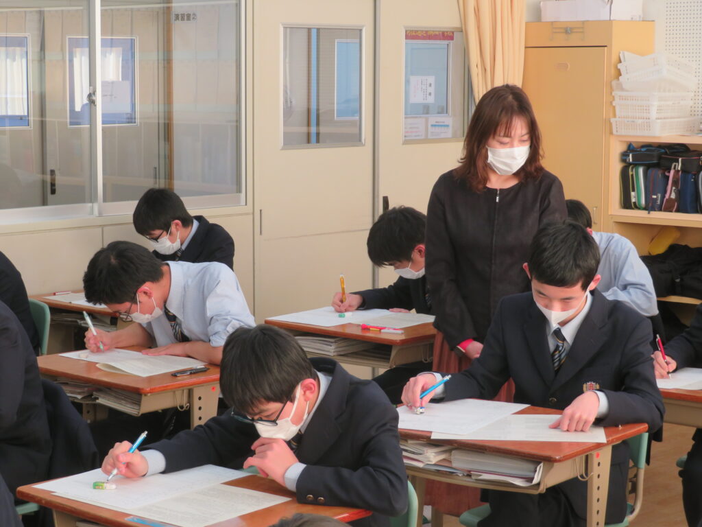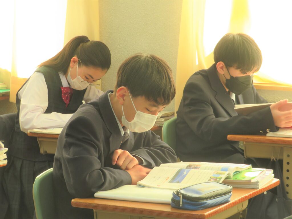 1限目の様子です。1限目は、全学年自学自習の時間になります。これまで学習した振り返りが出来る貴重な1時間です。生徒たちは、自分でまとめたノートや問題集を机いっぱいに広げ、黙々と読んだり、解き直しをしたり、真剣な眼差しで最終確認をしていました。