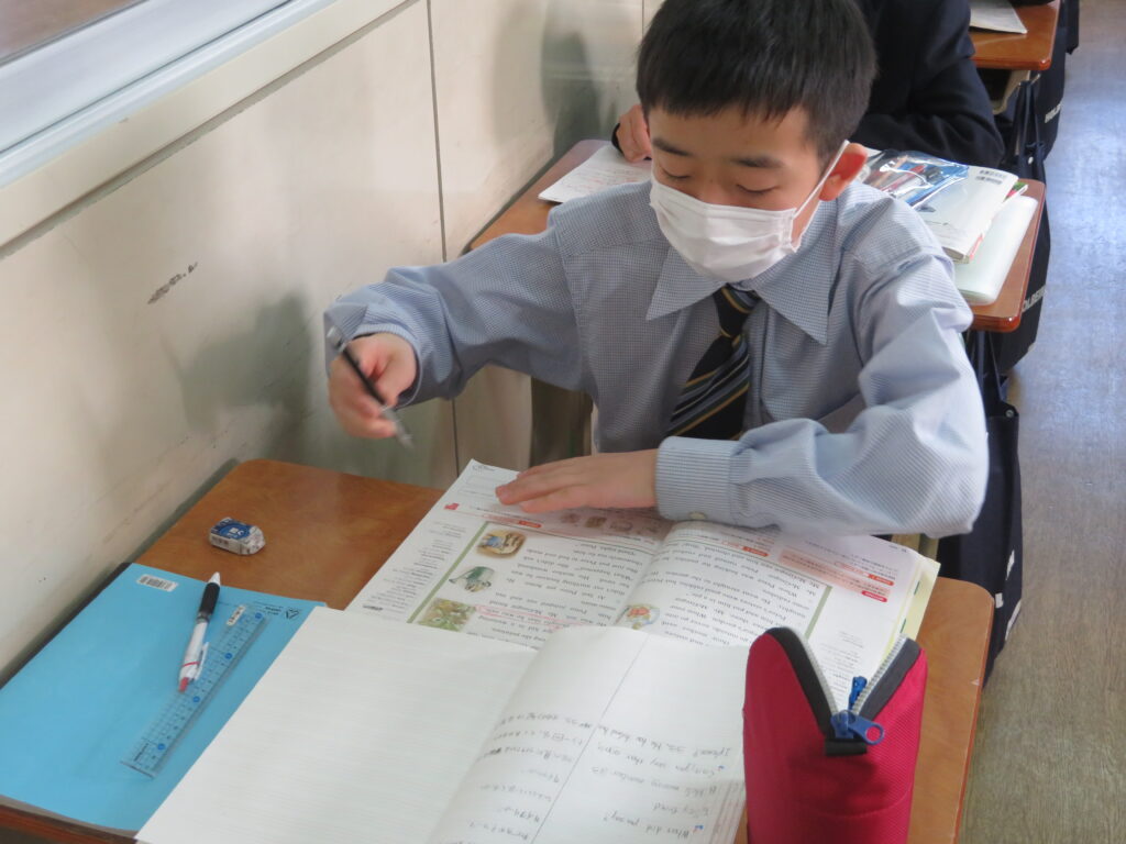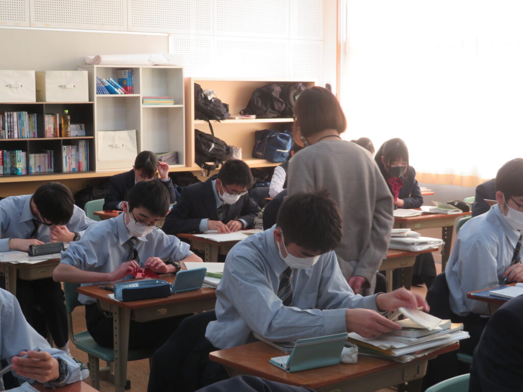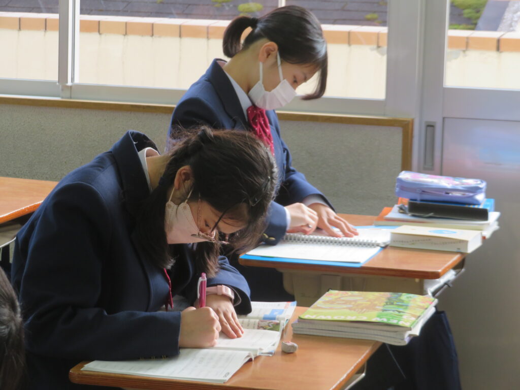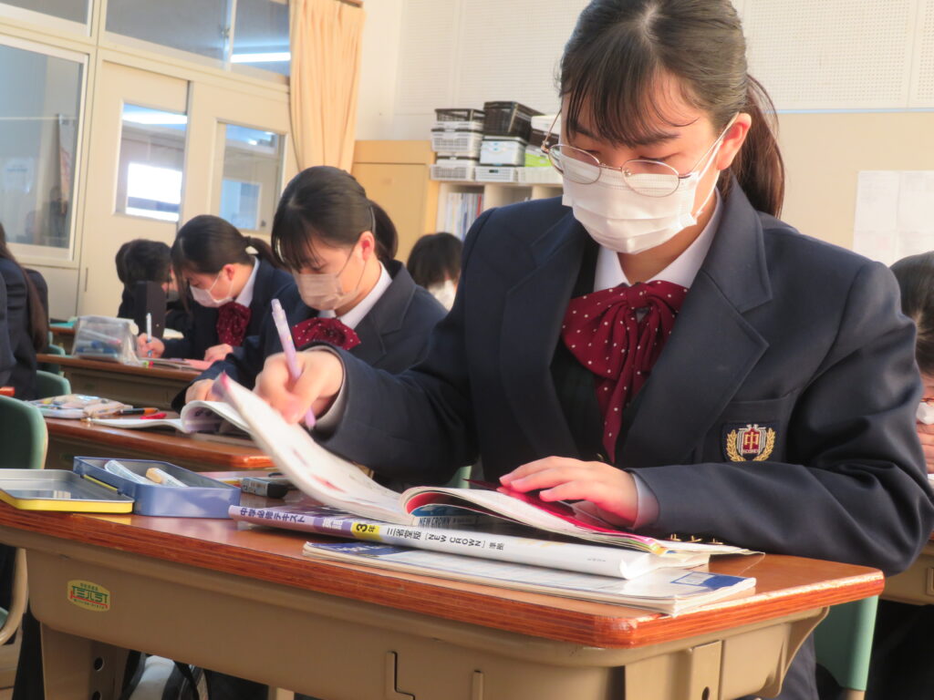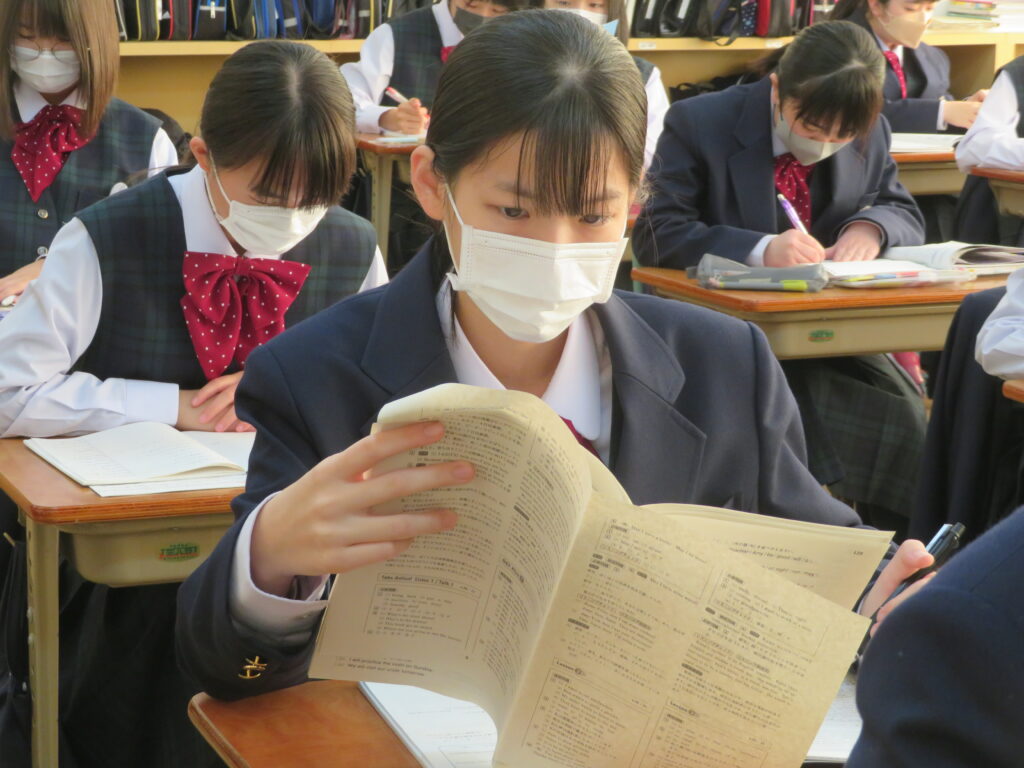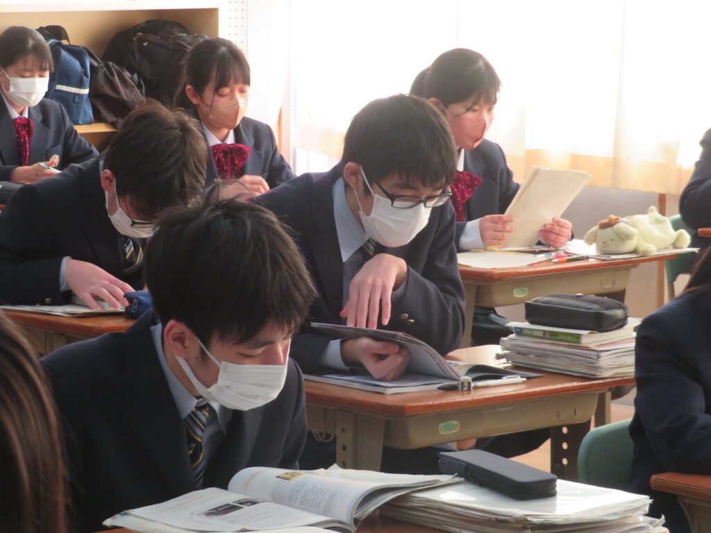 1限目の様子です。1限目は、全学年自学自習の時間になります。これまで学習した振り返りが出来る貴重な1時間です。生徒たちは、自分でまとめたノートや問題集を机いっぱいに広げ、黙々と読んだり、解き直しをしたり、真剣な眼差しで最終確認をしていました。