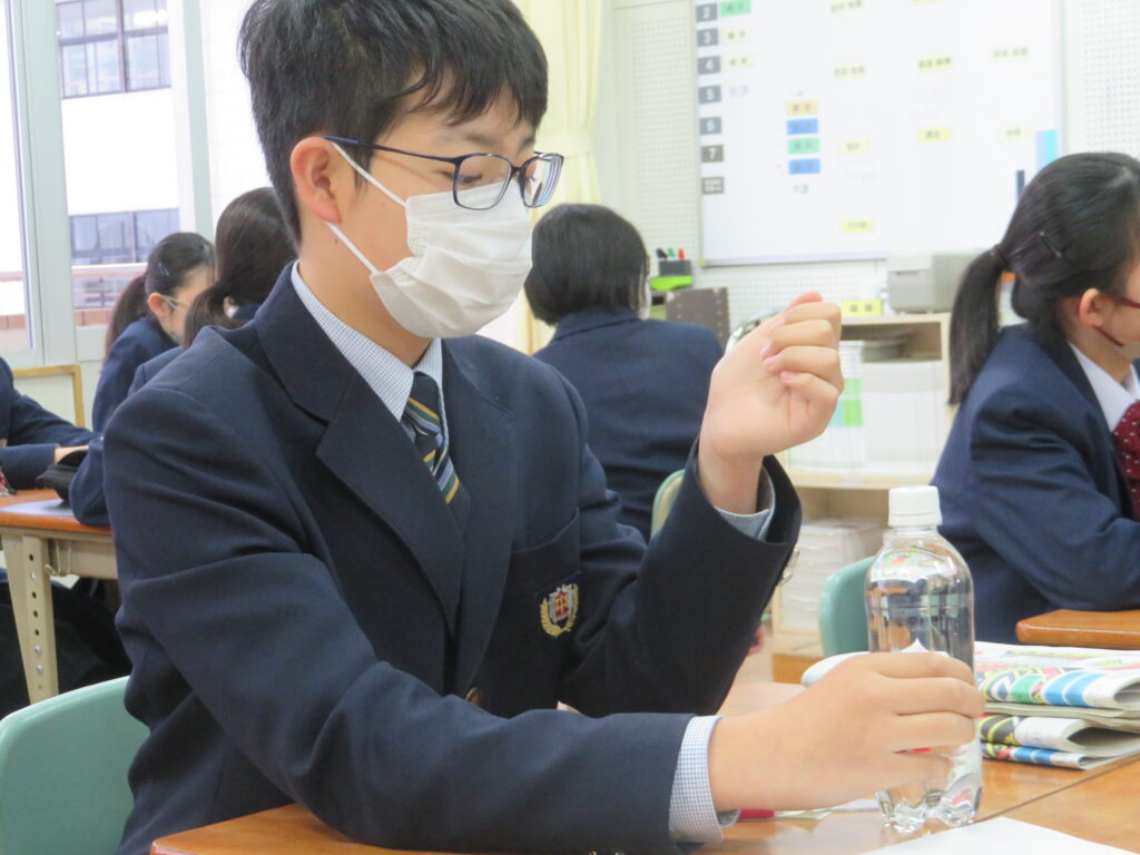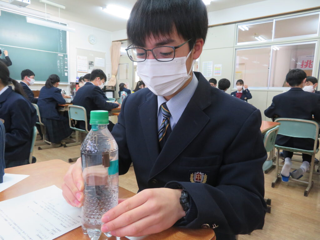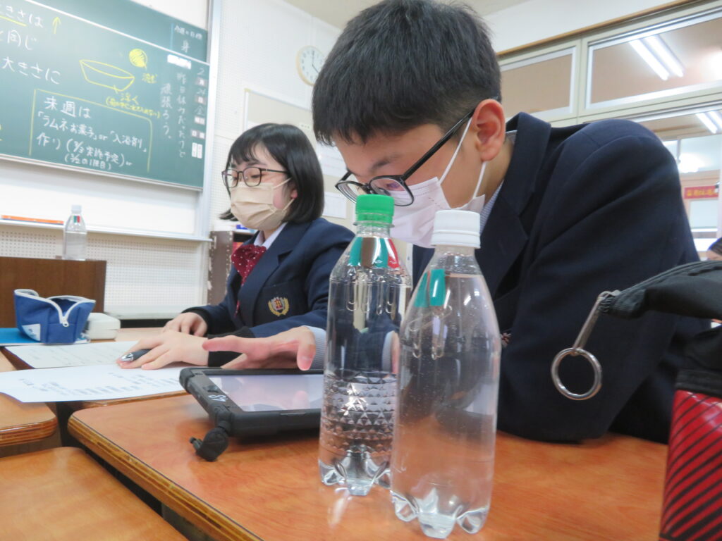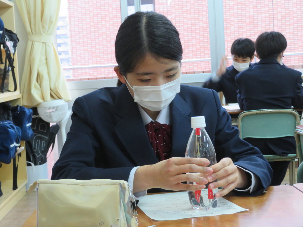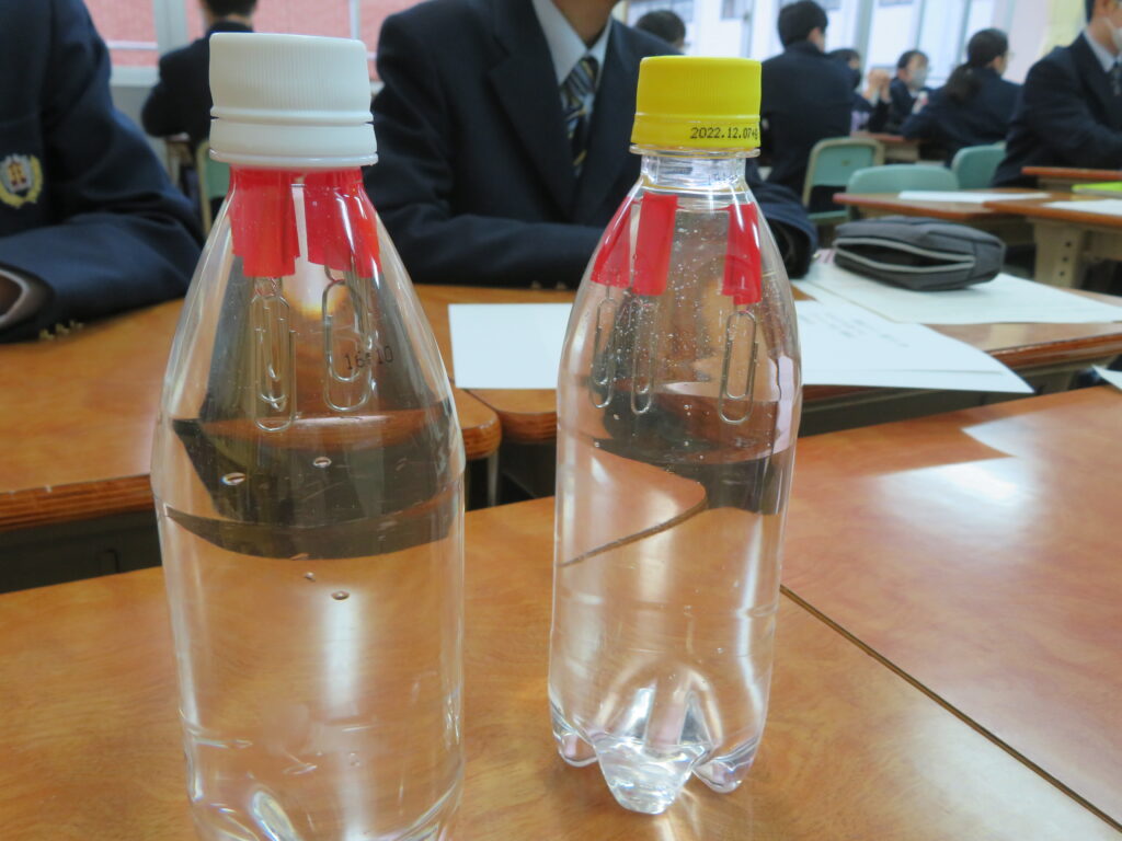 本日J2-B理科の授業で、 炭酸飲料のペットボトルを使用し、浮沈子をつくり、アルキメデスの原理について学習しました。