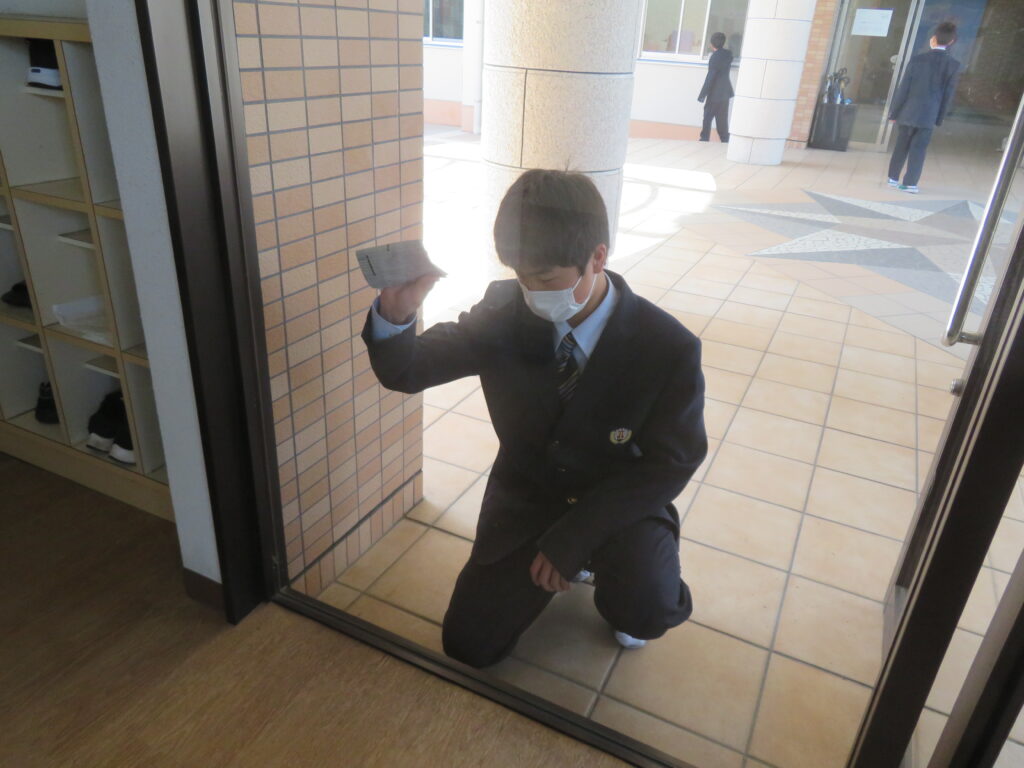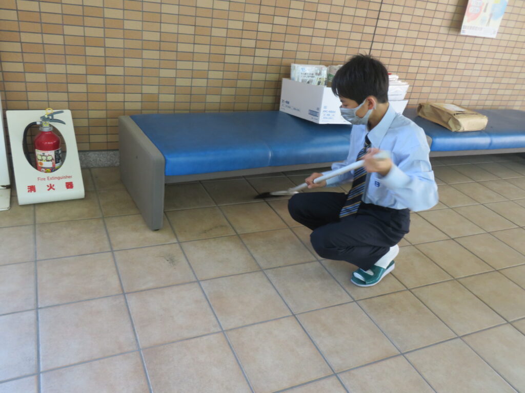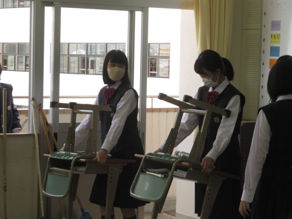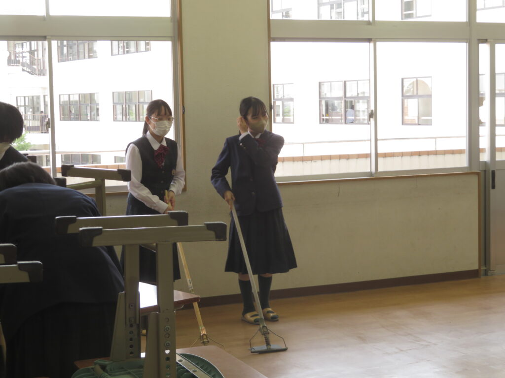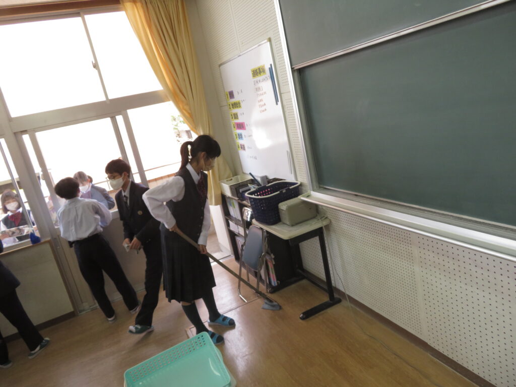 毎日お昼休みのあとは、15分間の清掃を行います。静かに黙々と清掃に取り組みます。 各教室はもちろん、事務室前や中庭、多目的ホール等も中学生が担当しています。 鵬翔生全員で清掃に取り組み、きれいな学び舎で勉学や部活動に全力で励みましょう!